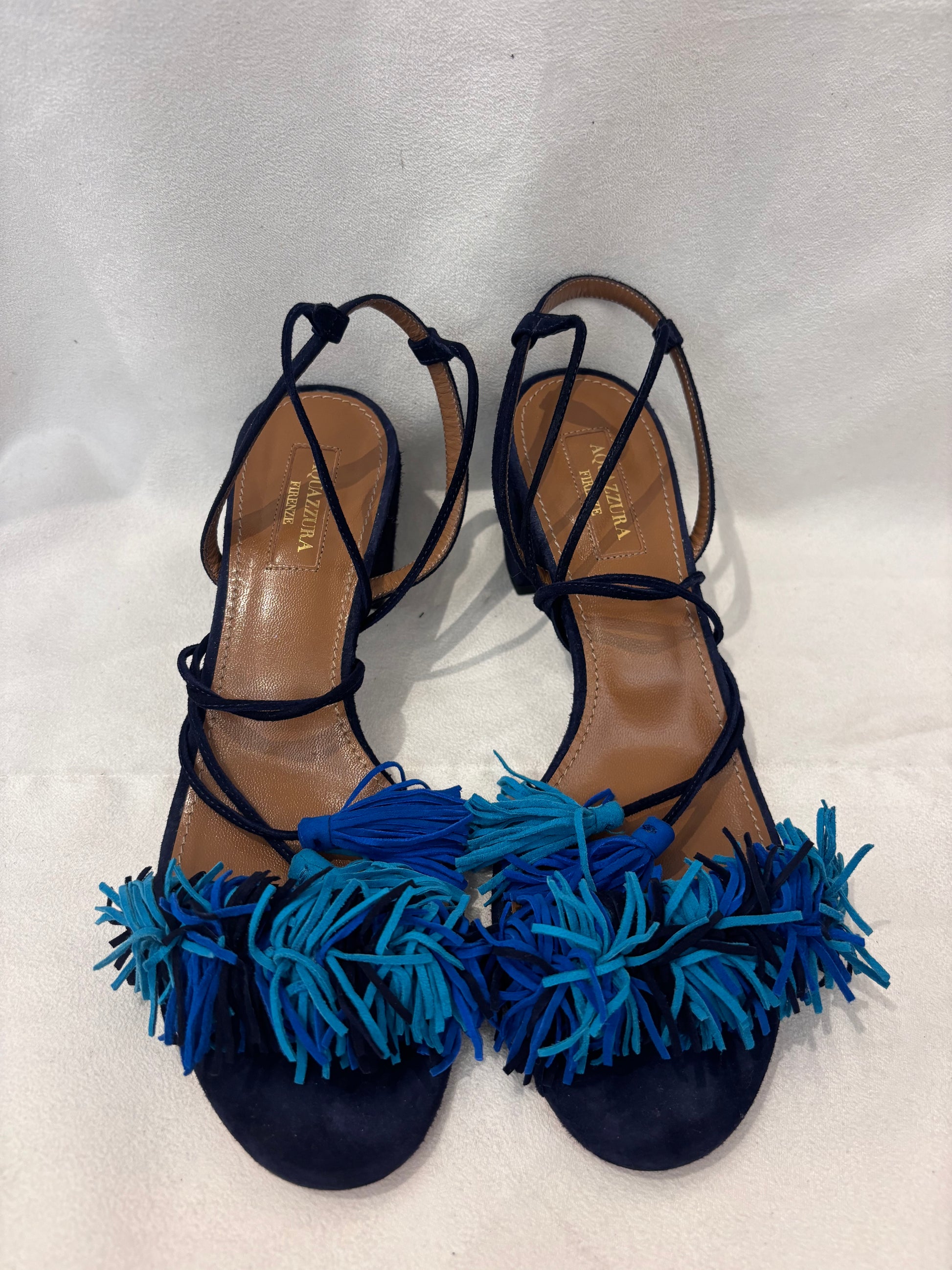 Aquazzura Navy Suede Sandals With Blue Suede Fringe Size 37.5