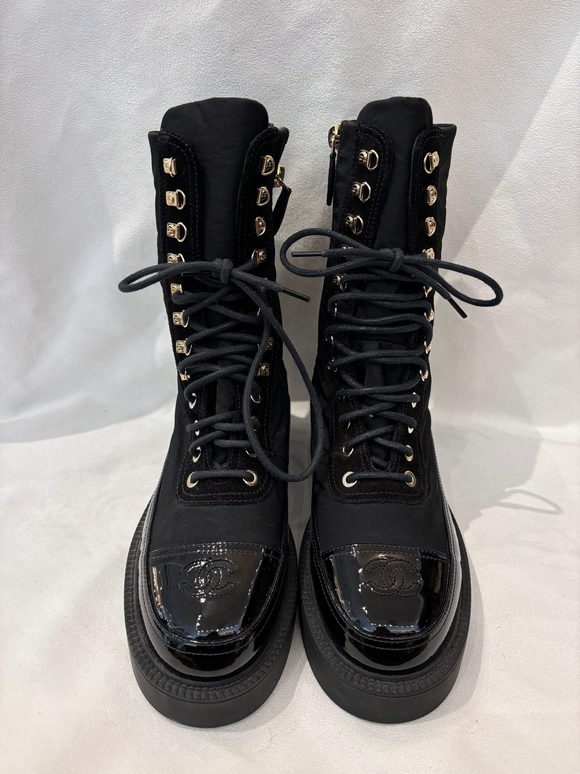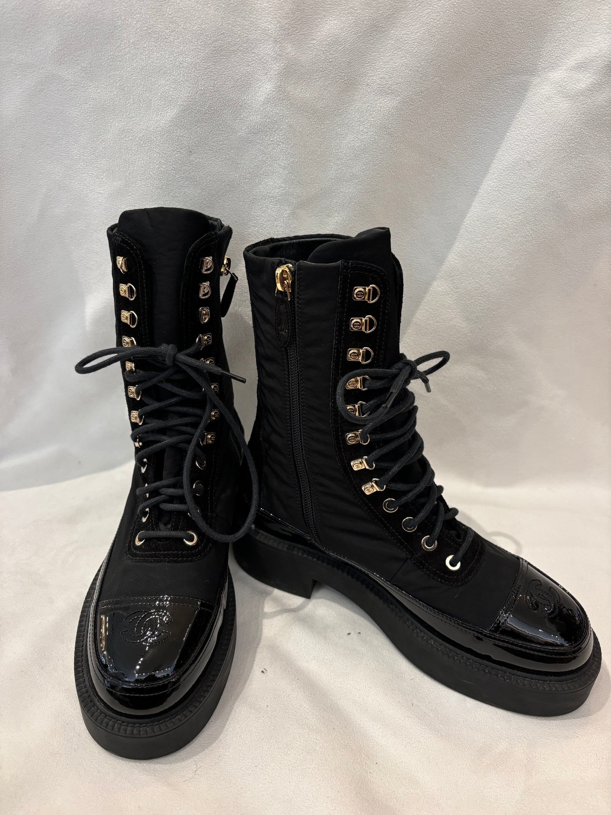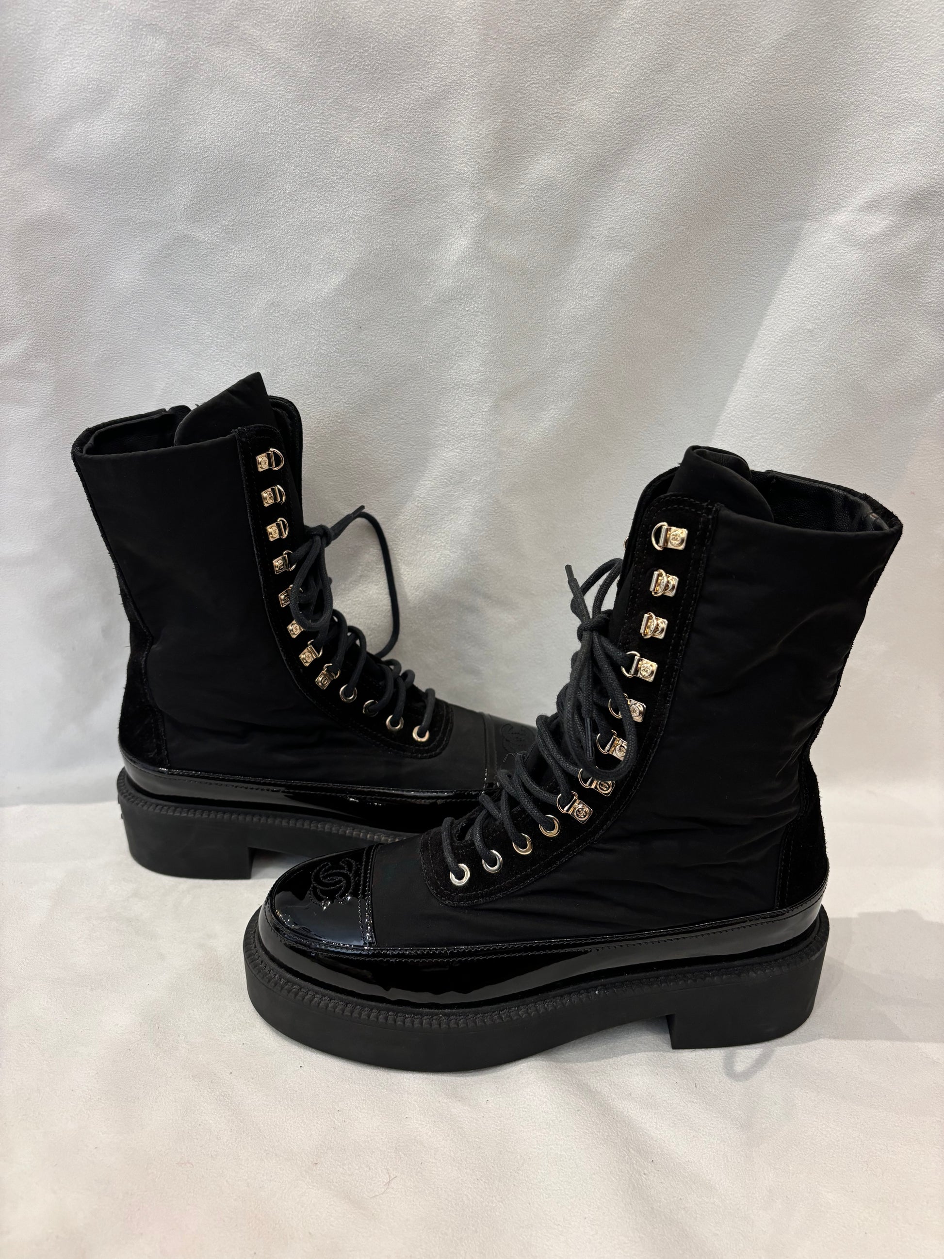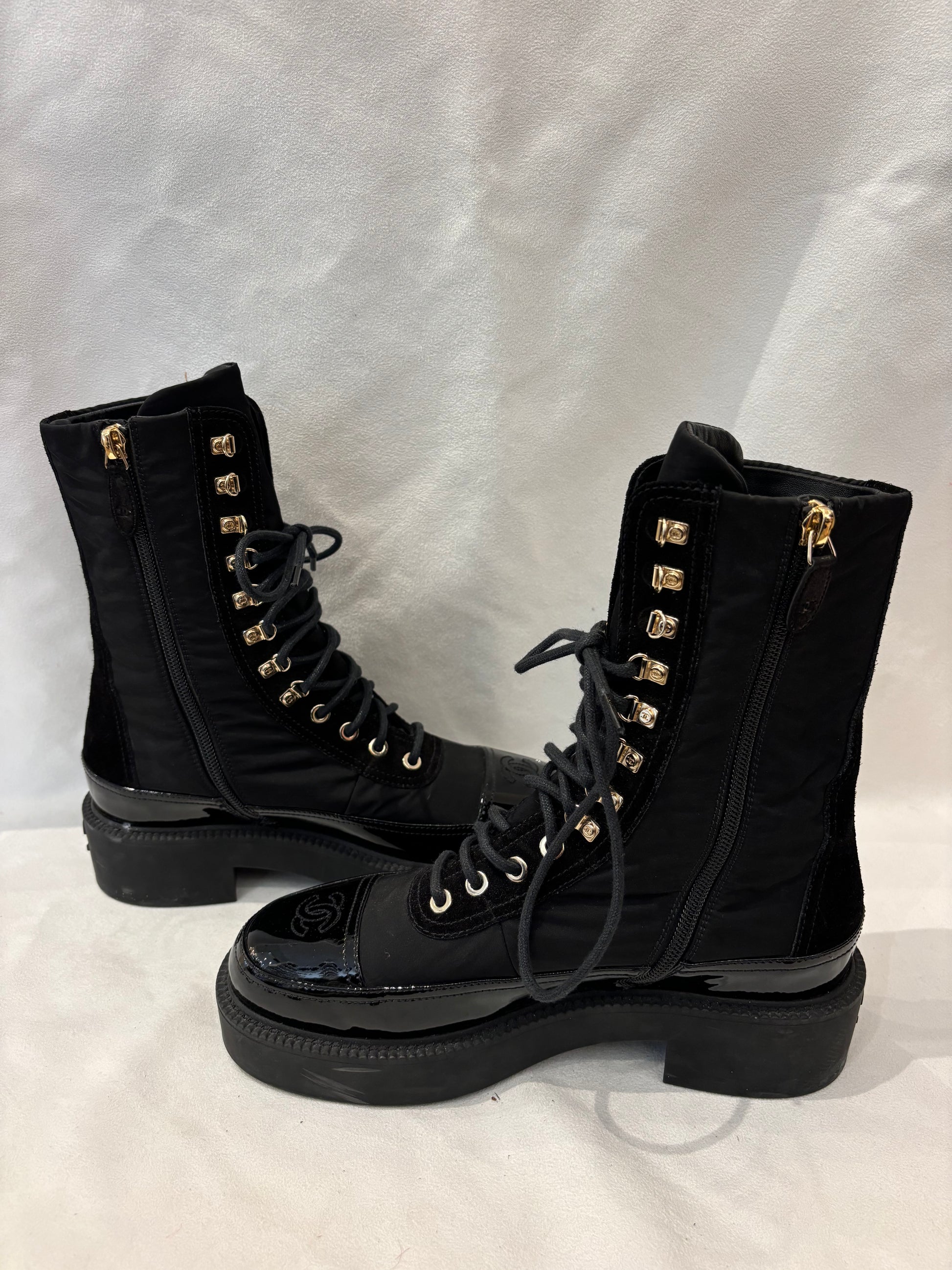 Chanel Black Nylon Combat Boots with Patent Leather Toe Cap Size 37