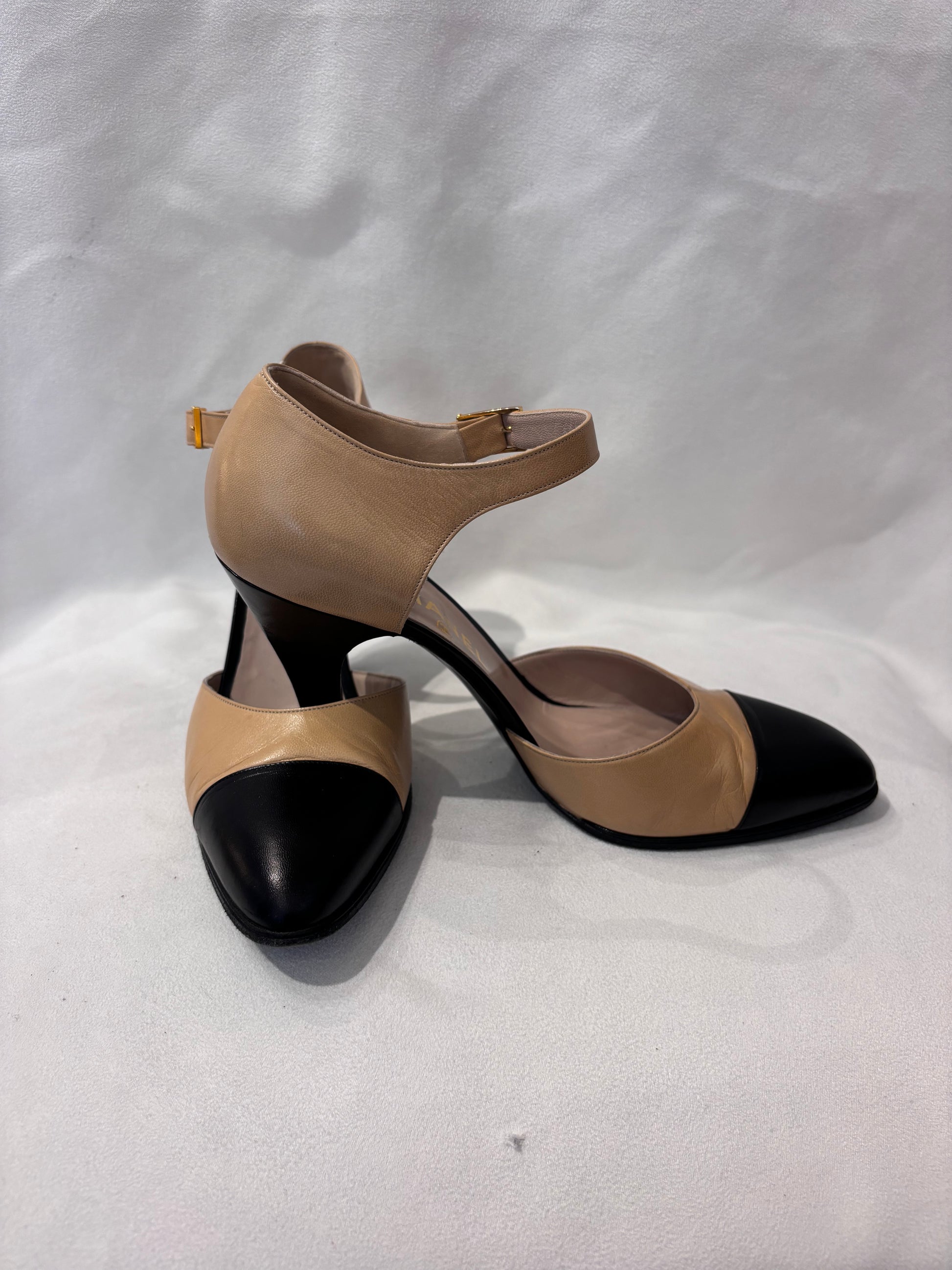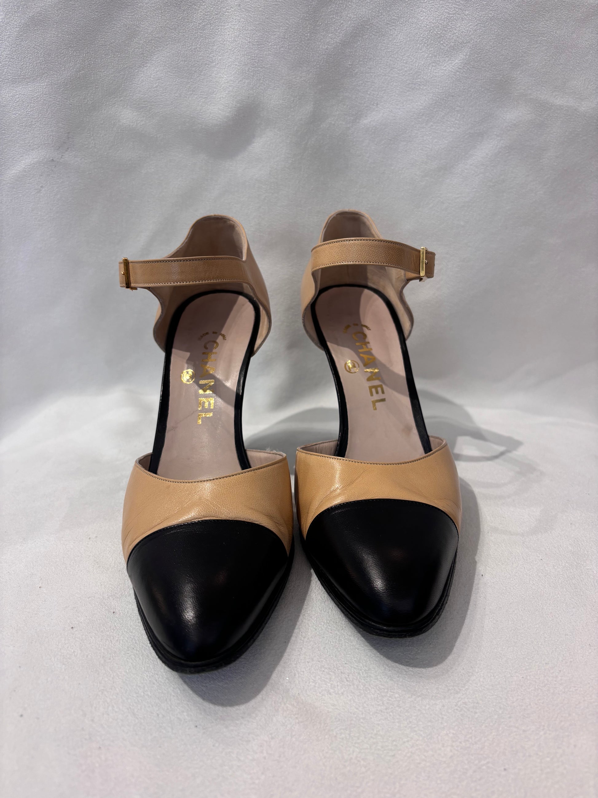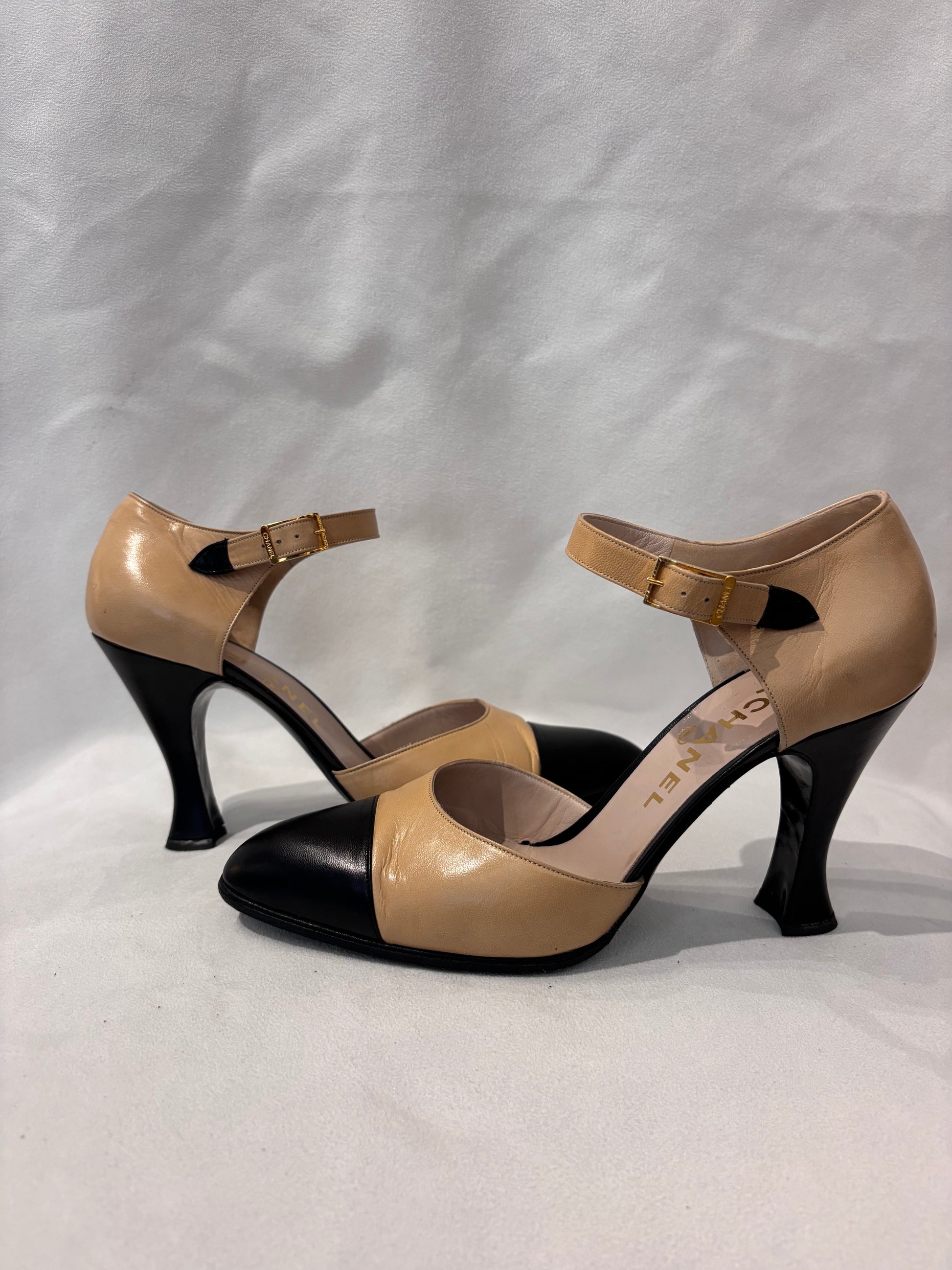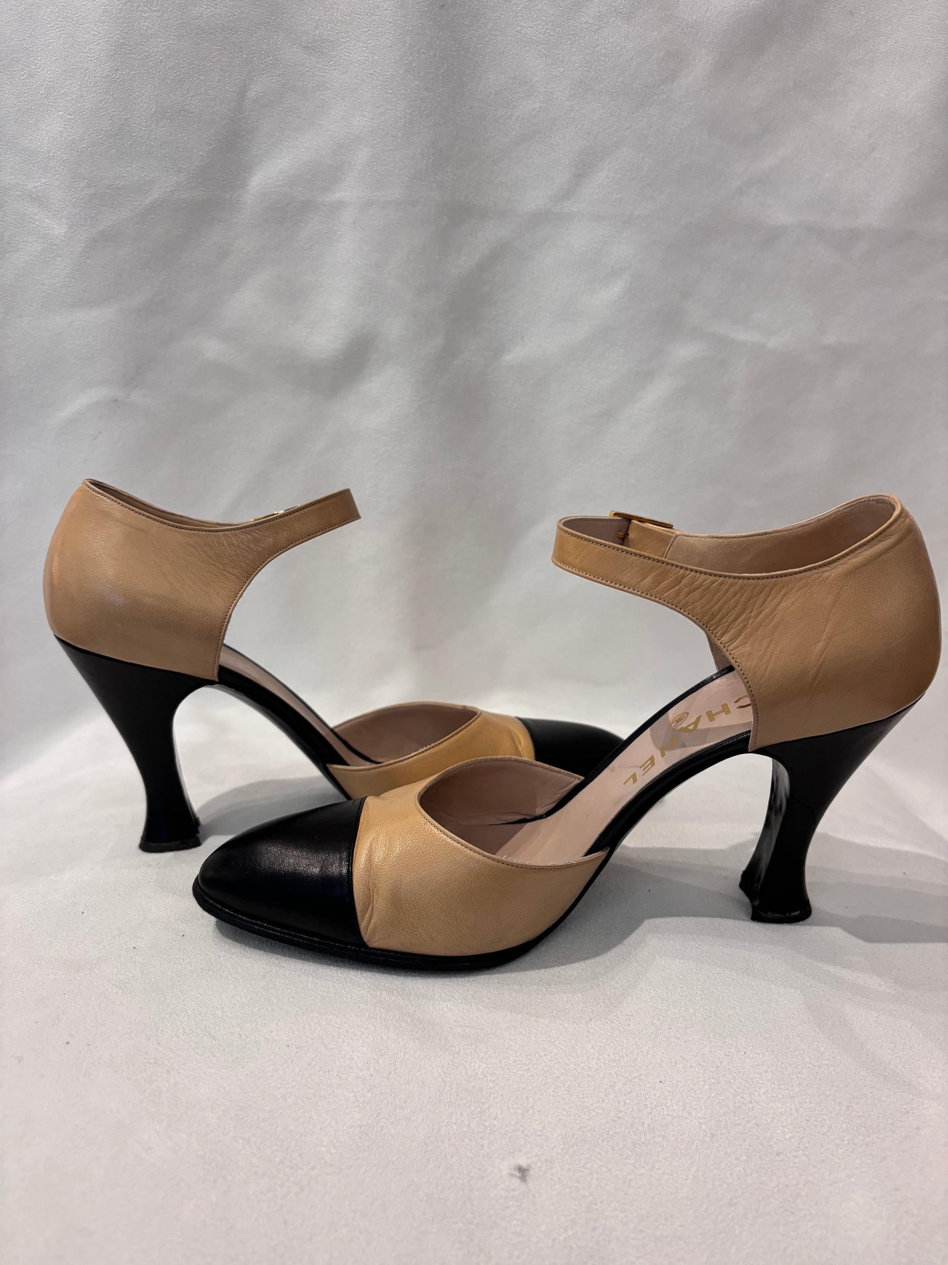 Chanel Vintage Beige Mary Jane’s with Black Toe Cap Size 39