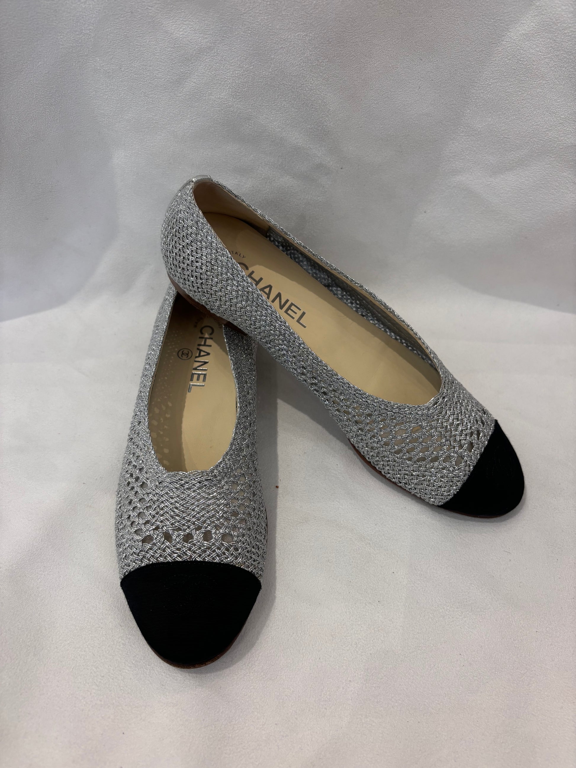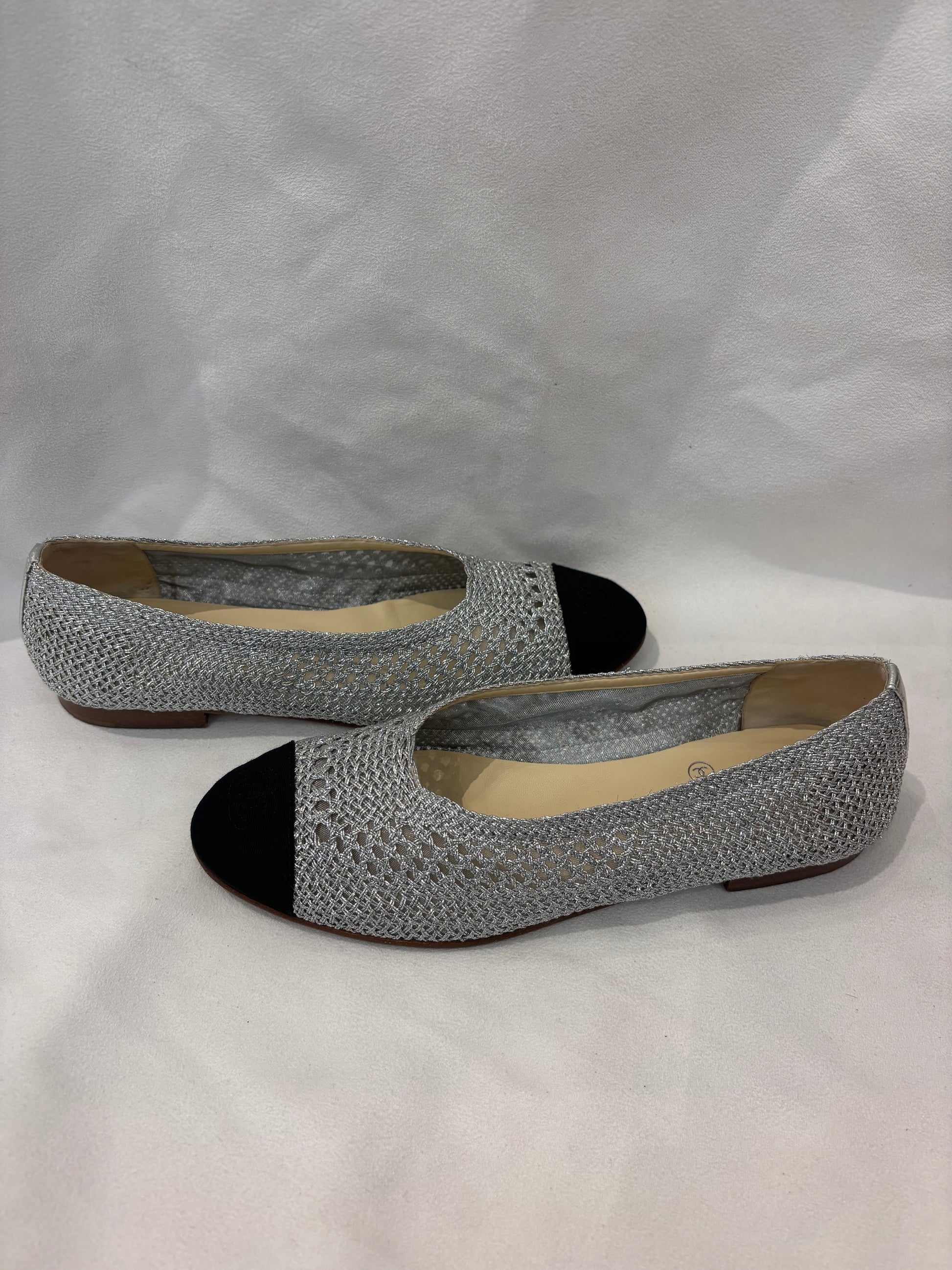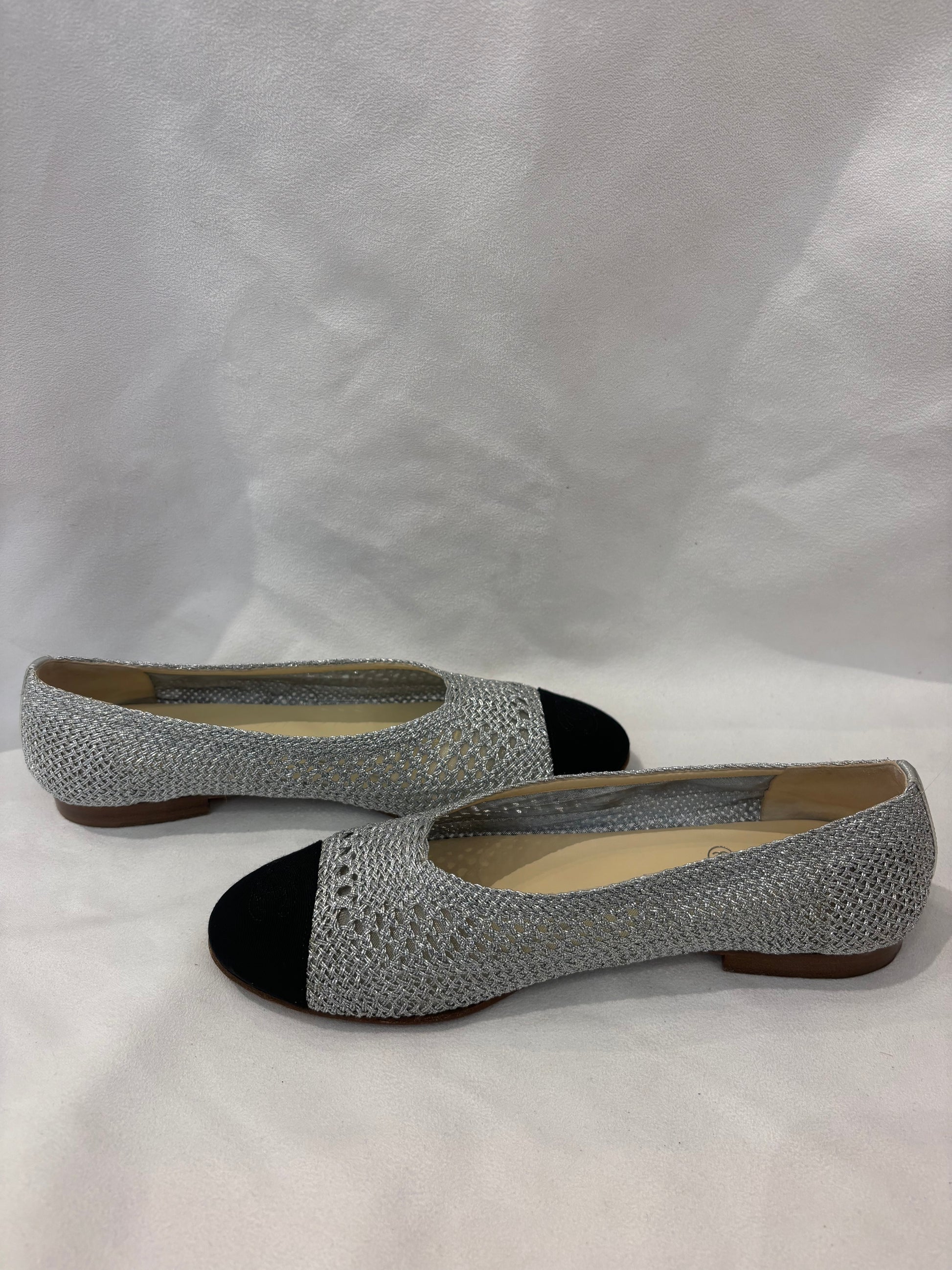 Chanel Silver Crochet Flats with Black Toe Cap Size 39