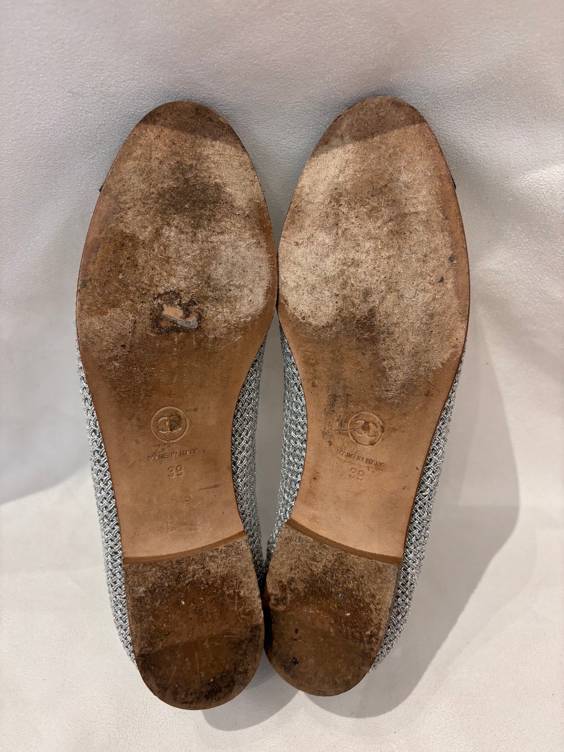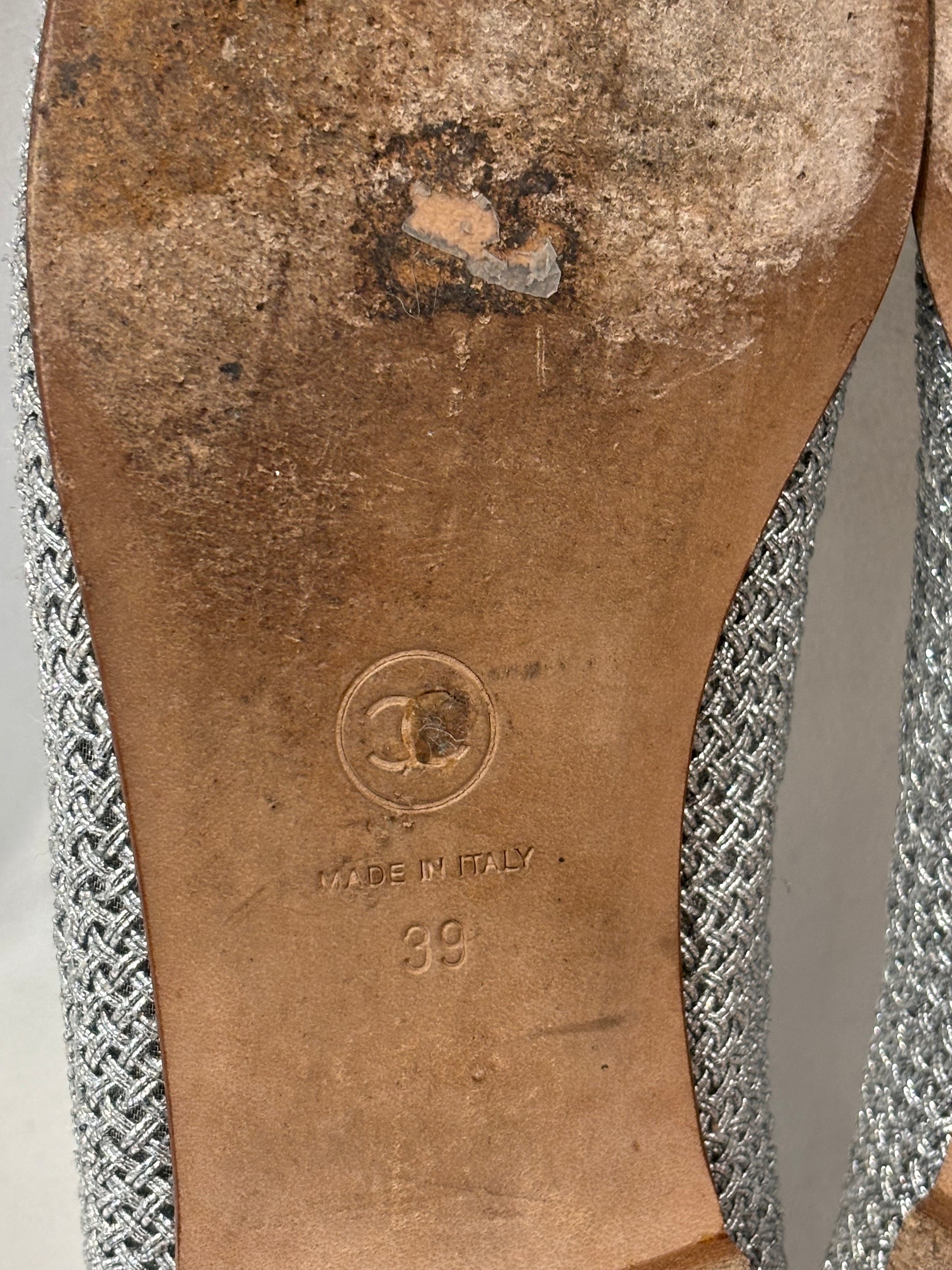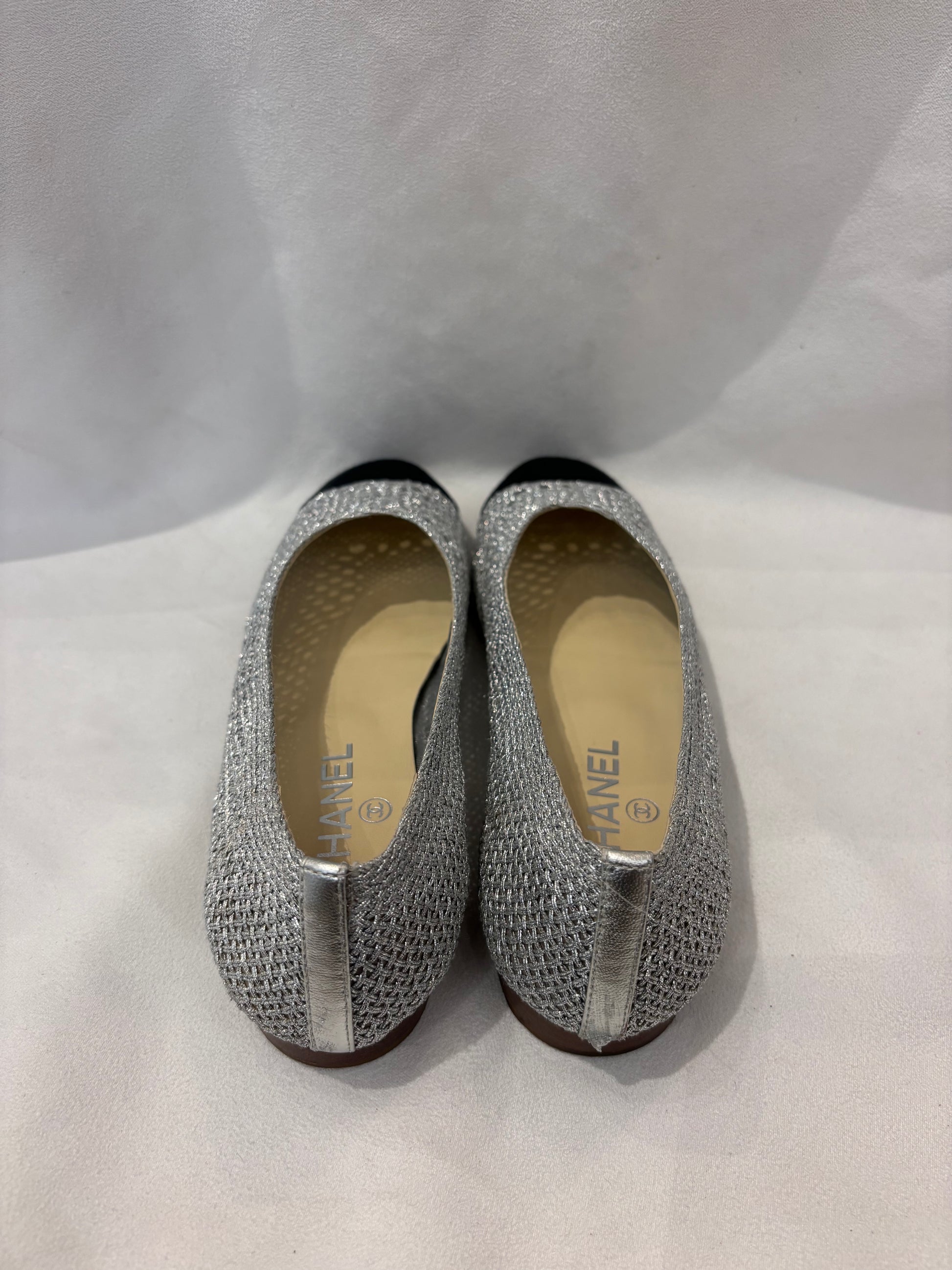Chanel Silver Crochet Flats with Black Toe Cap Size 39