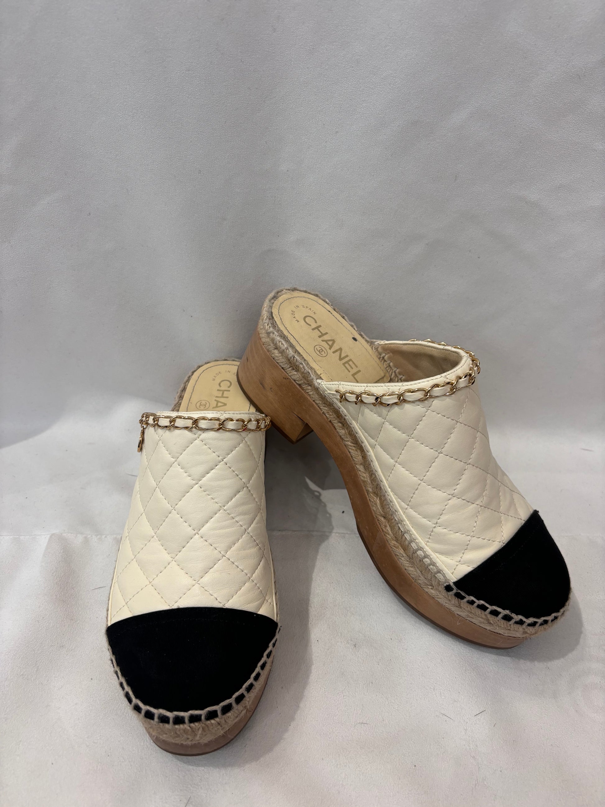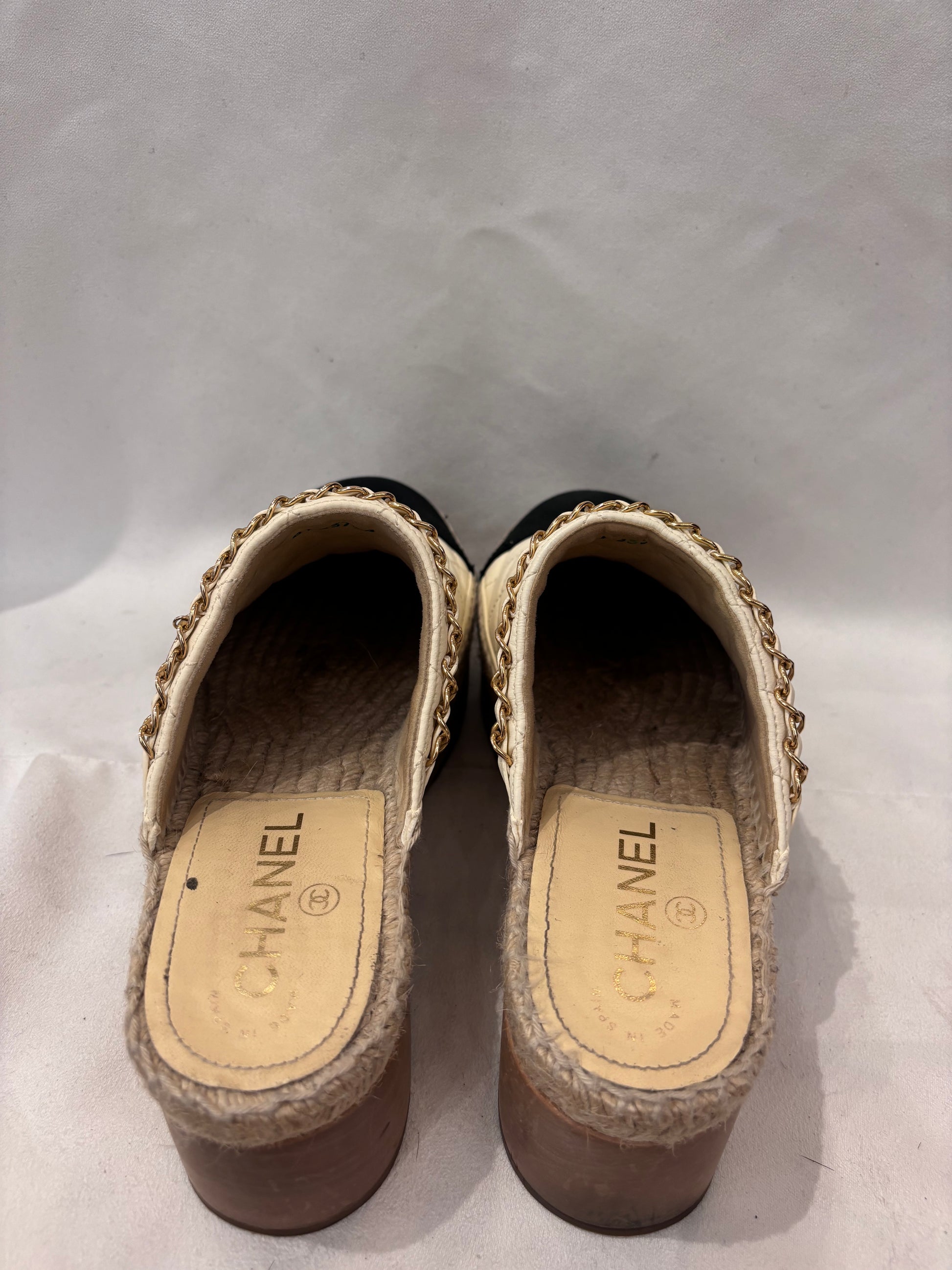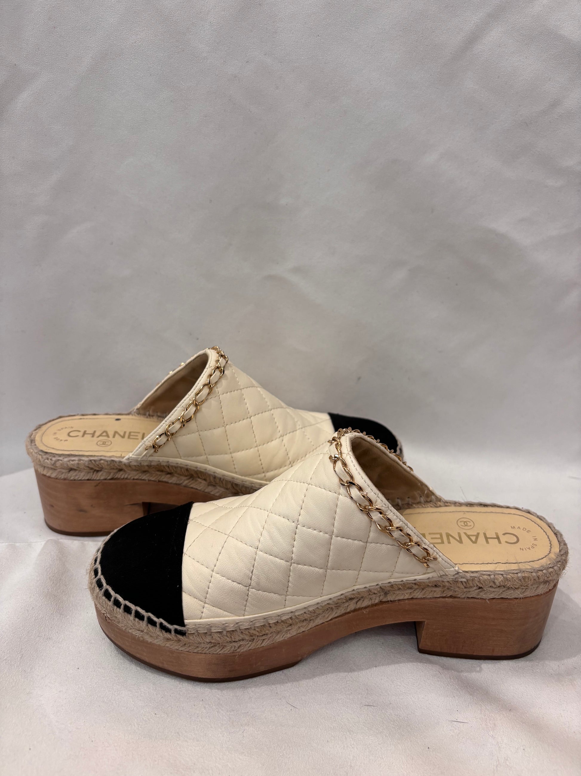Chanel Cream Diamond Quilted Mules with Black Toe Cap/Gold Chain CC Size 38