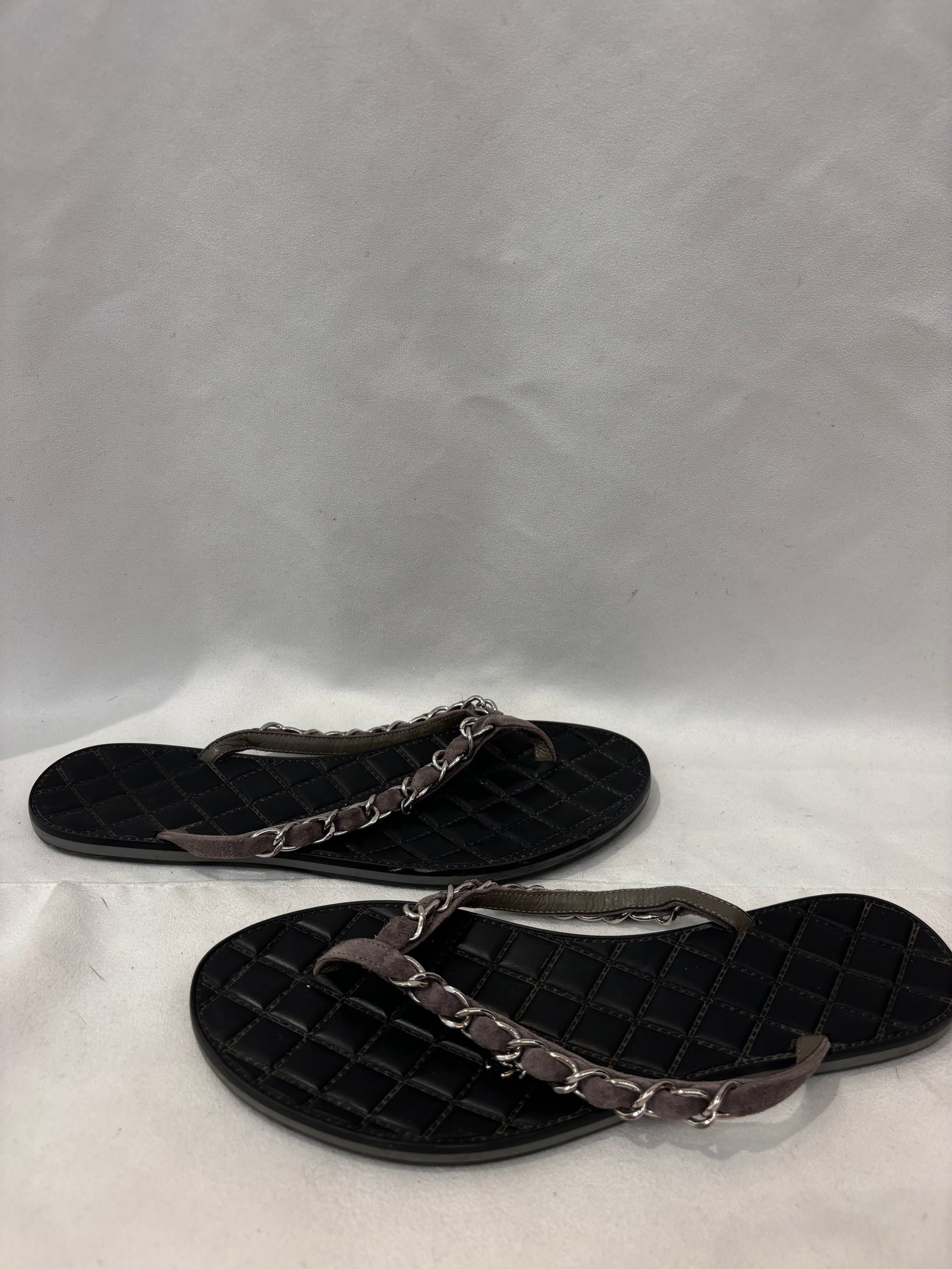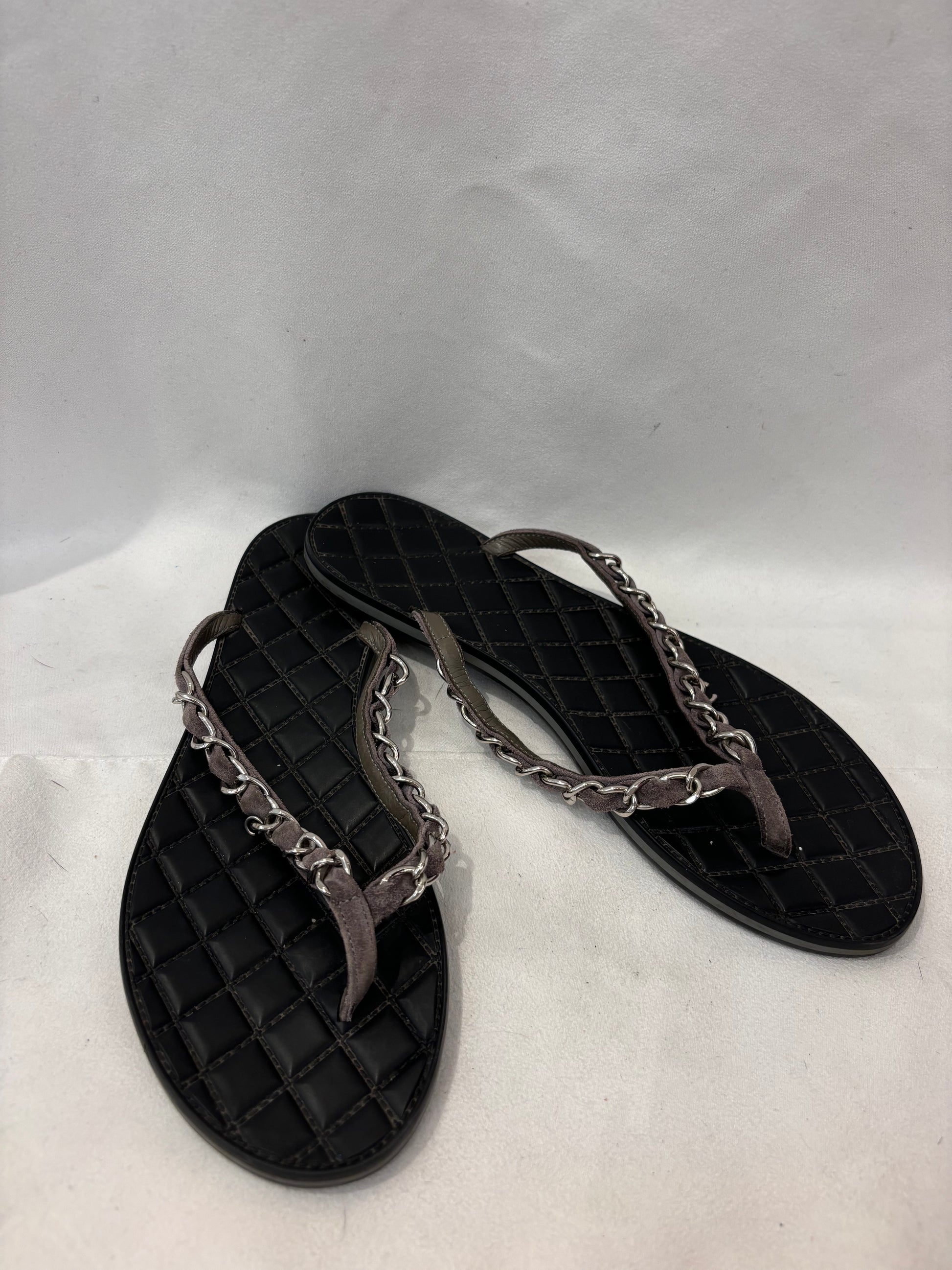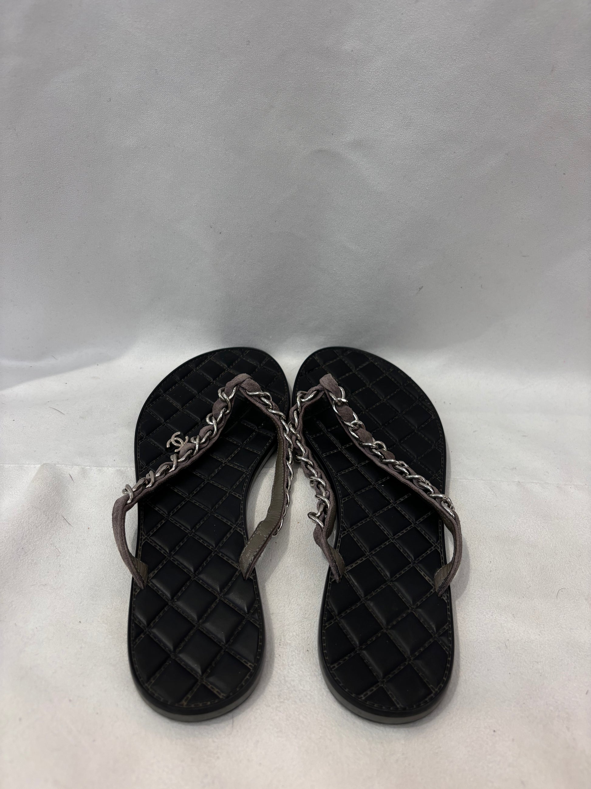 Chanel Gray Suede/Silver Chain Flip Flops Size 37