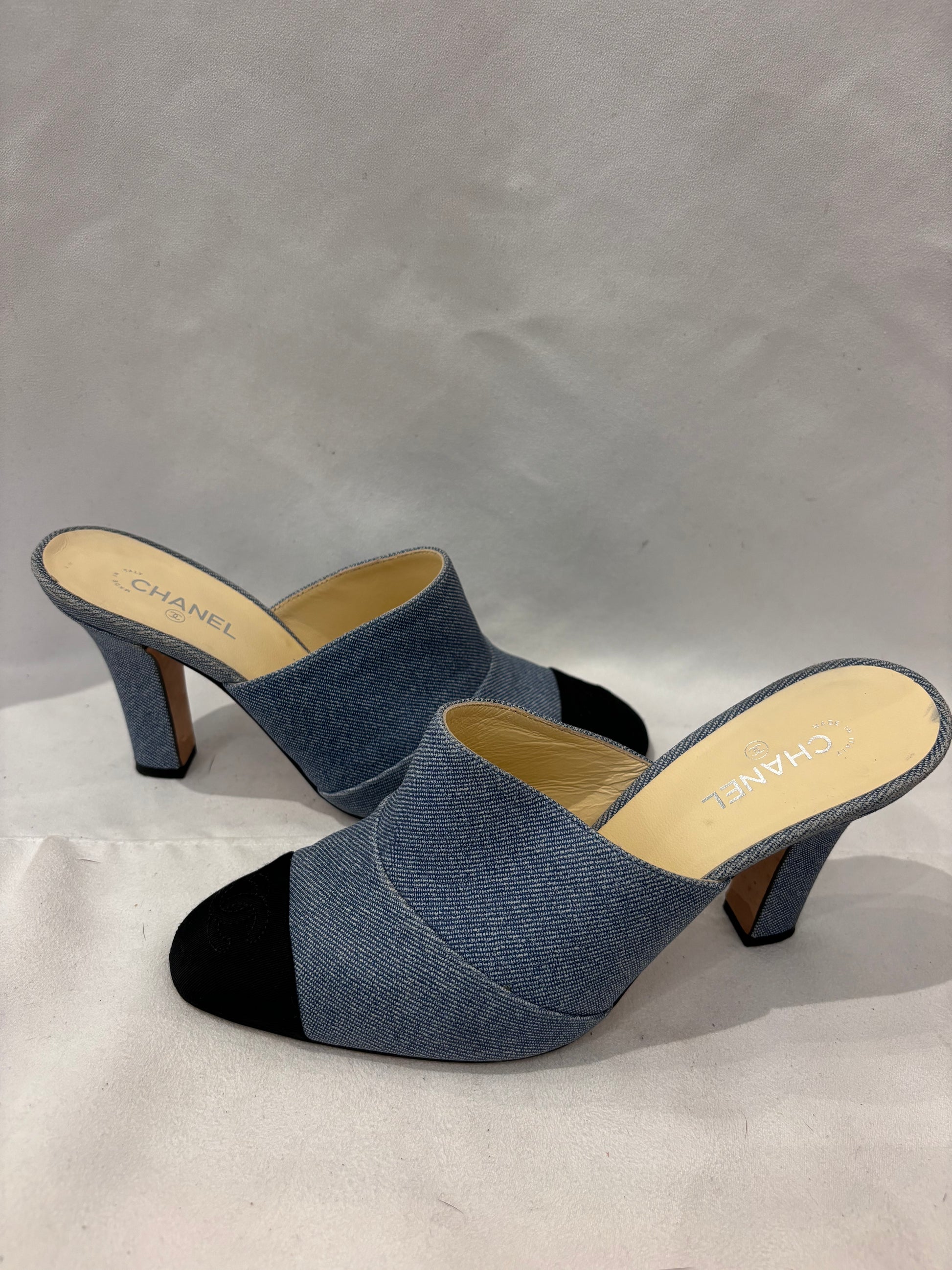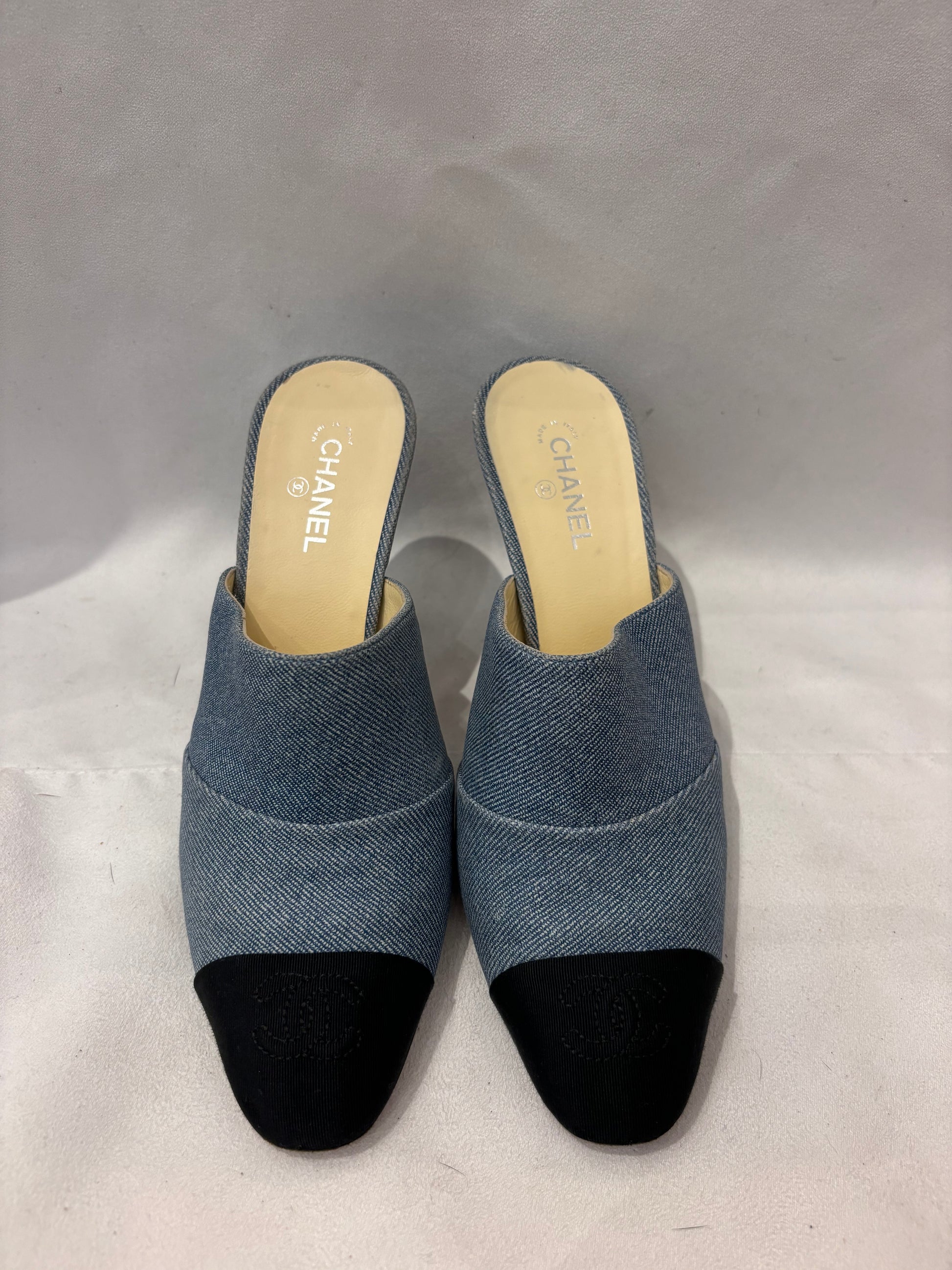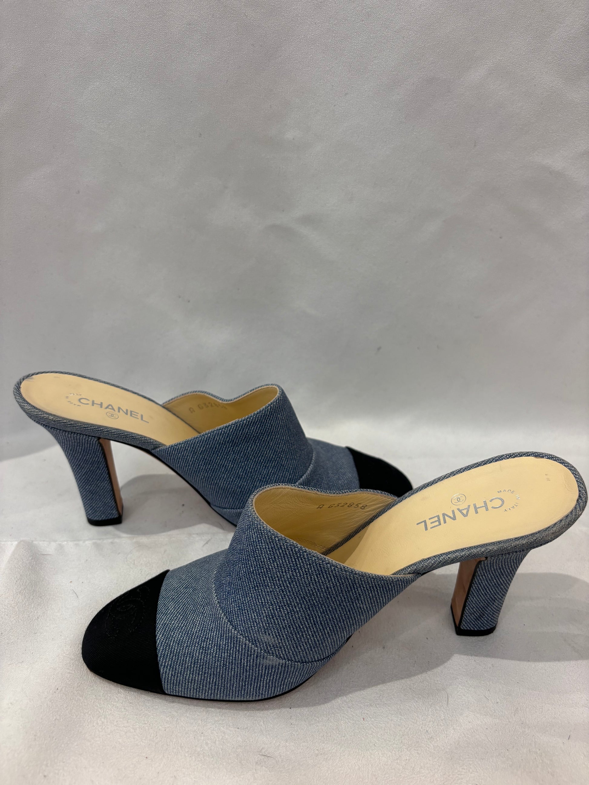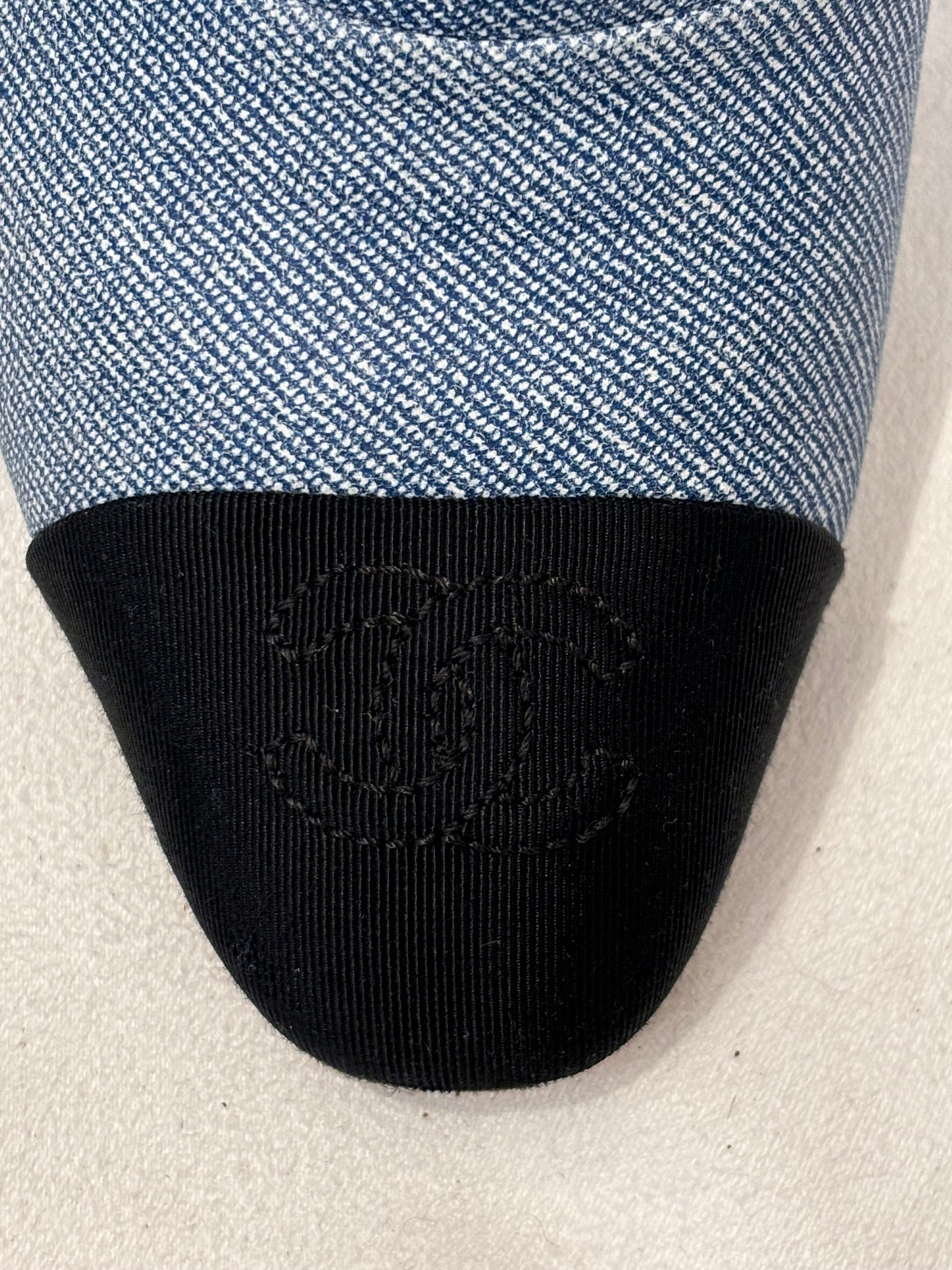Chanel Light Blue Denim Mules with Black Toe Cap Size 36.5