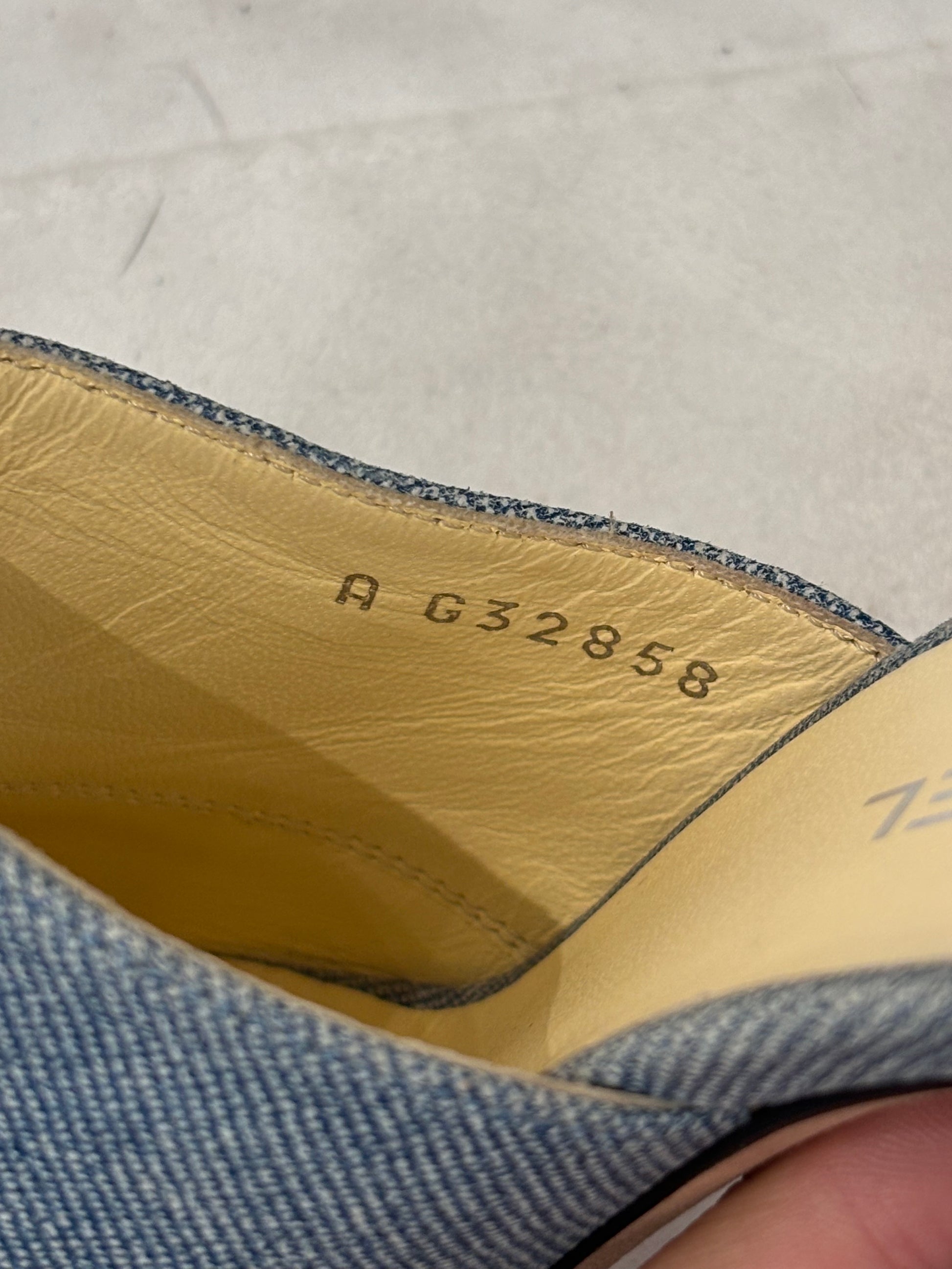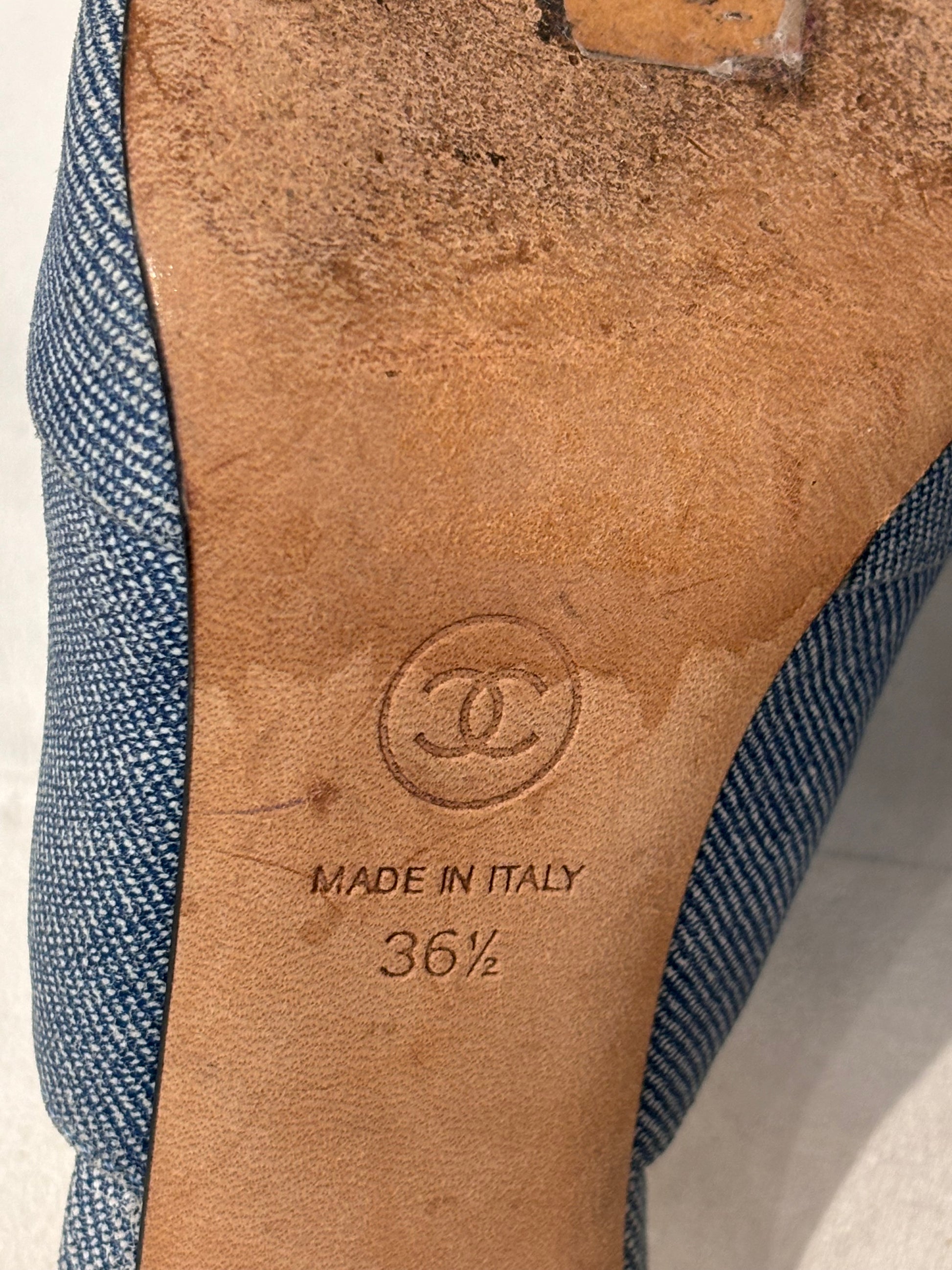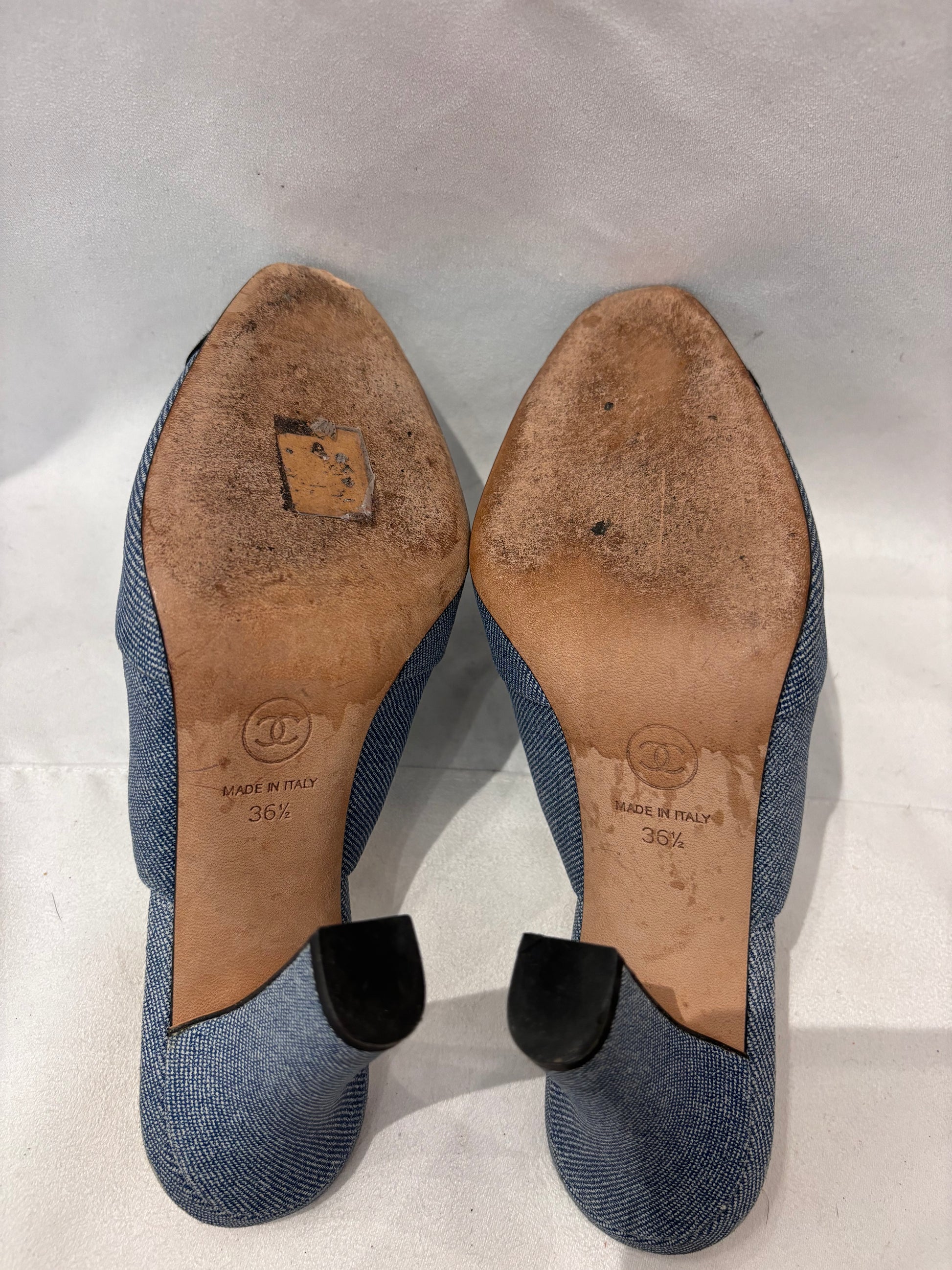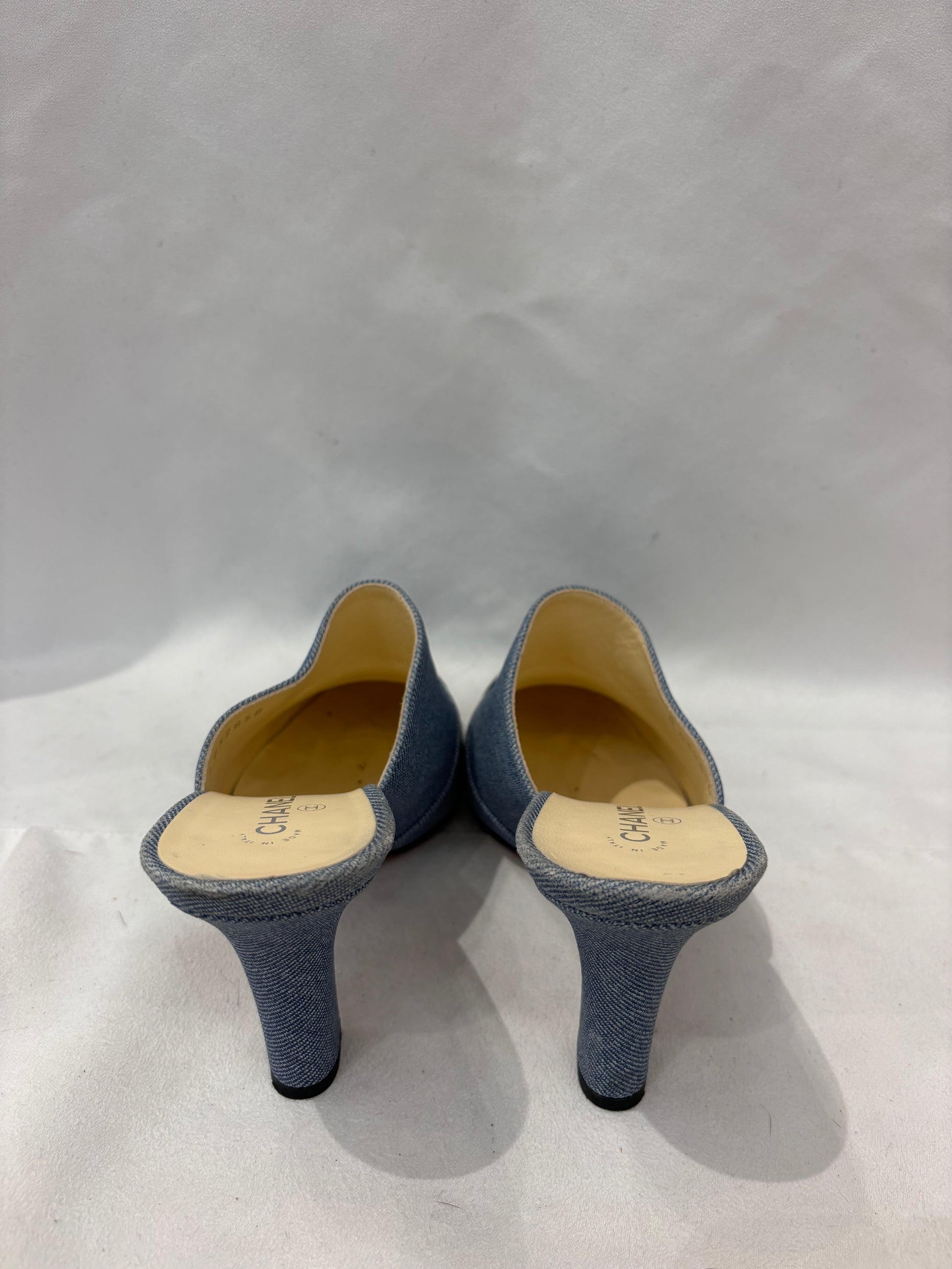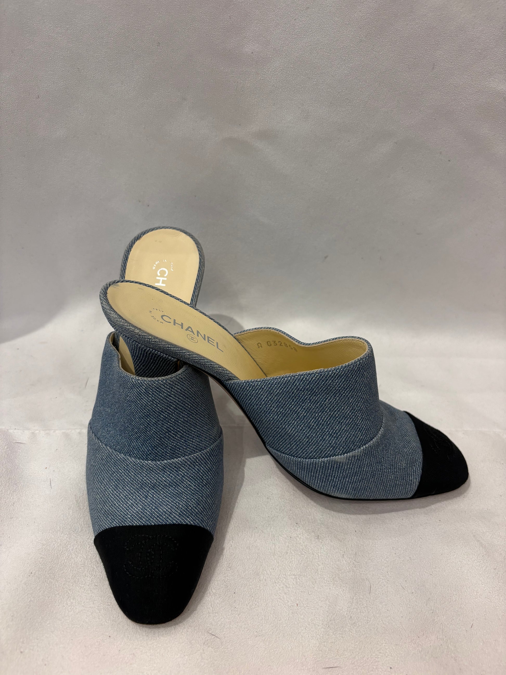 Chanel Light Blue Denim Mules with Black Toe Cap Size 36.5