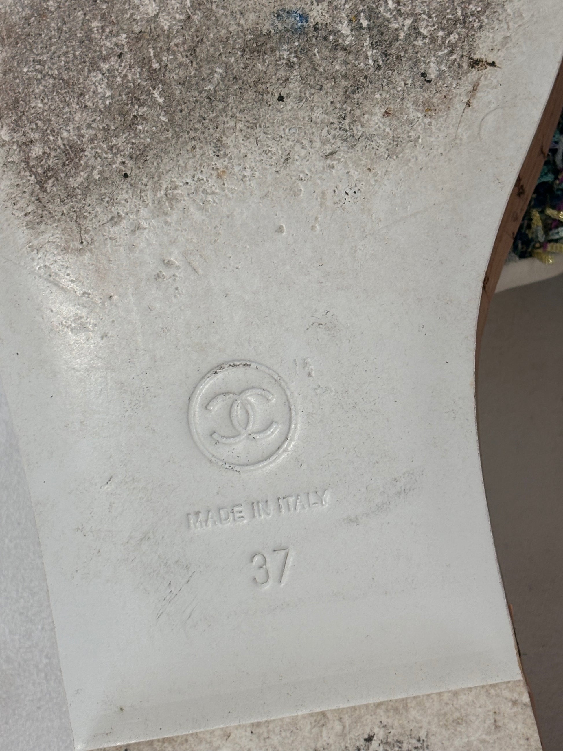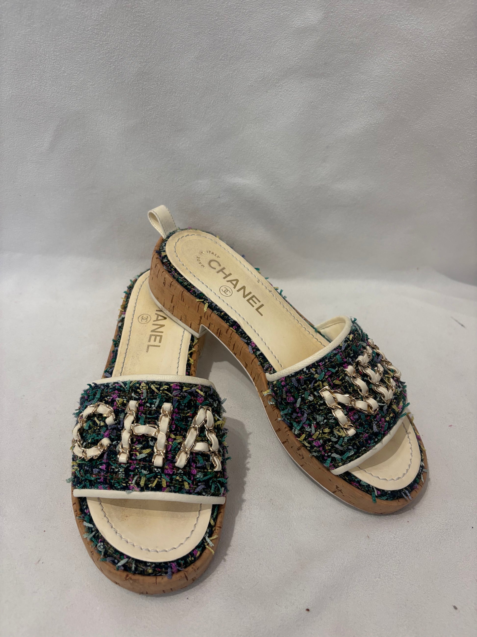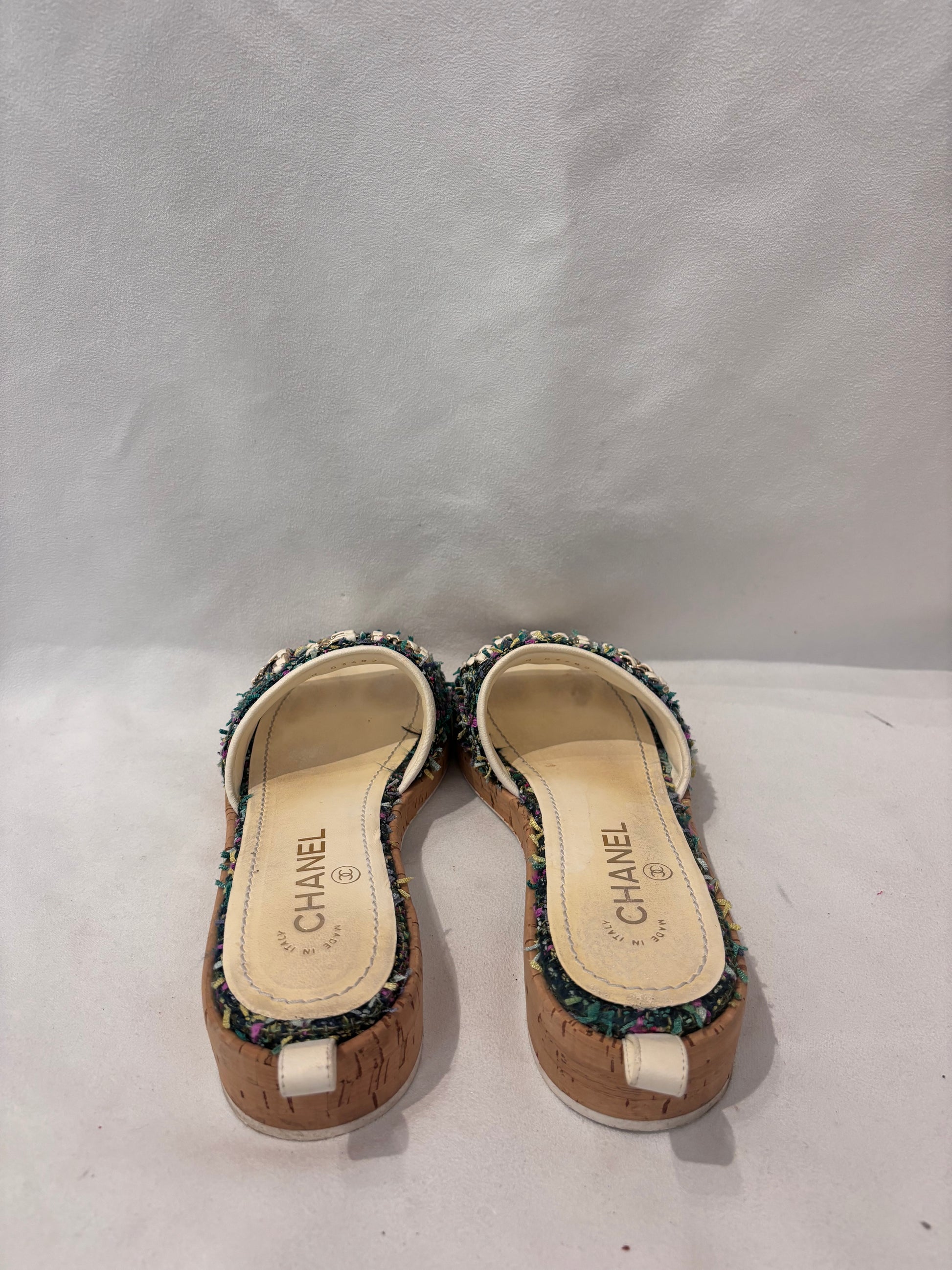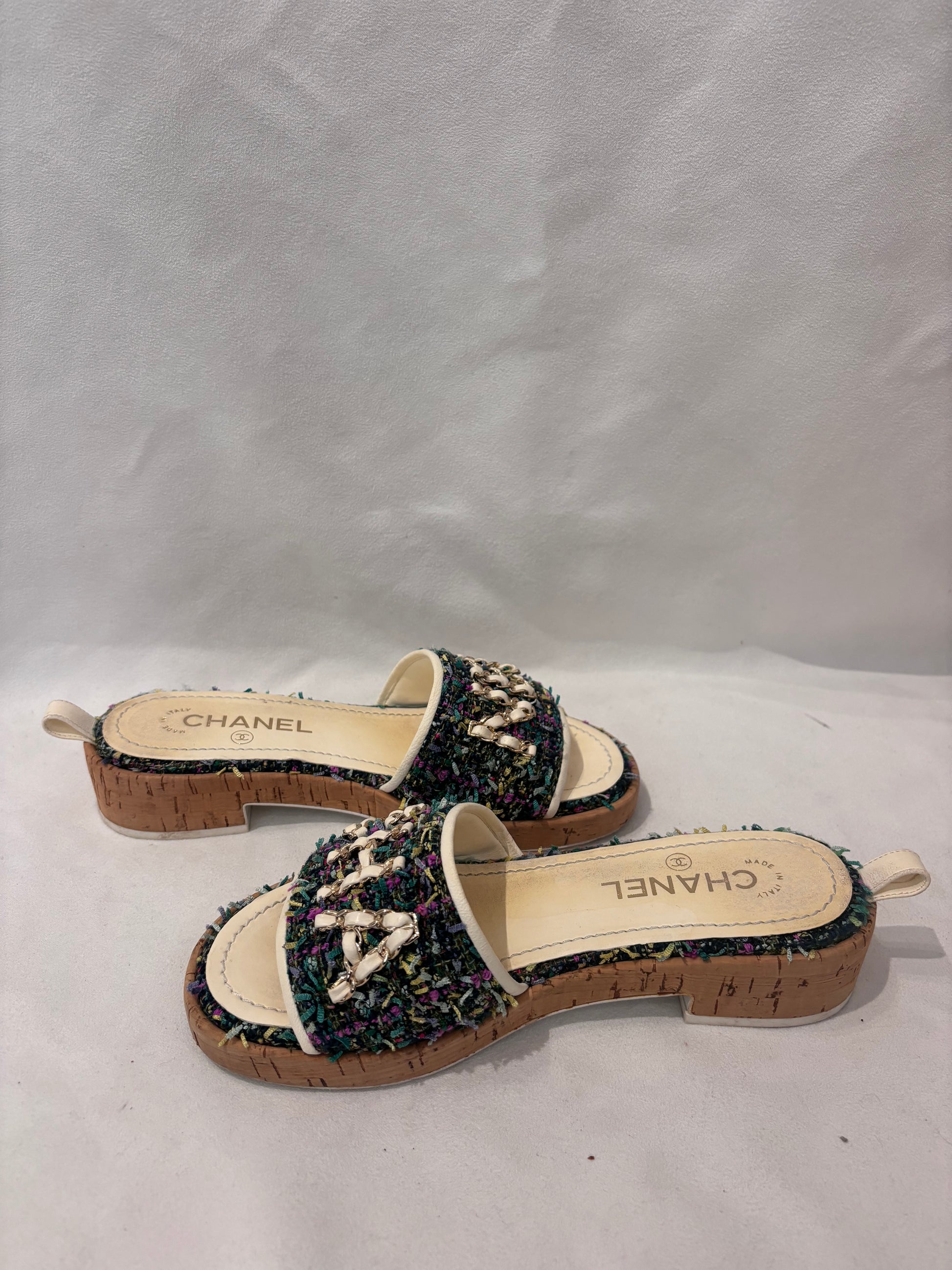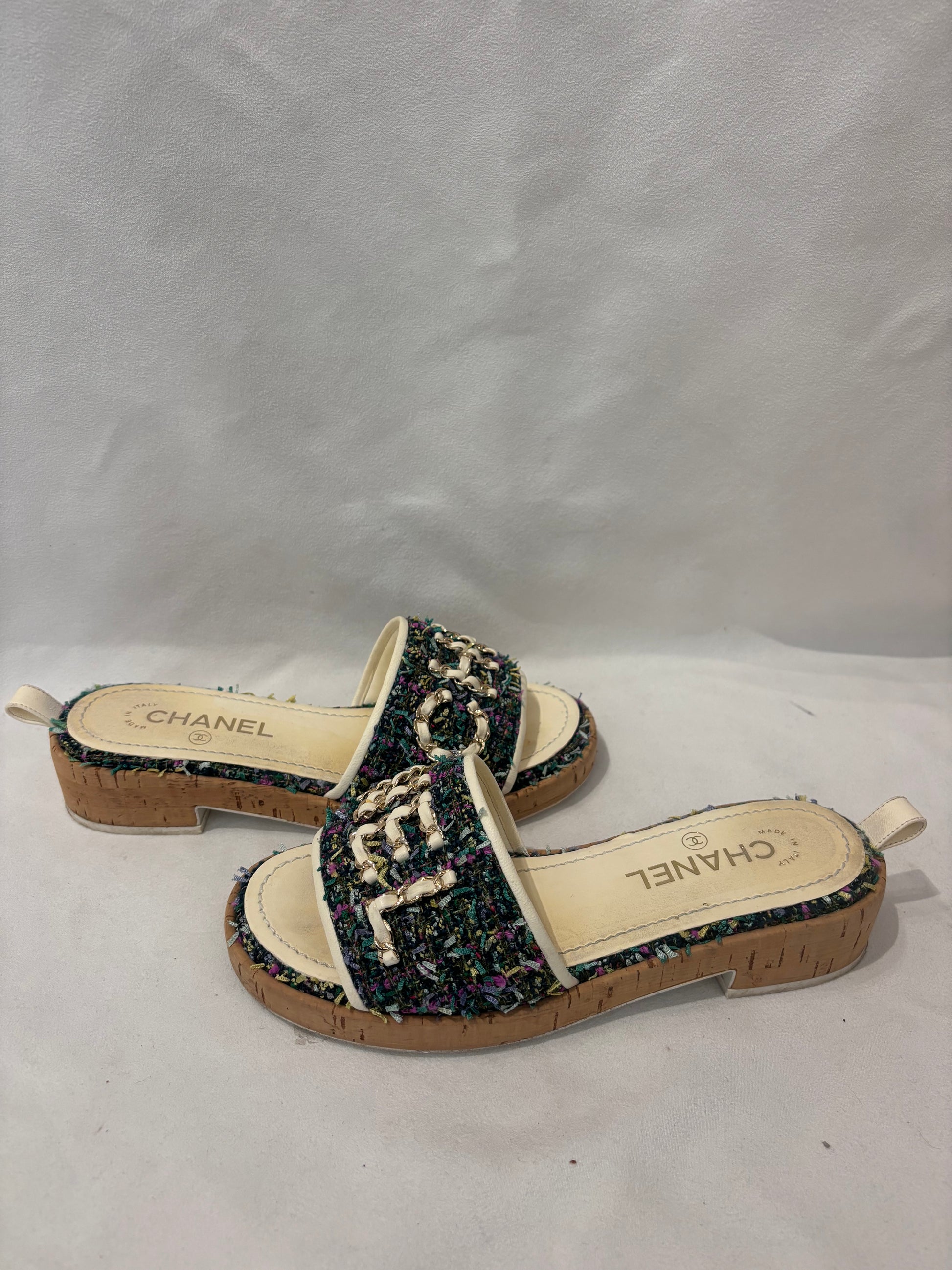 Chanel Green Tweed Slides with Cream Gold Chain Logo Size 37