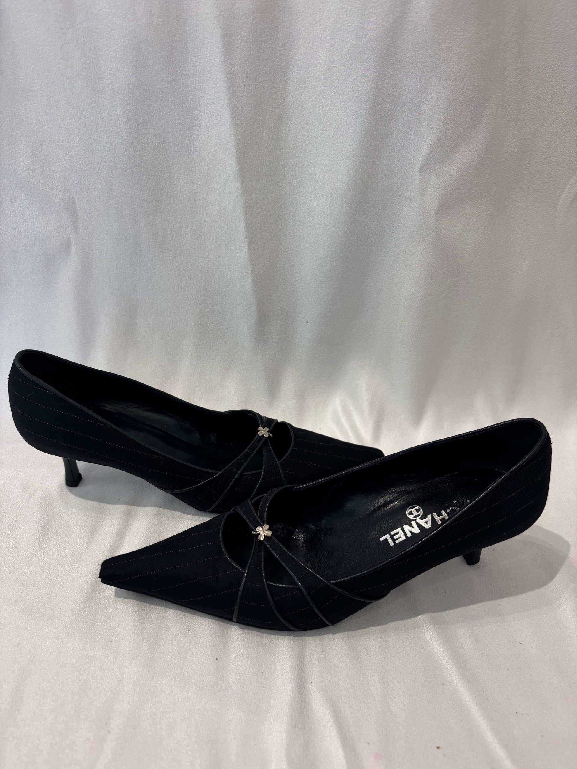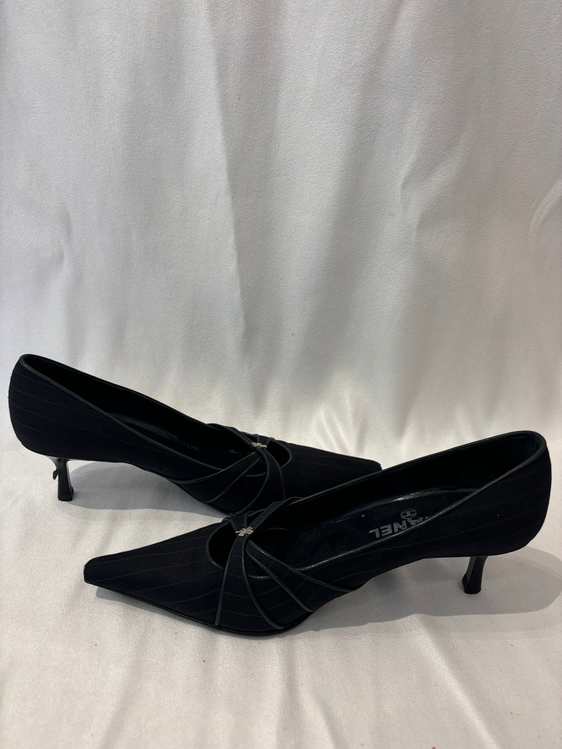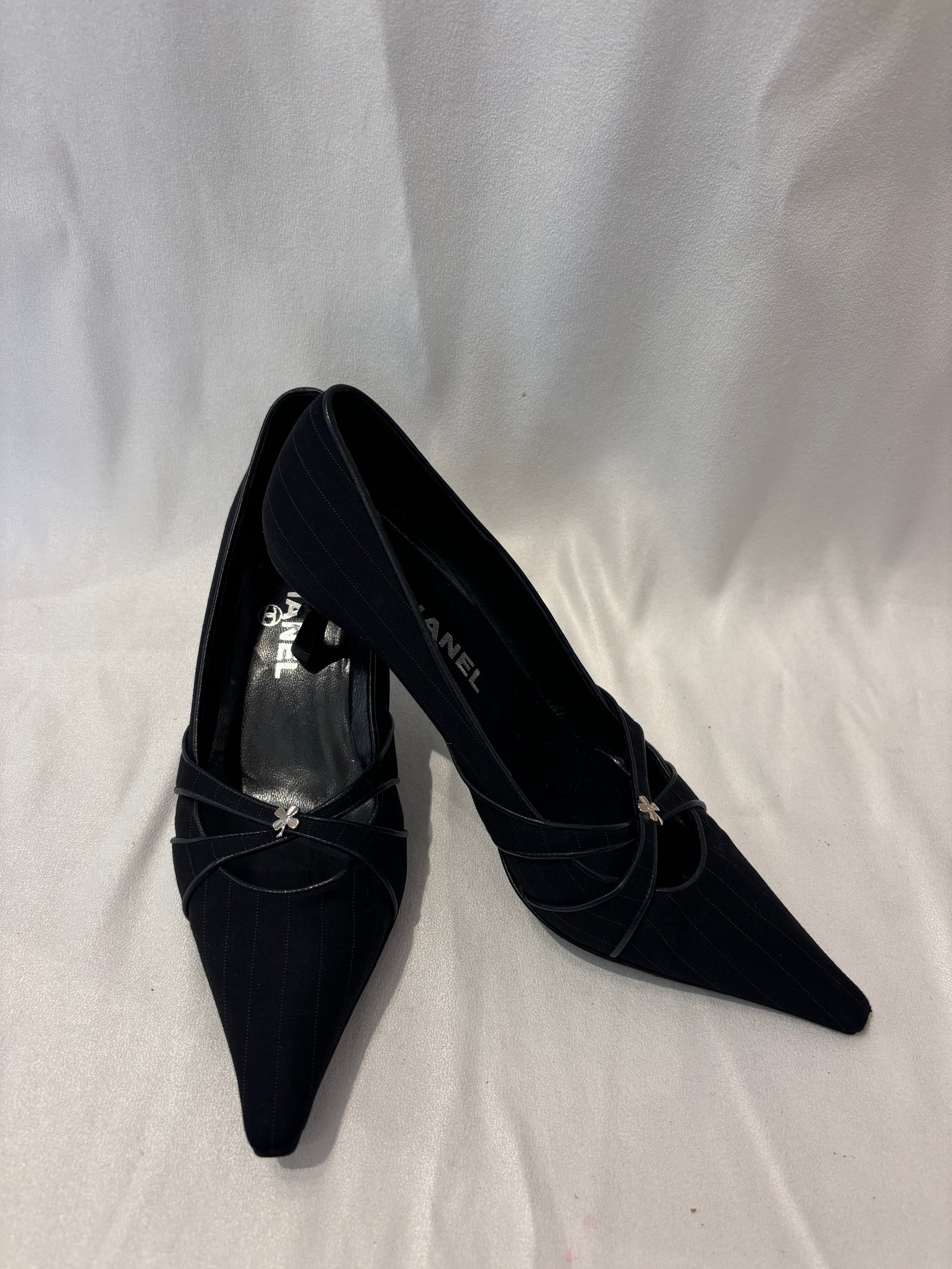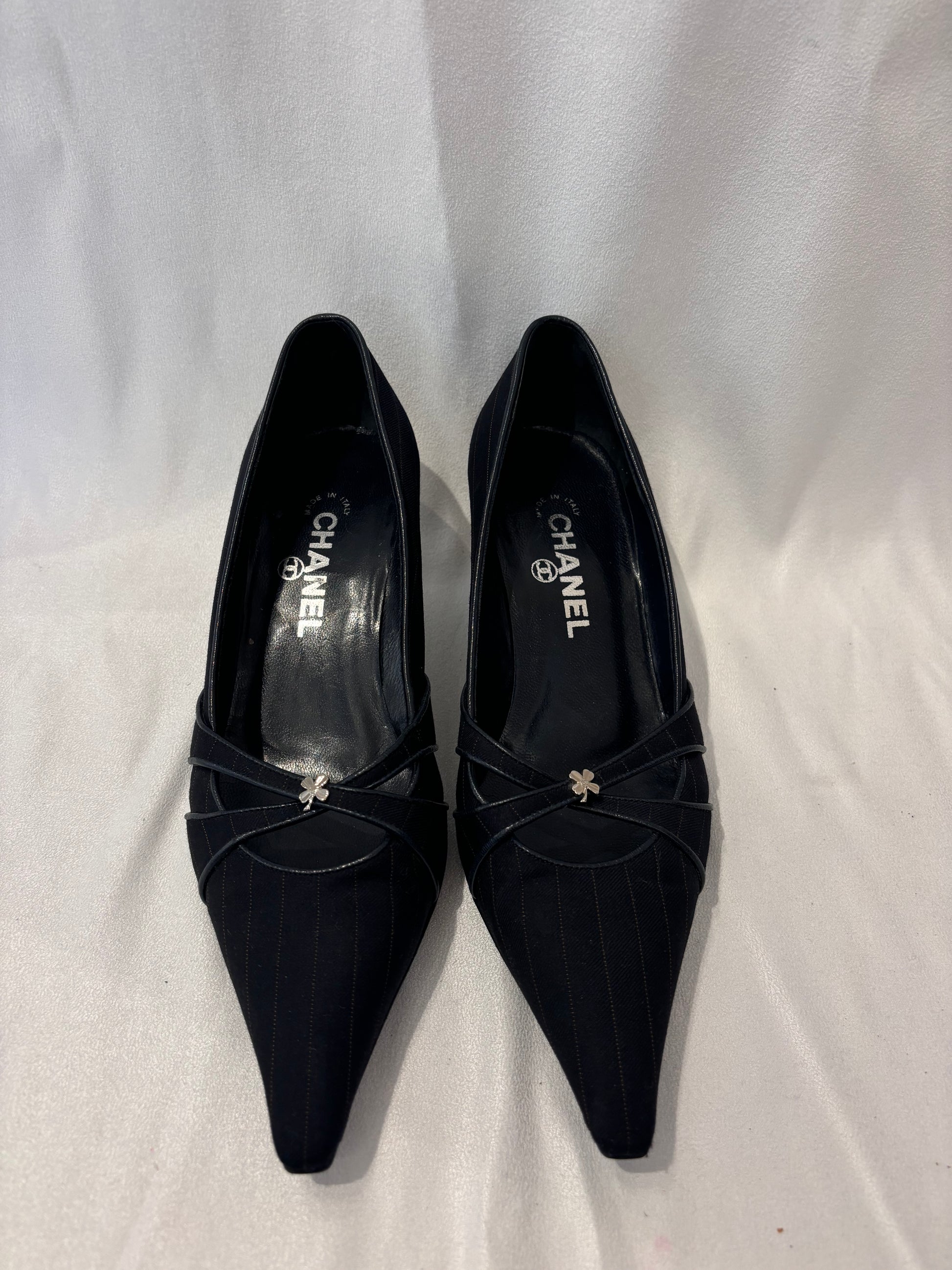 Chanel Black/Burgundy Pinstripe Pointy Pump with Silver Clover Size 39.5