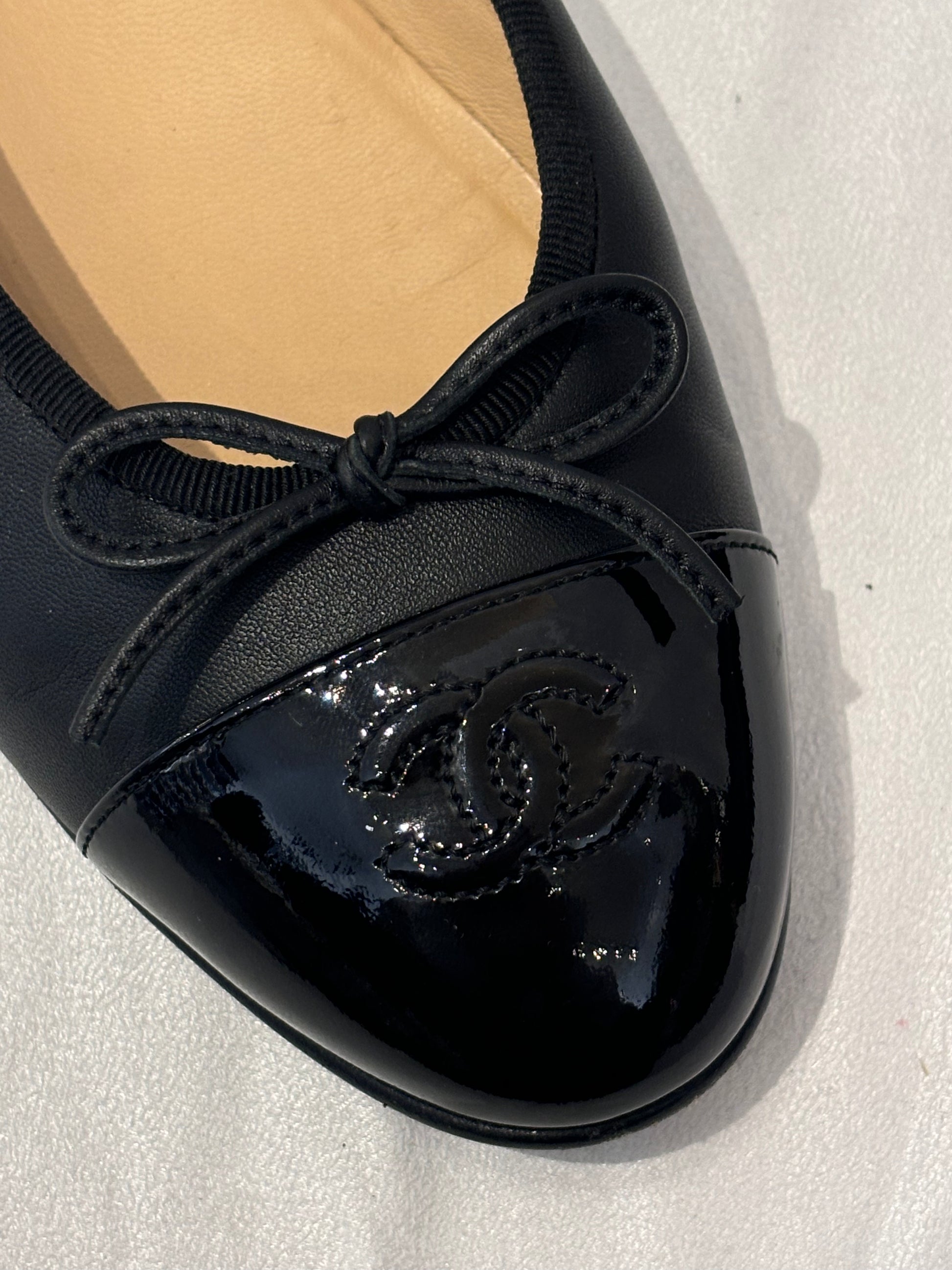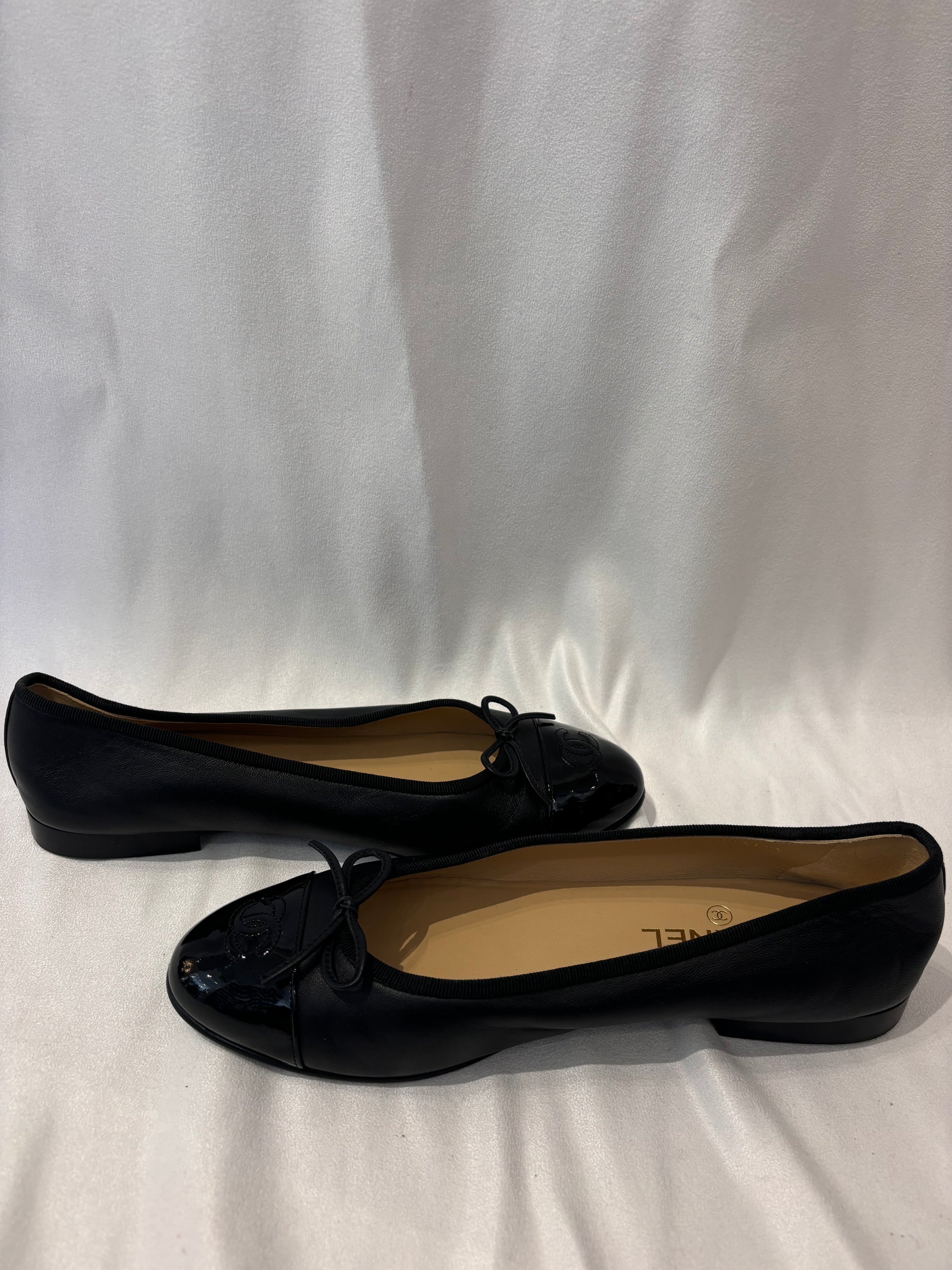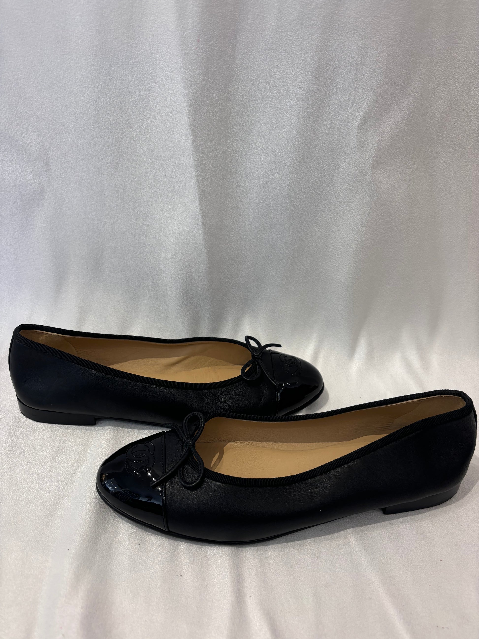Chanel Black Patent Leather Ballet Flat with Patent Toe Cap Size 40.5