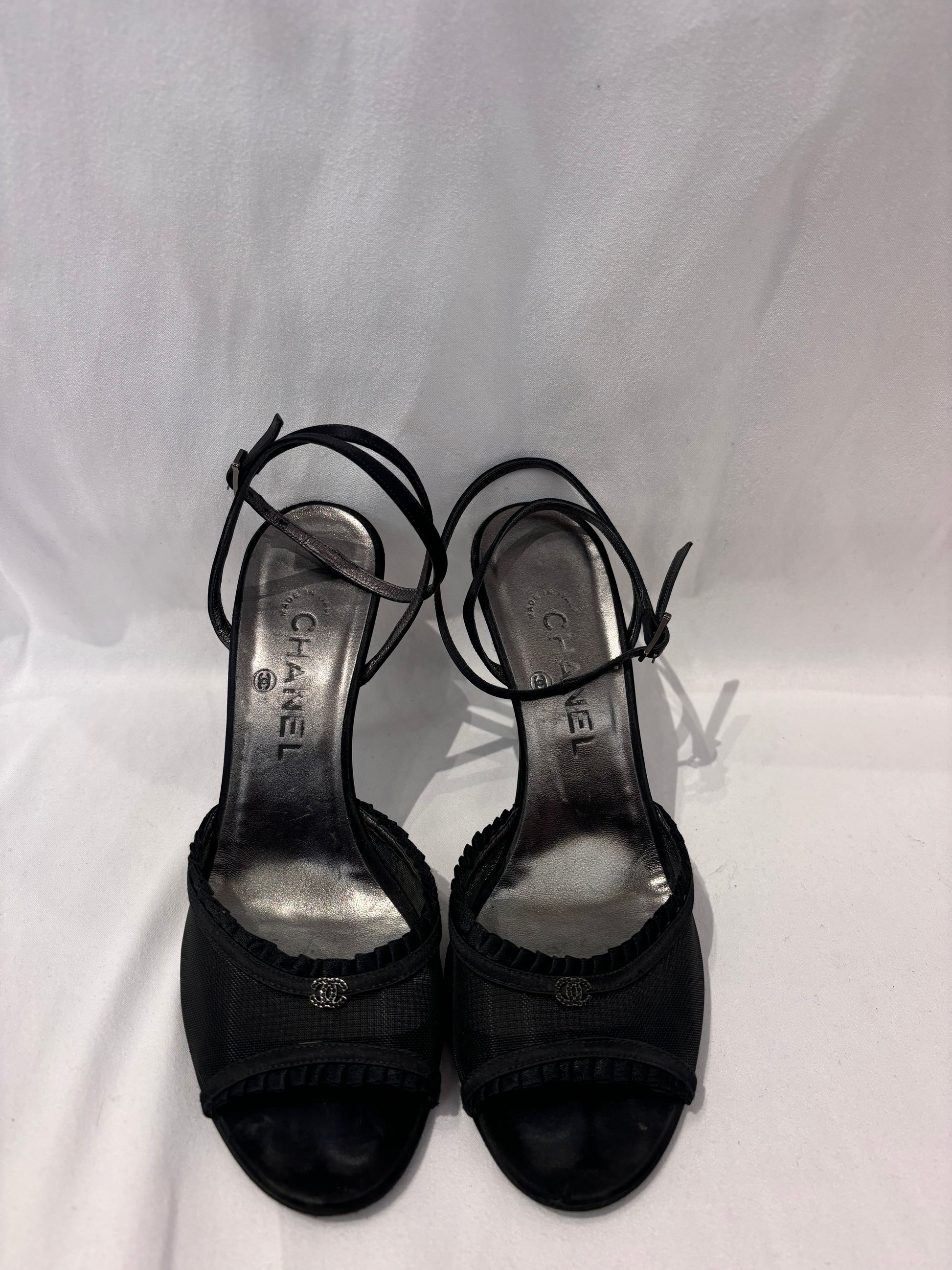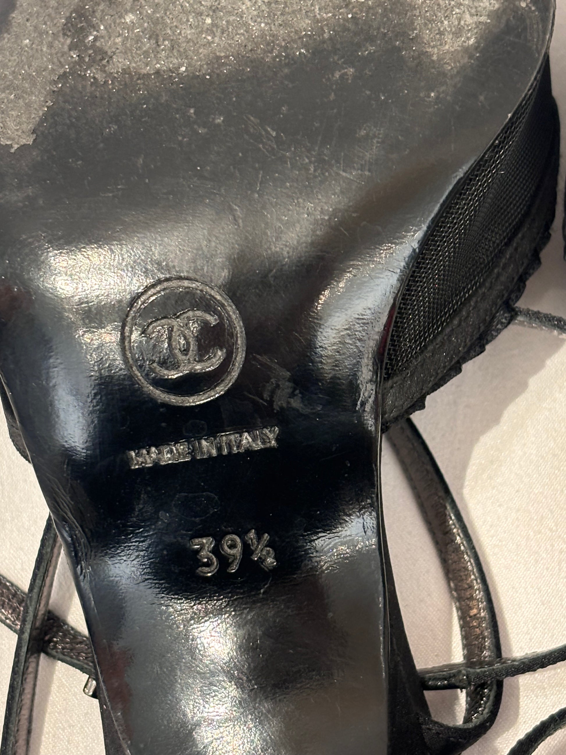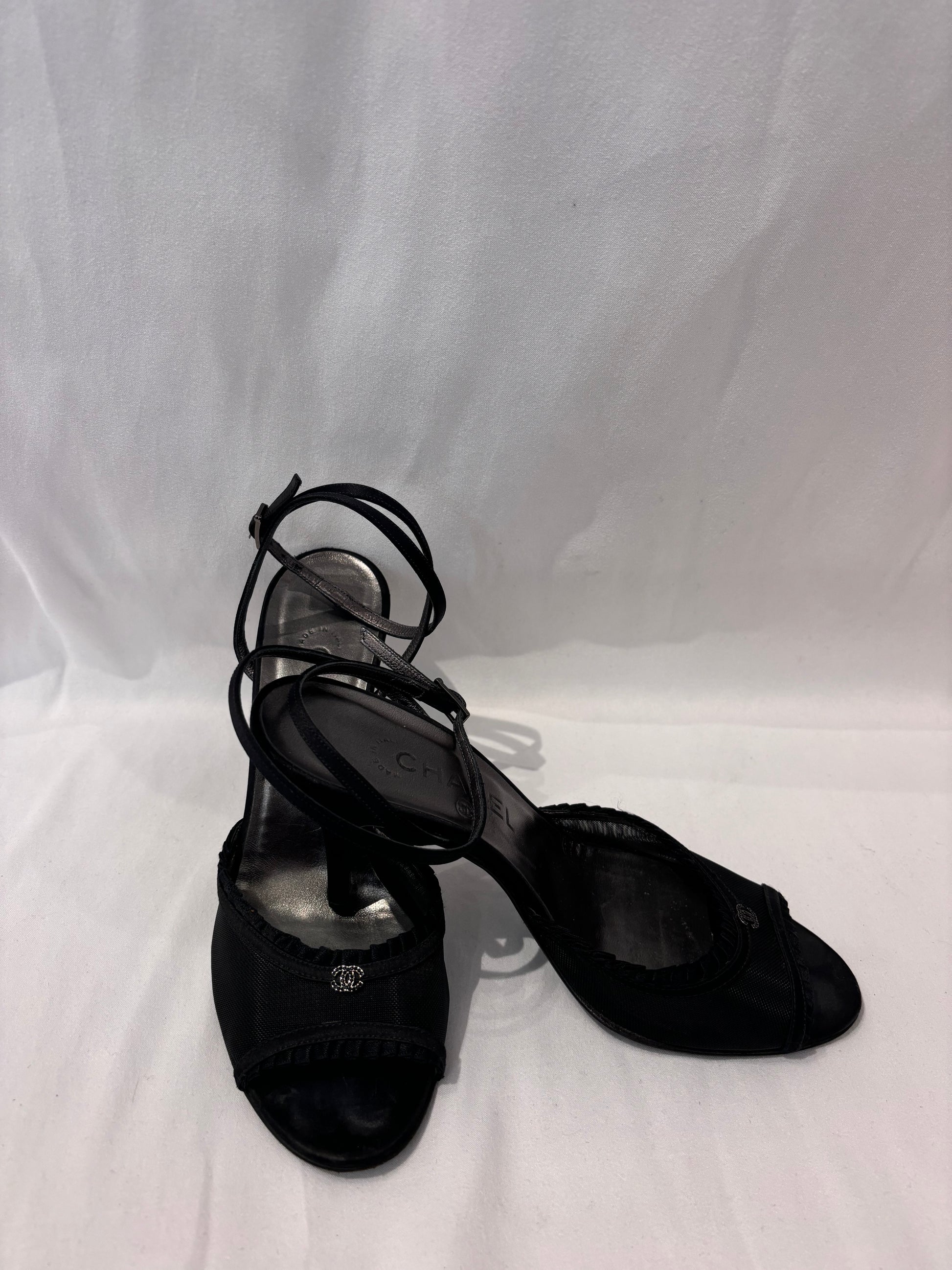 Chanel Black Mesh Sandals with Pleated Trim/Ankle Wrap Strap Size 39.5