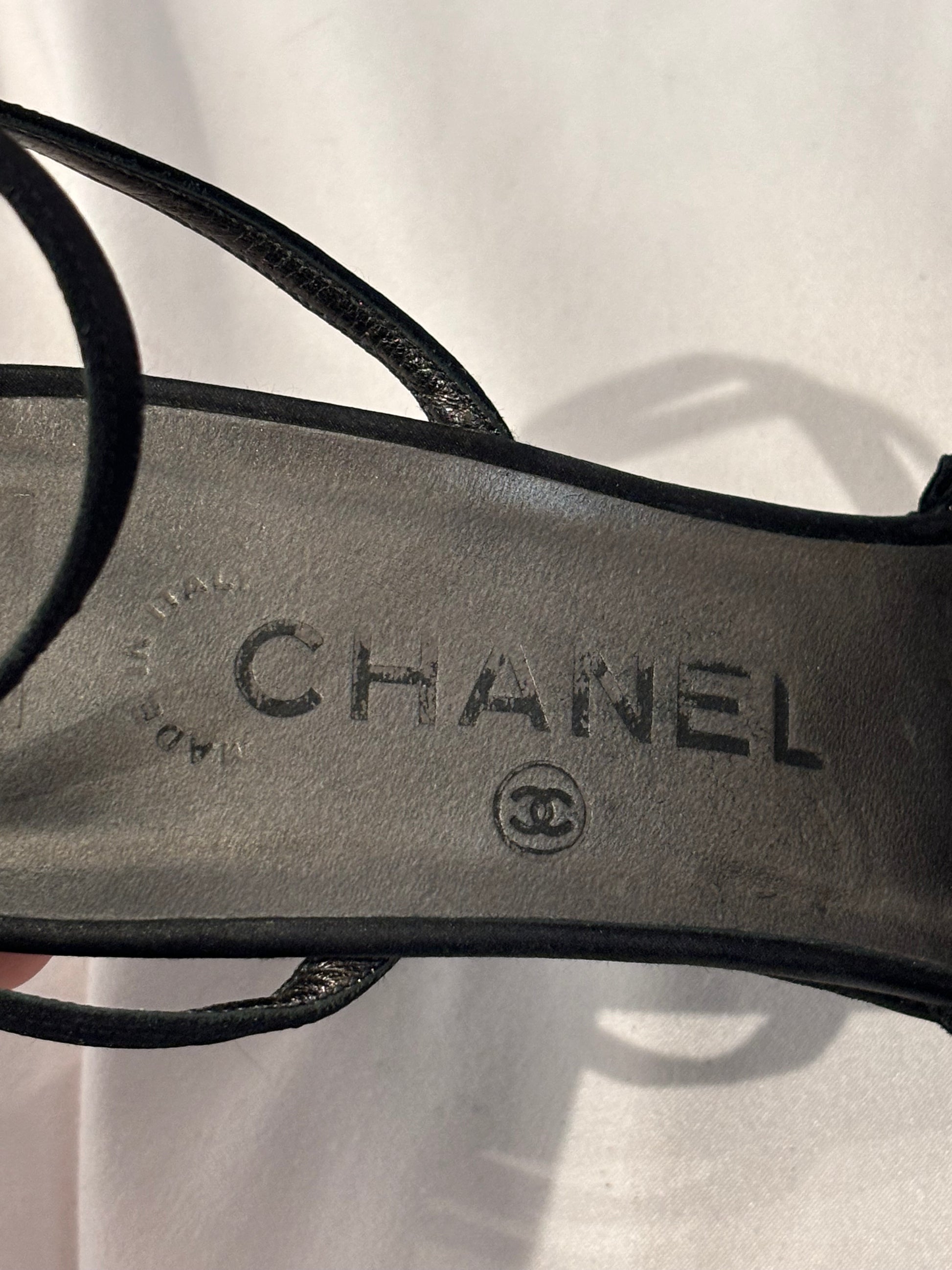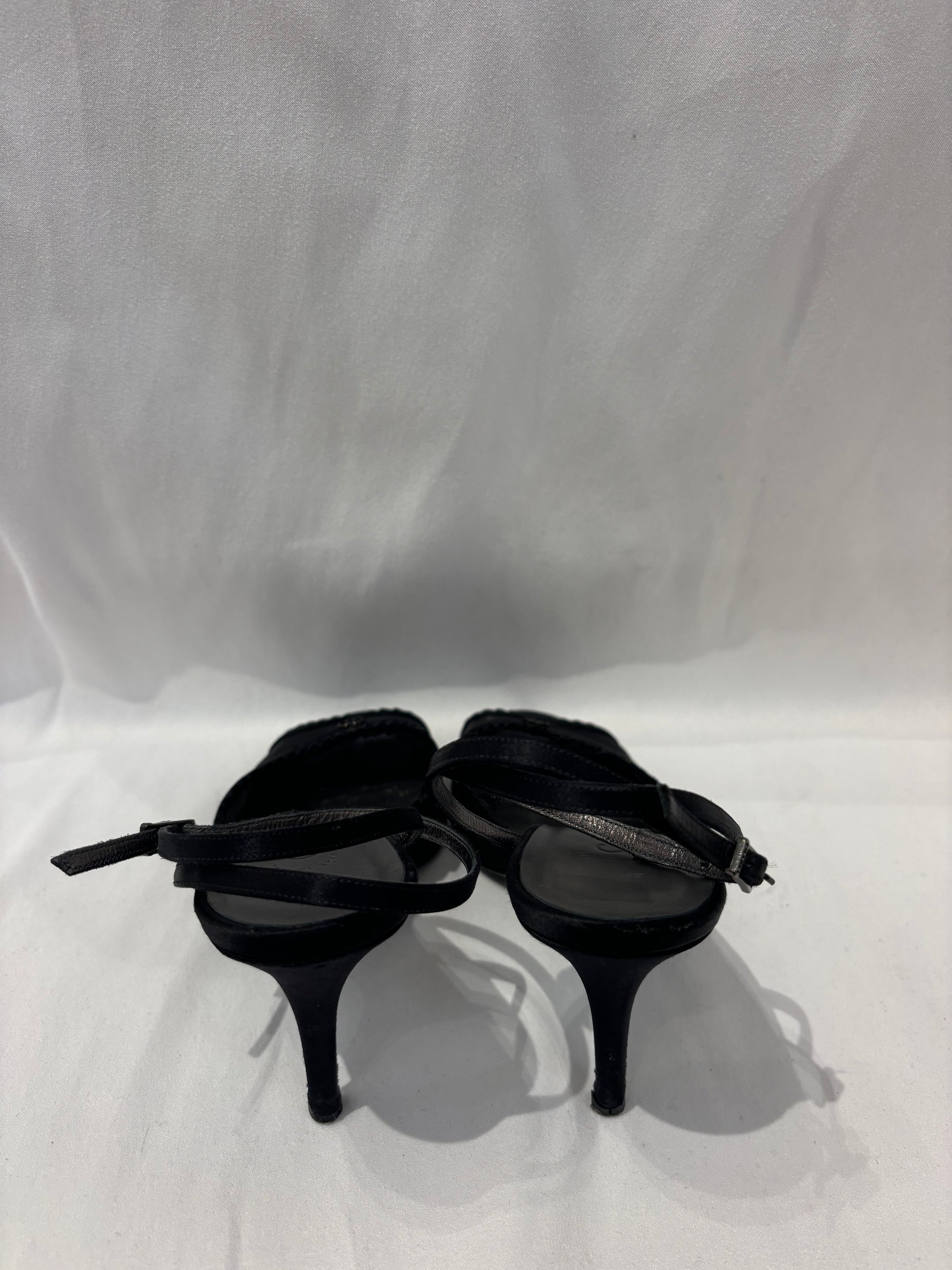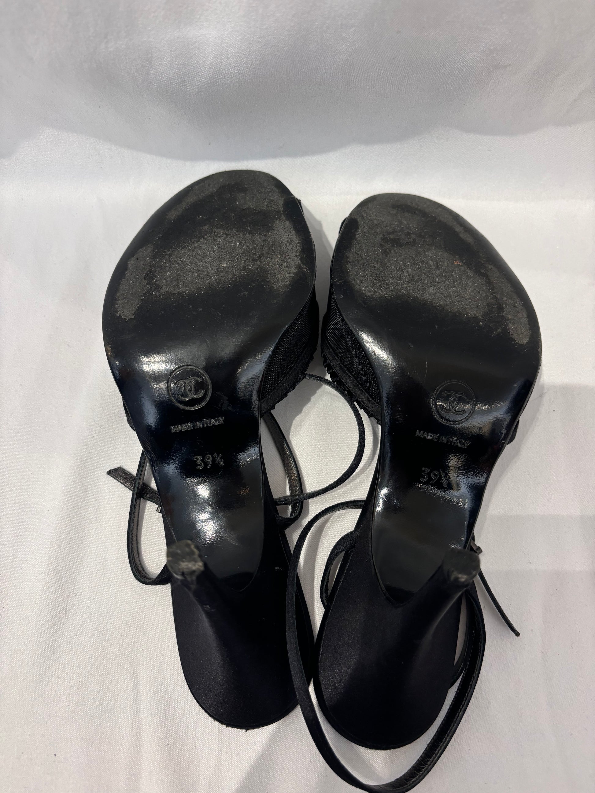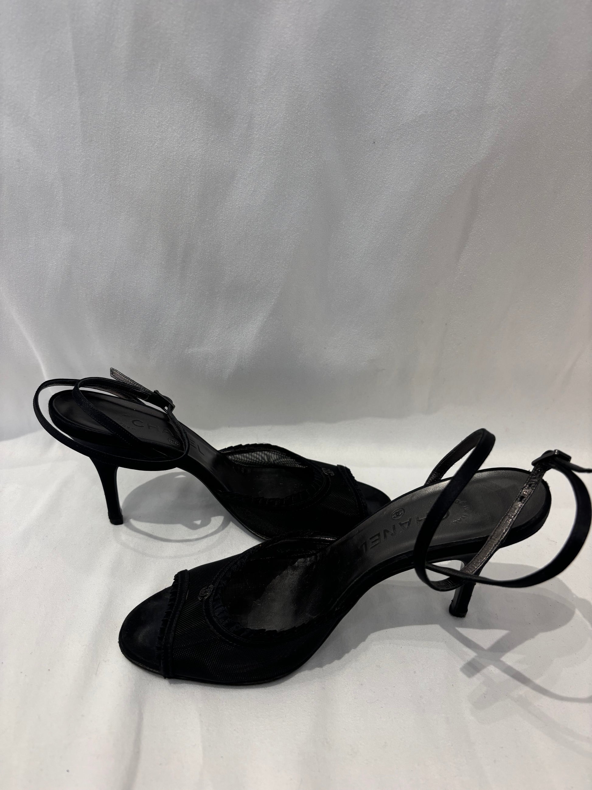 Chanel Black Mesh Sandals with Pleated Trim/Ankle Wrap Strap Size 39.5