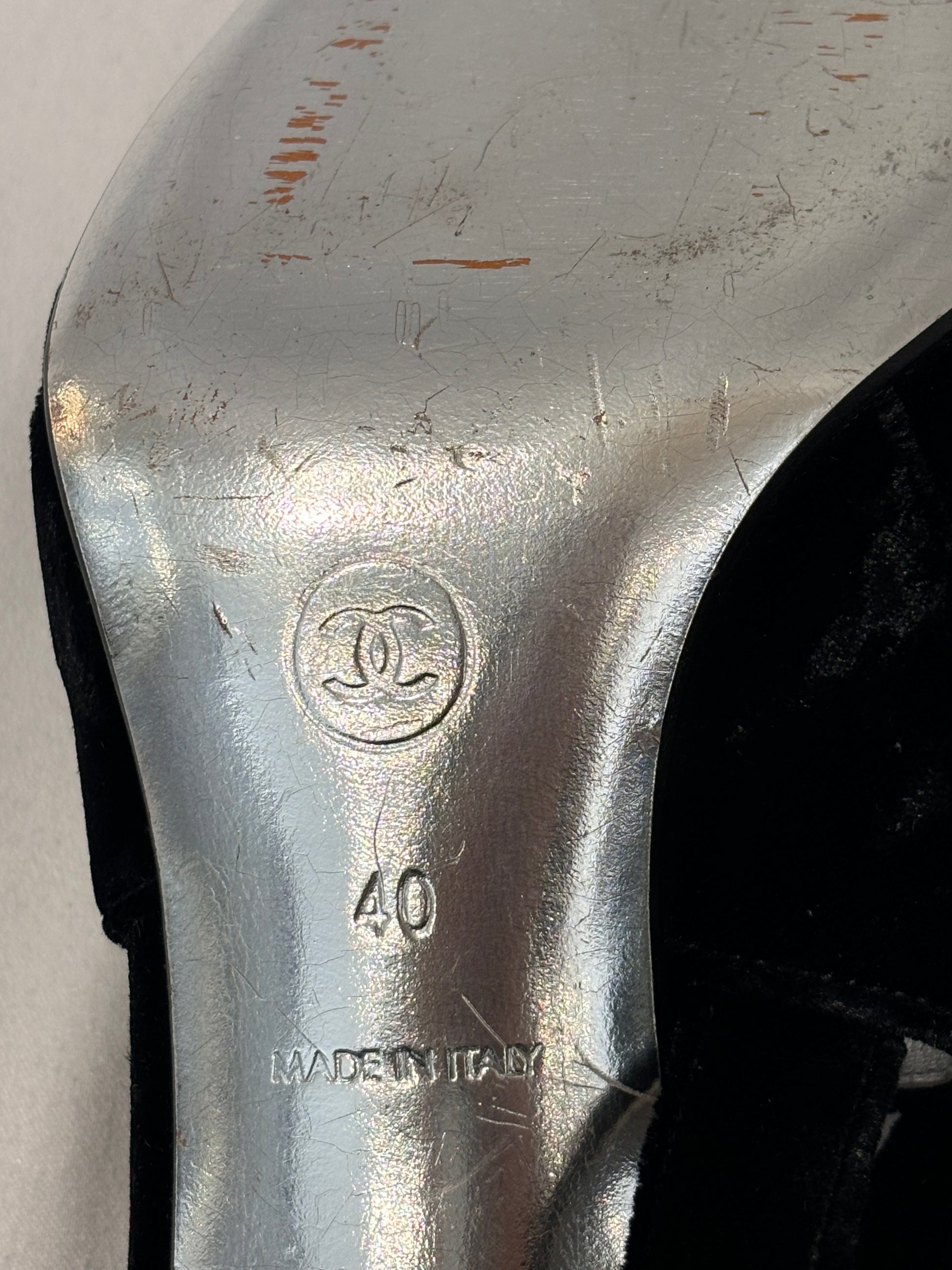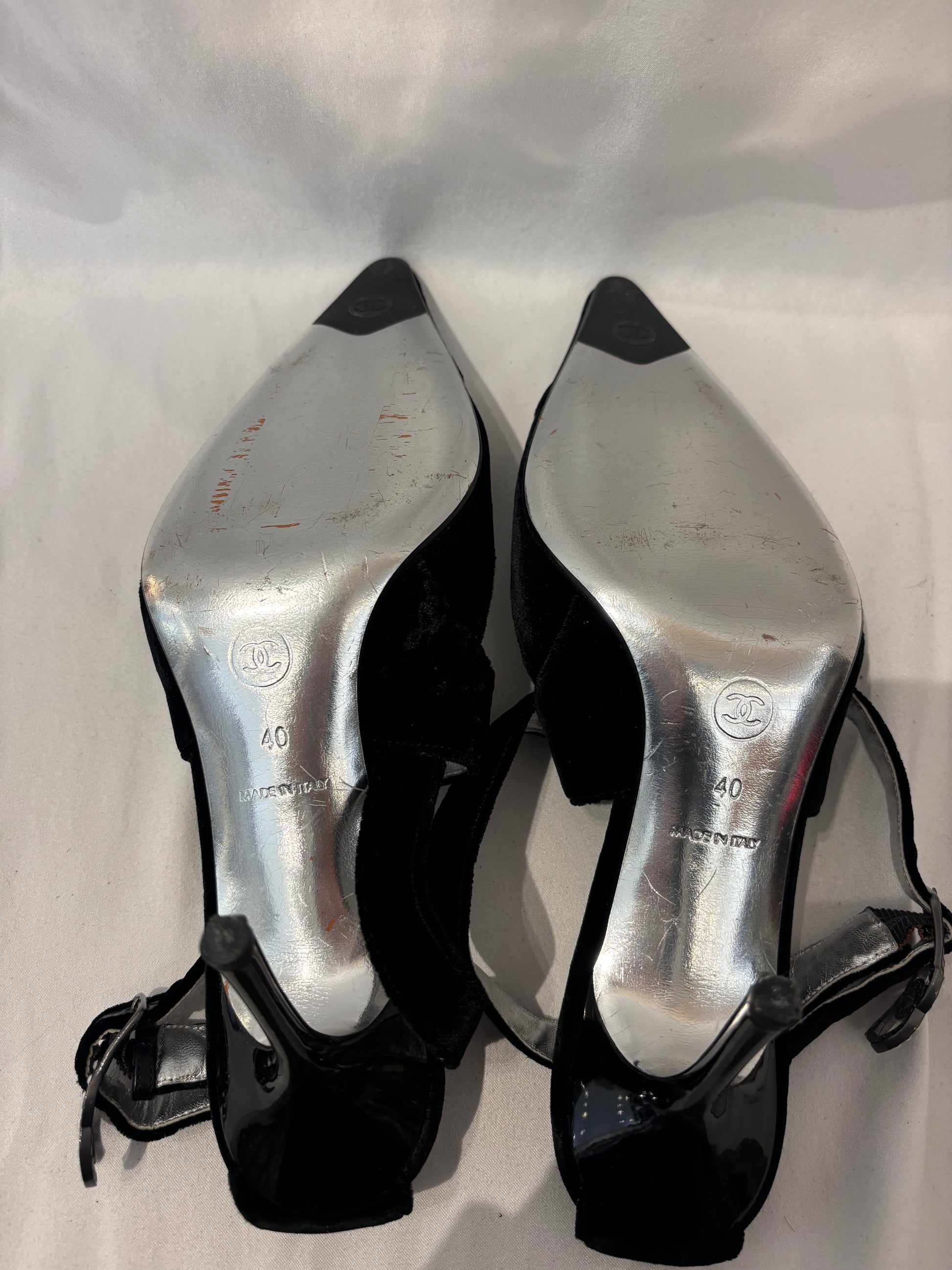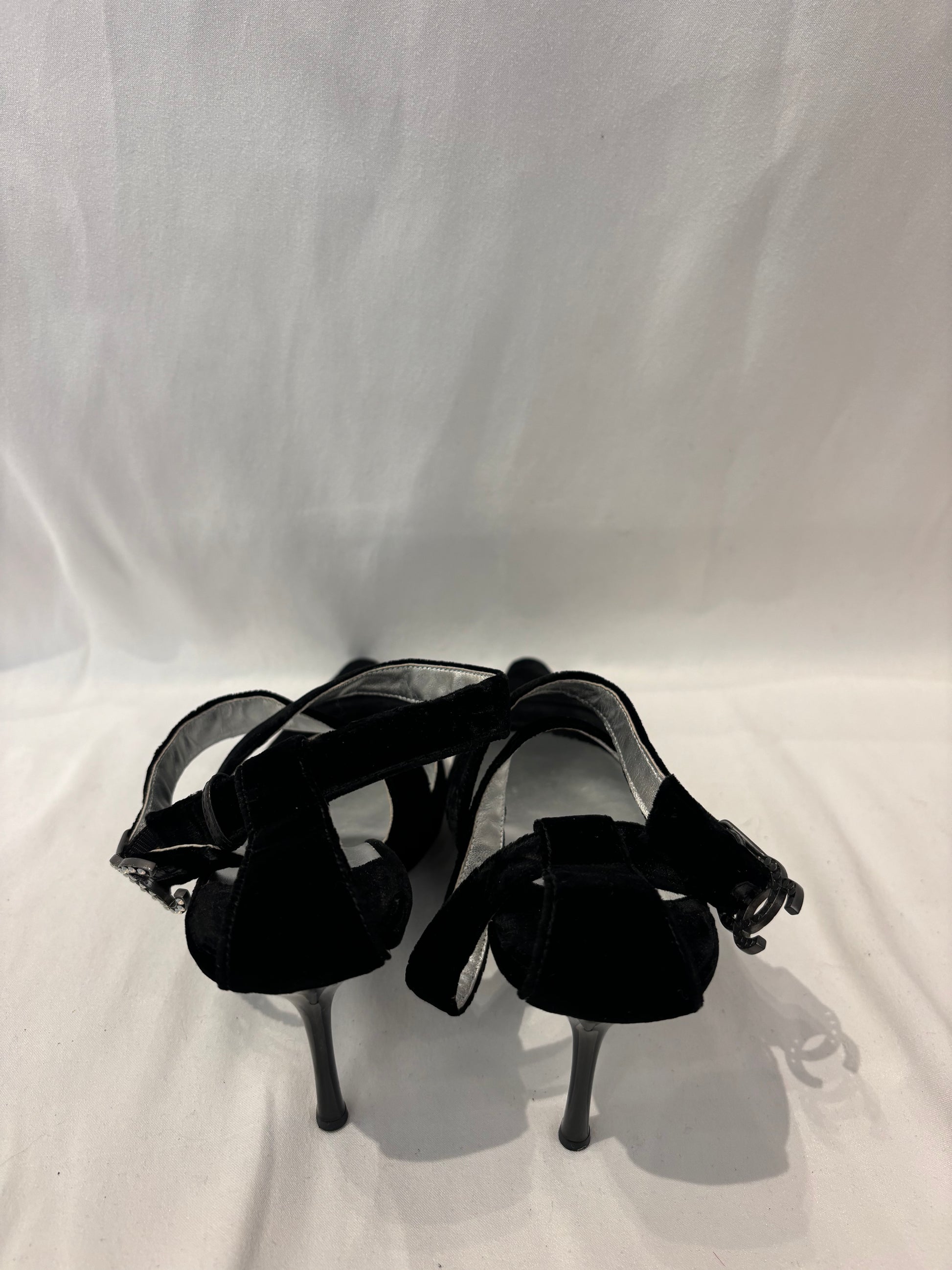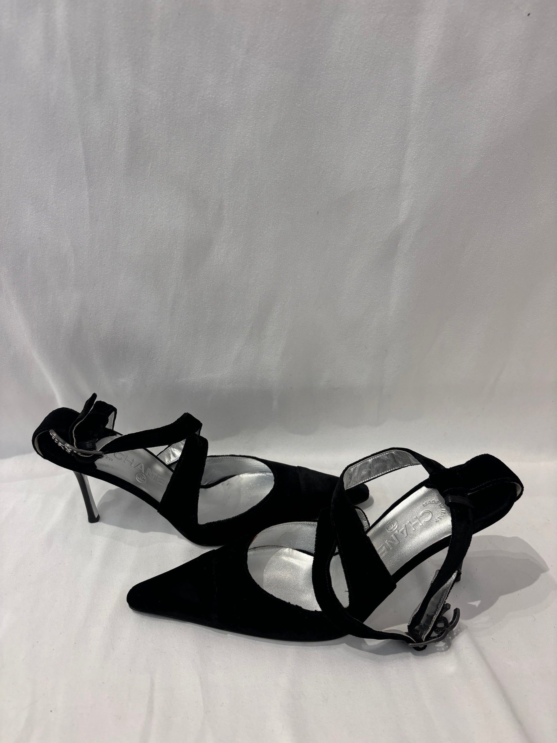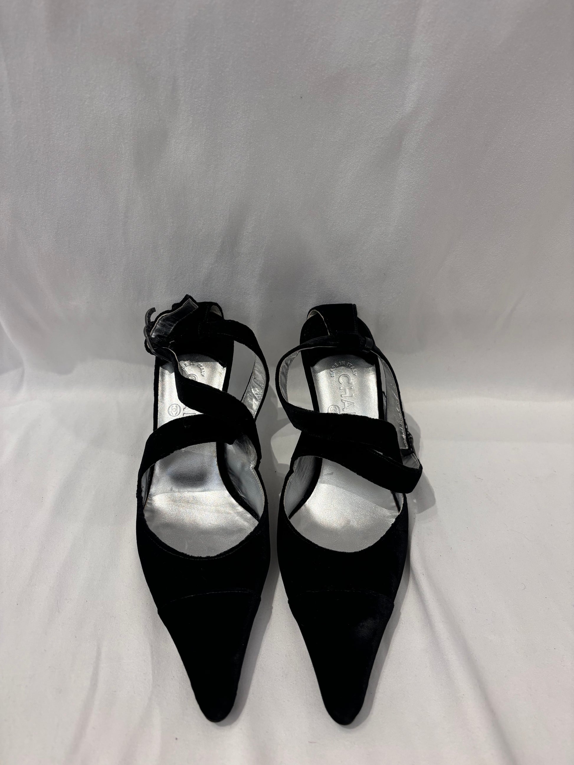Chanel Vintage Black Velvet Pointy Pumps with Crystal CC Buckle Size 40