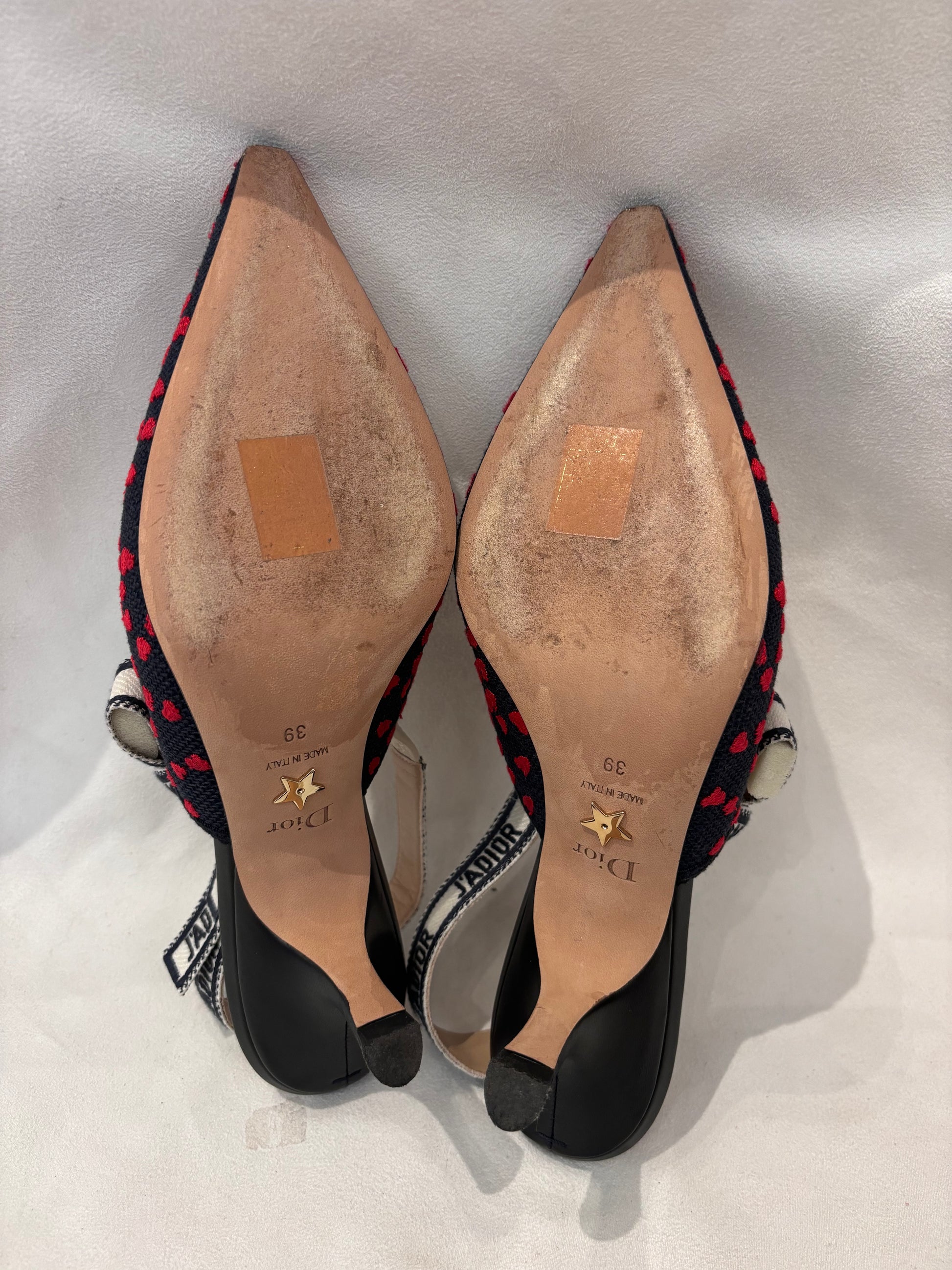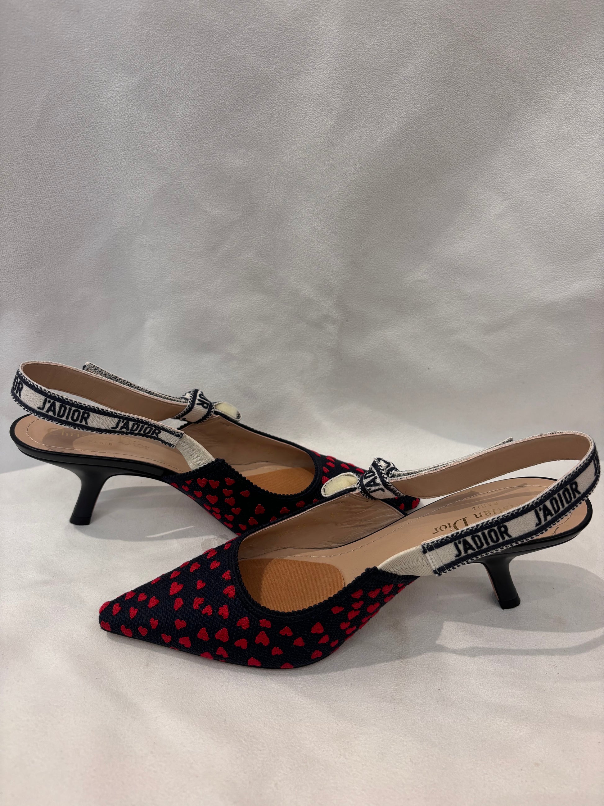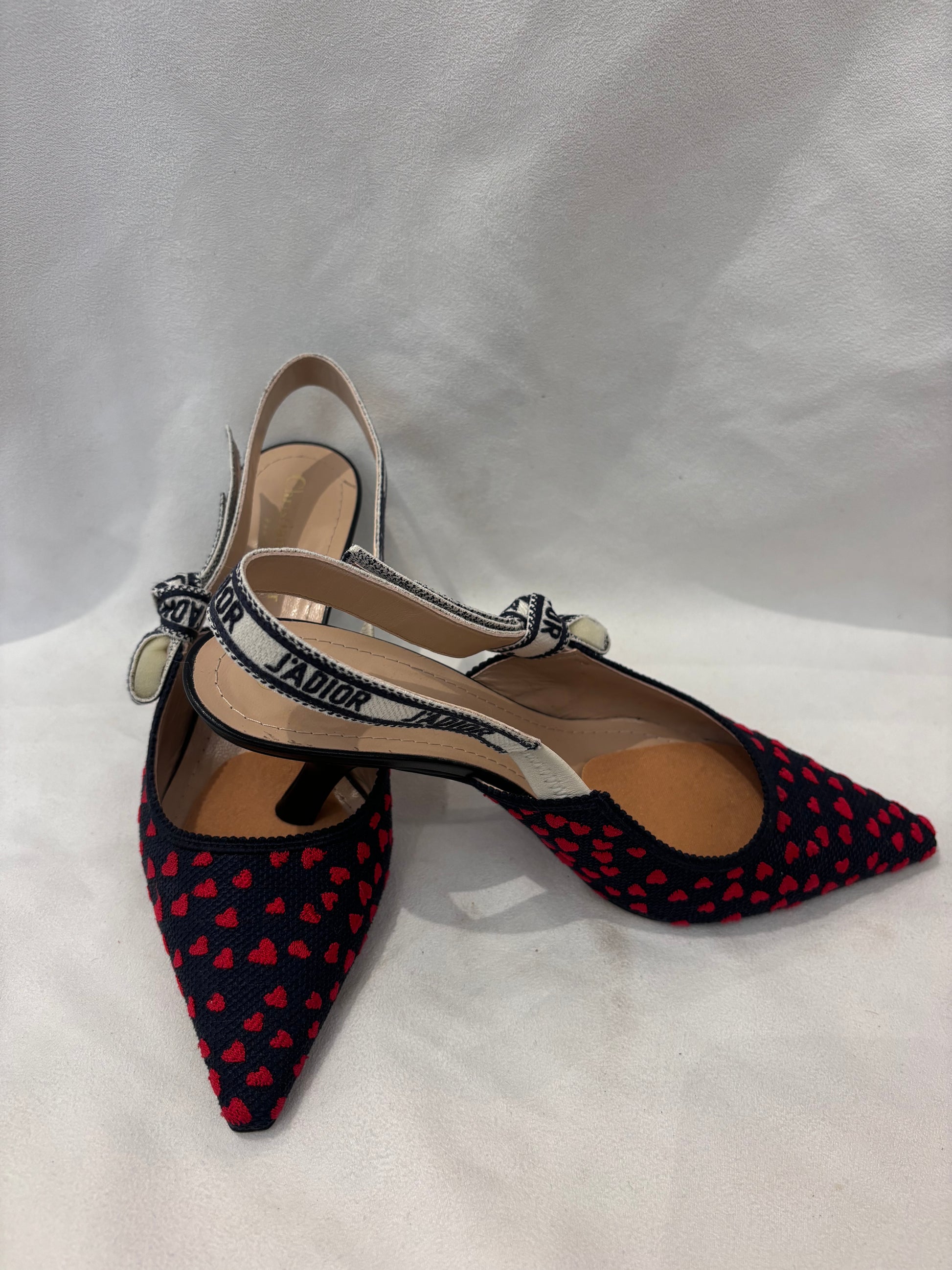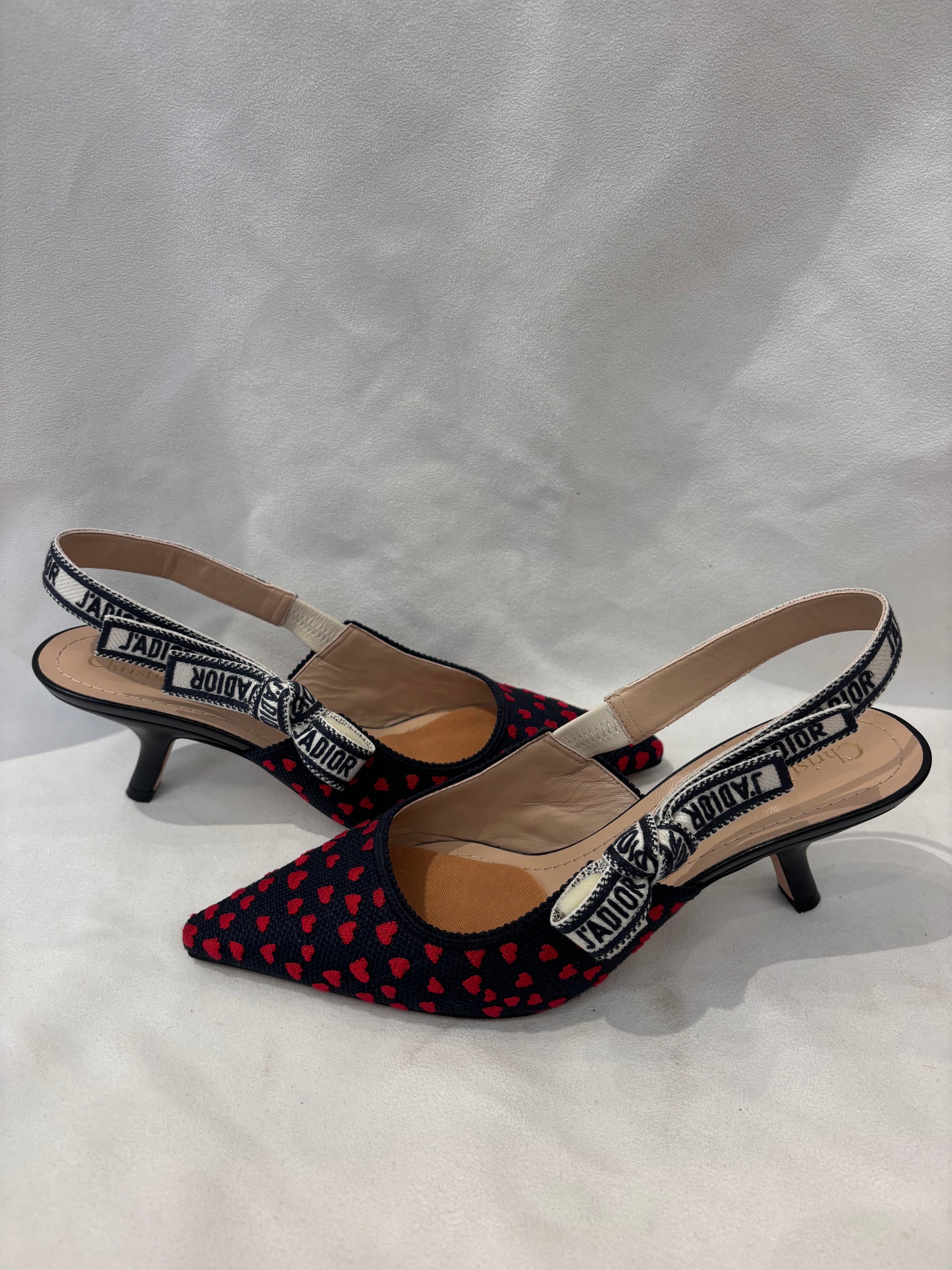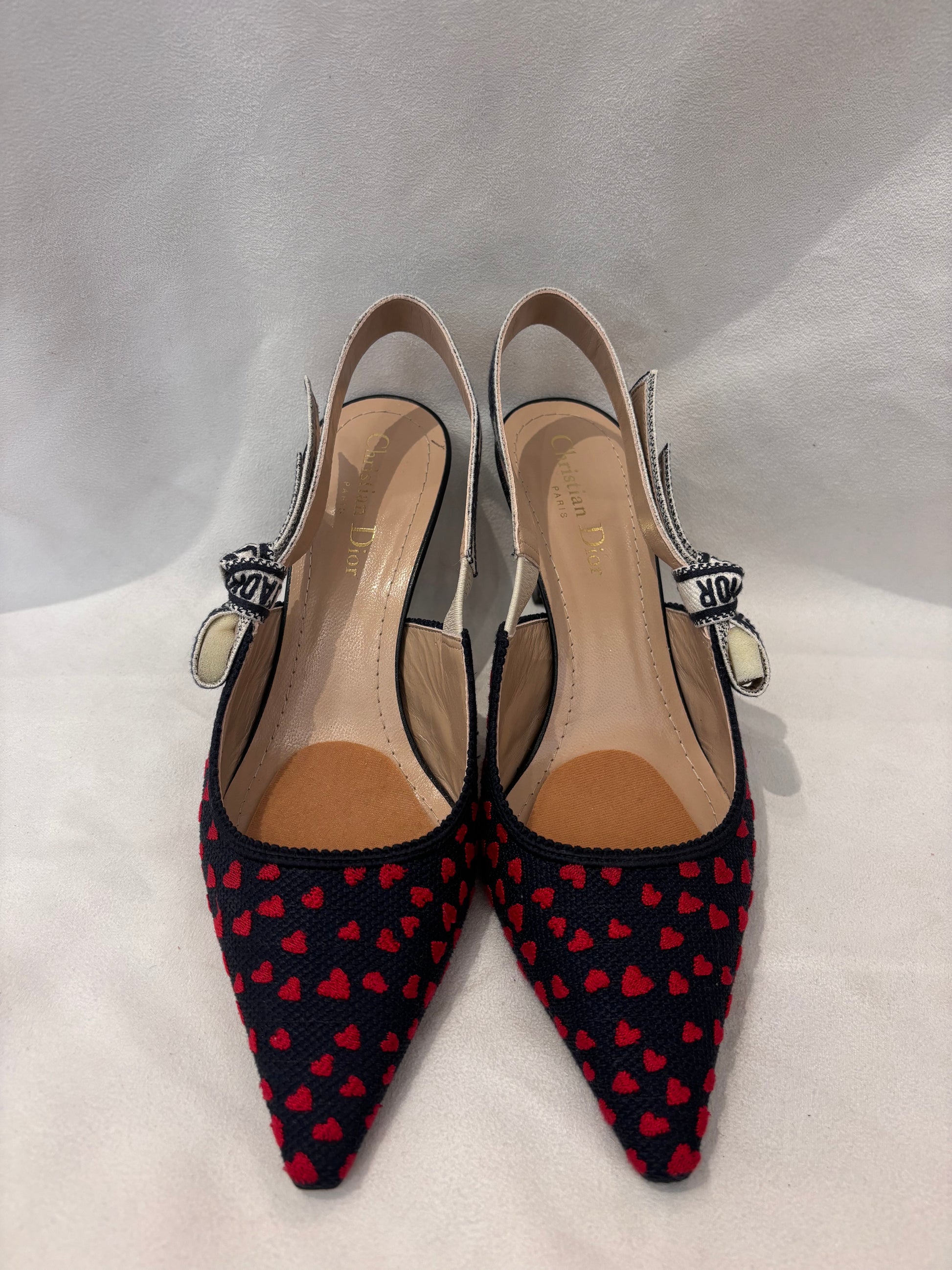 Dior Navy Canvas Slingback with Embroidered Red Hearts Size 39