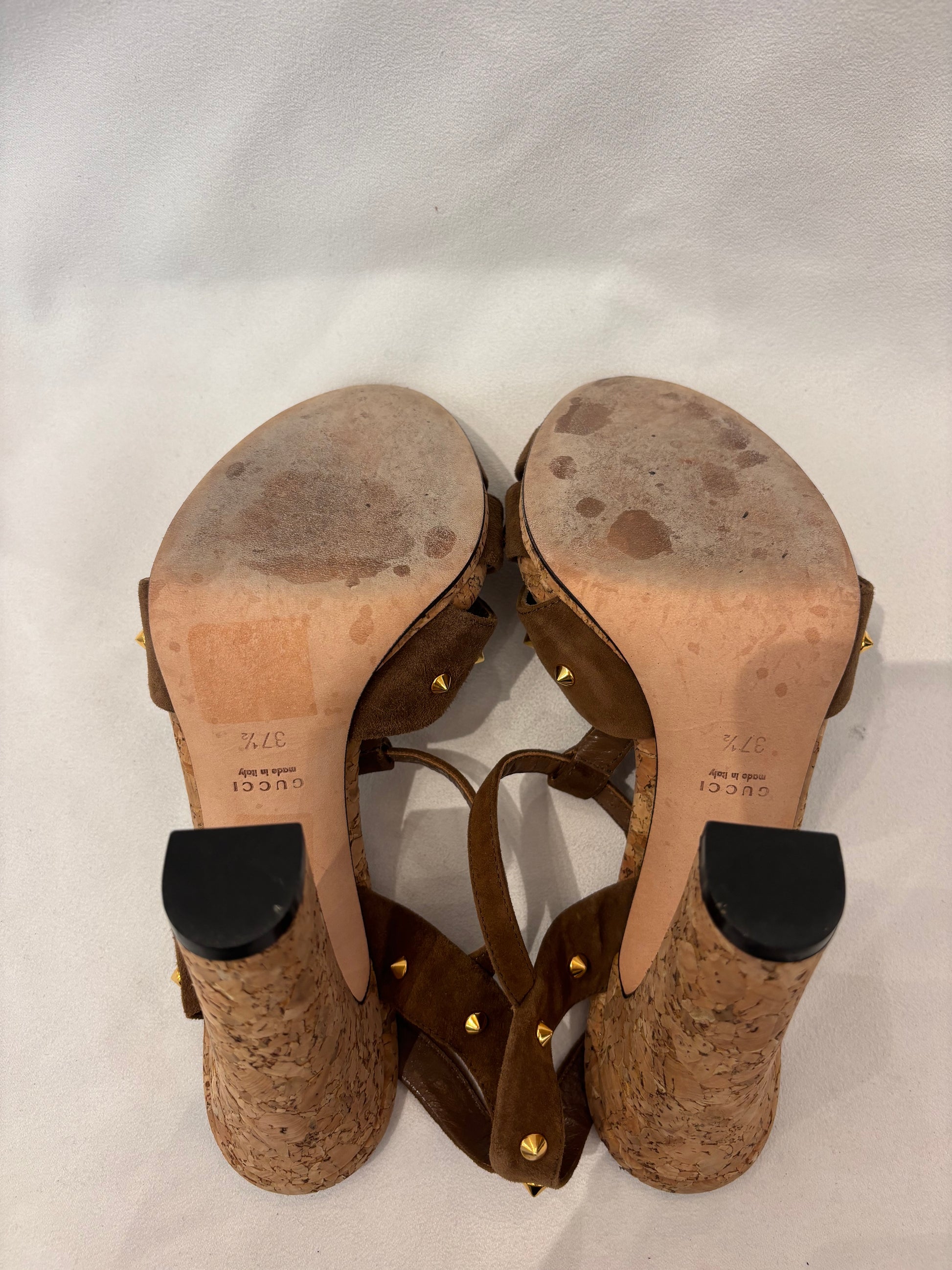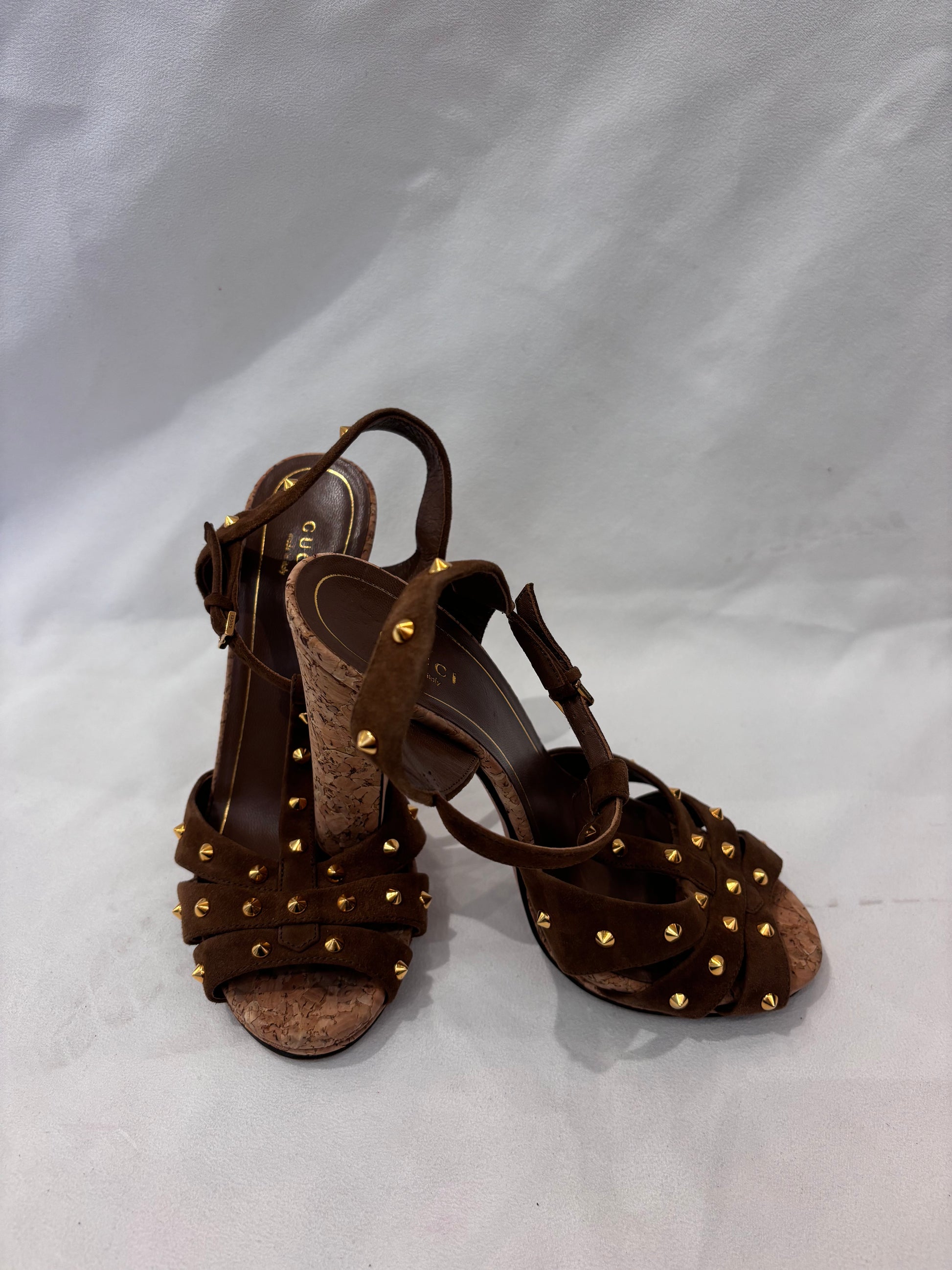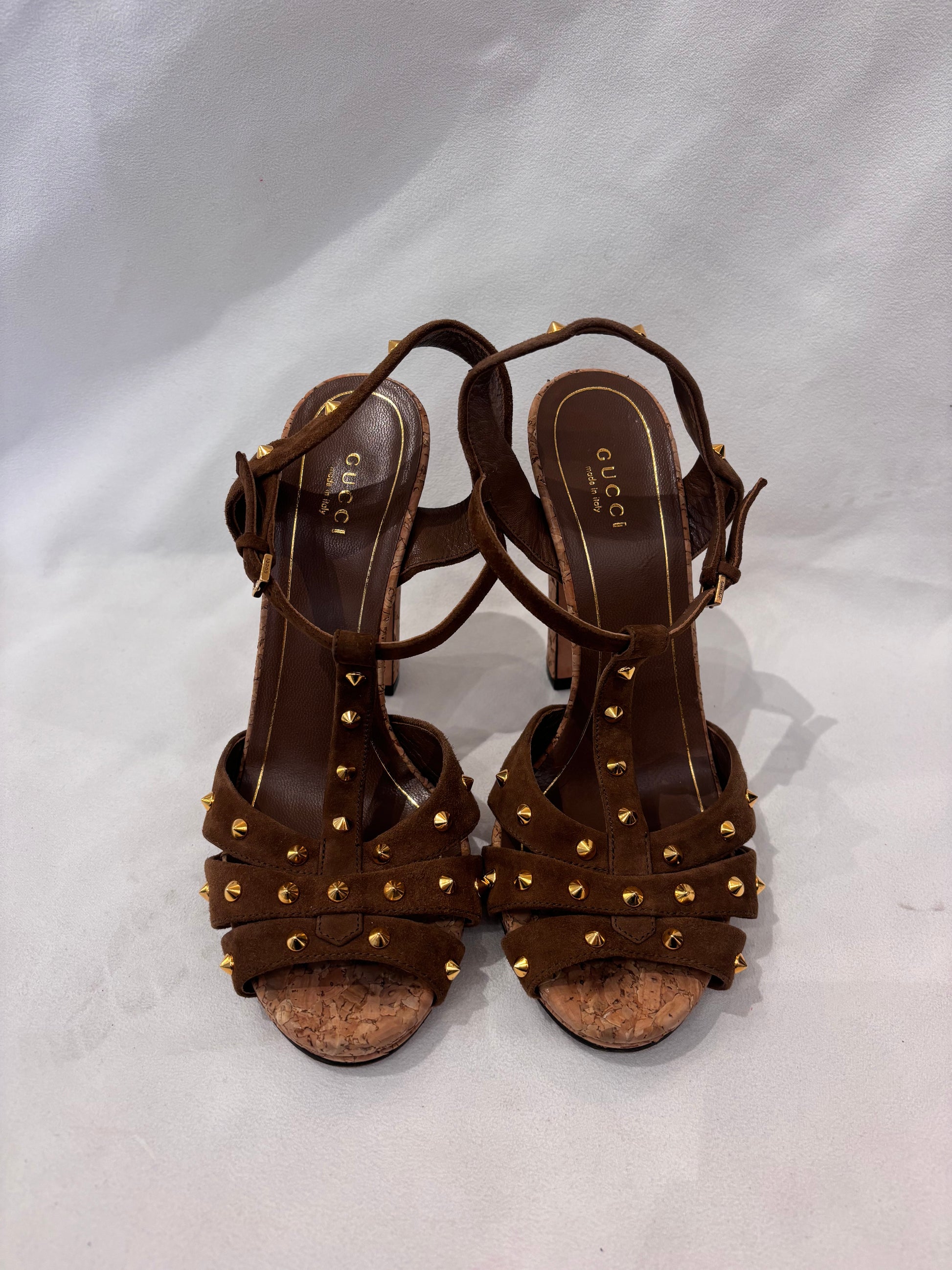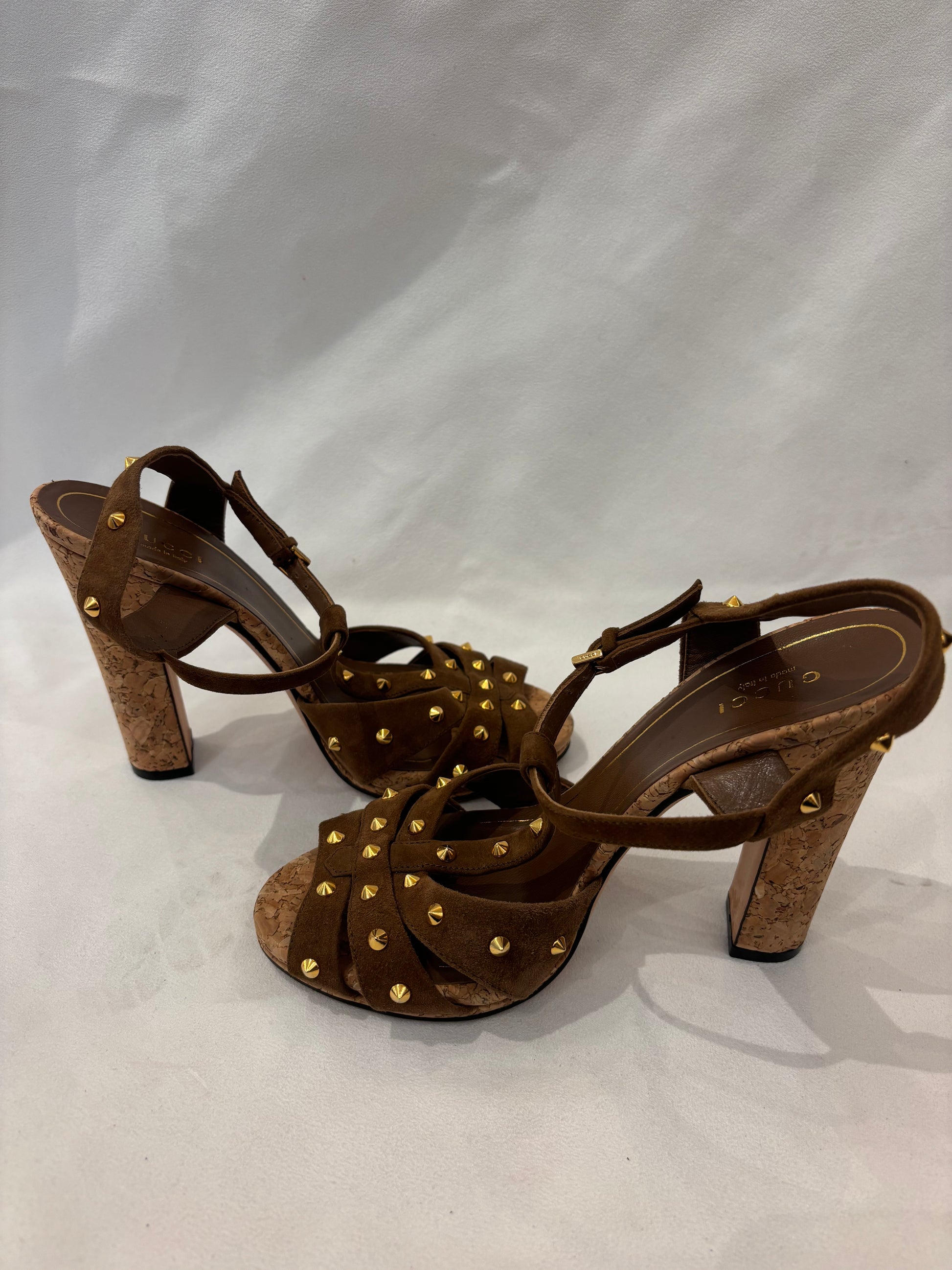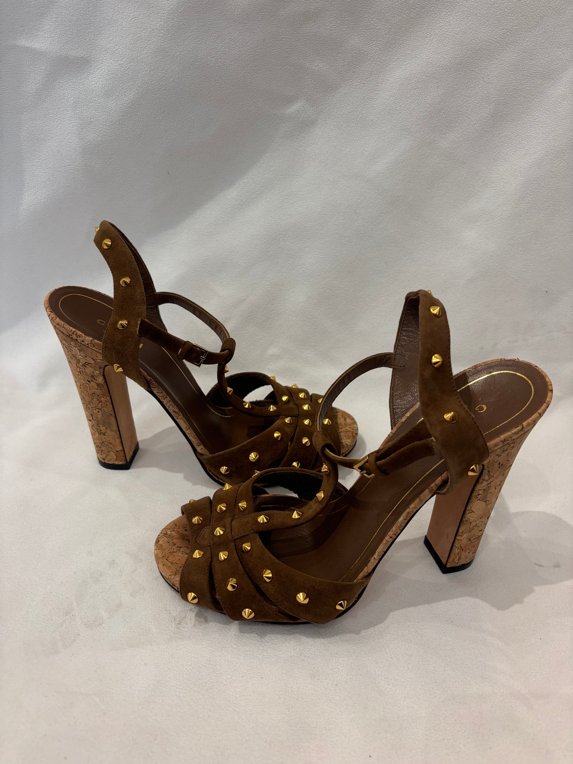 Tobacco Suede Sandals with Cork Heel/Gold Studs Size 37.5