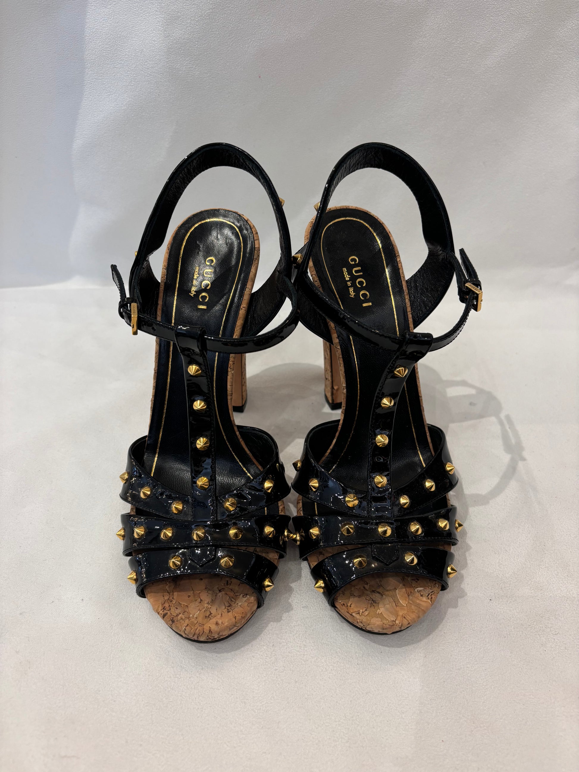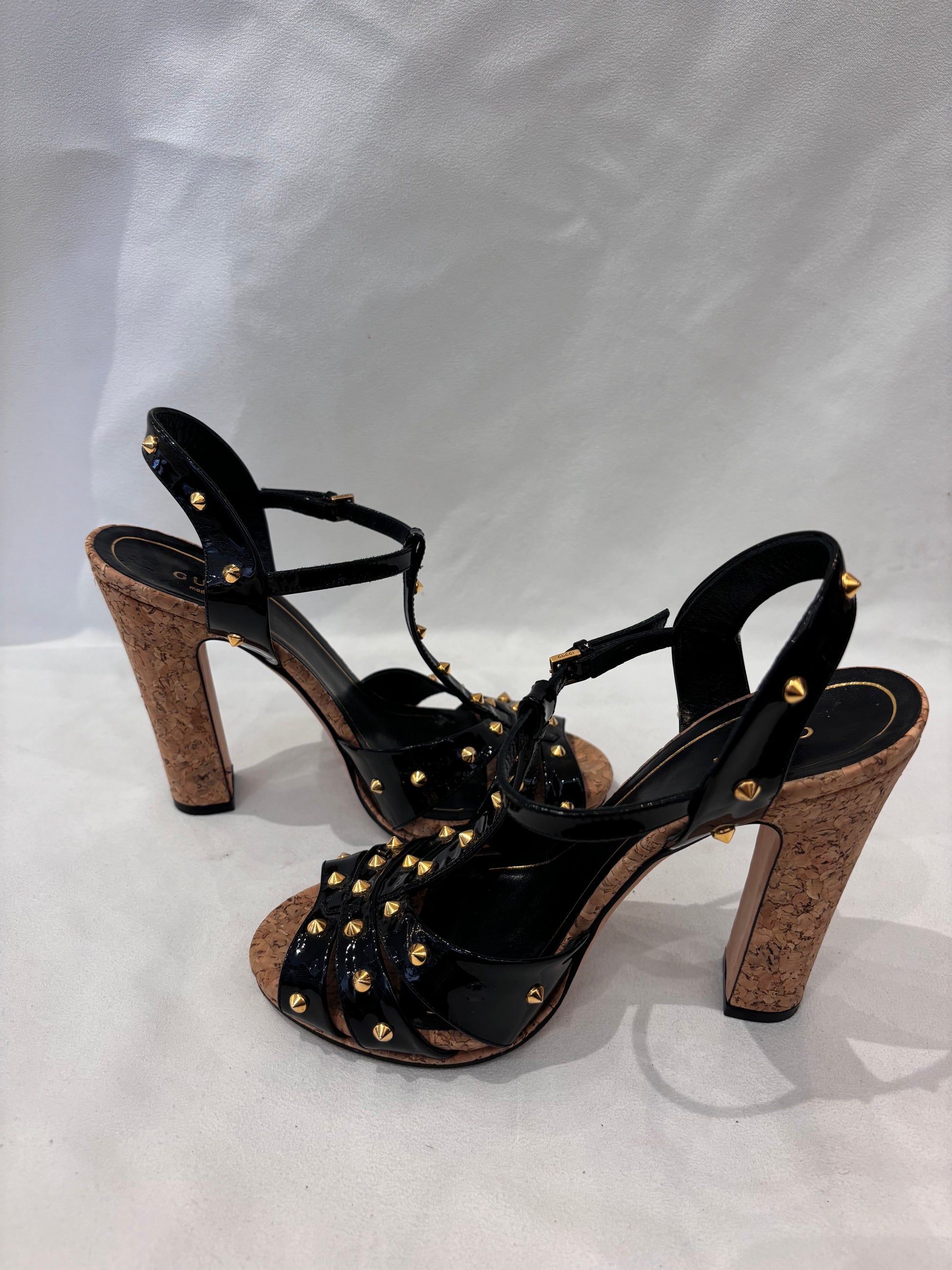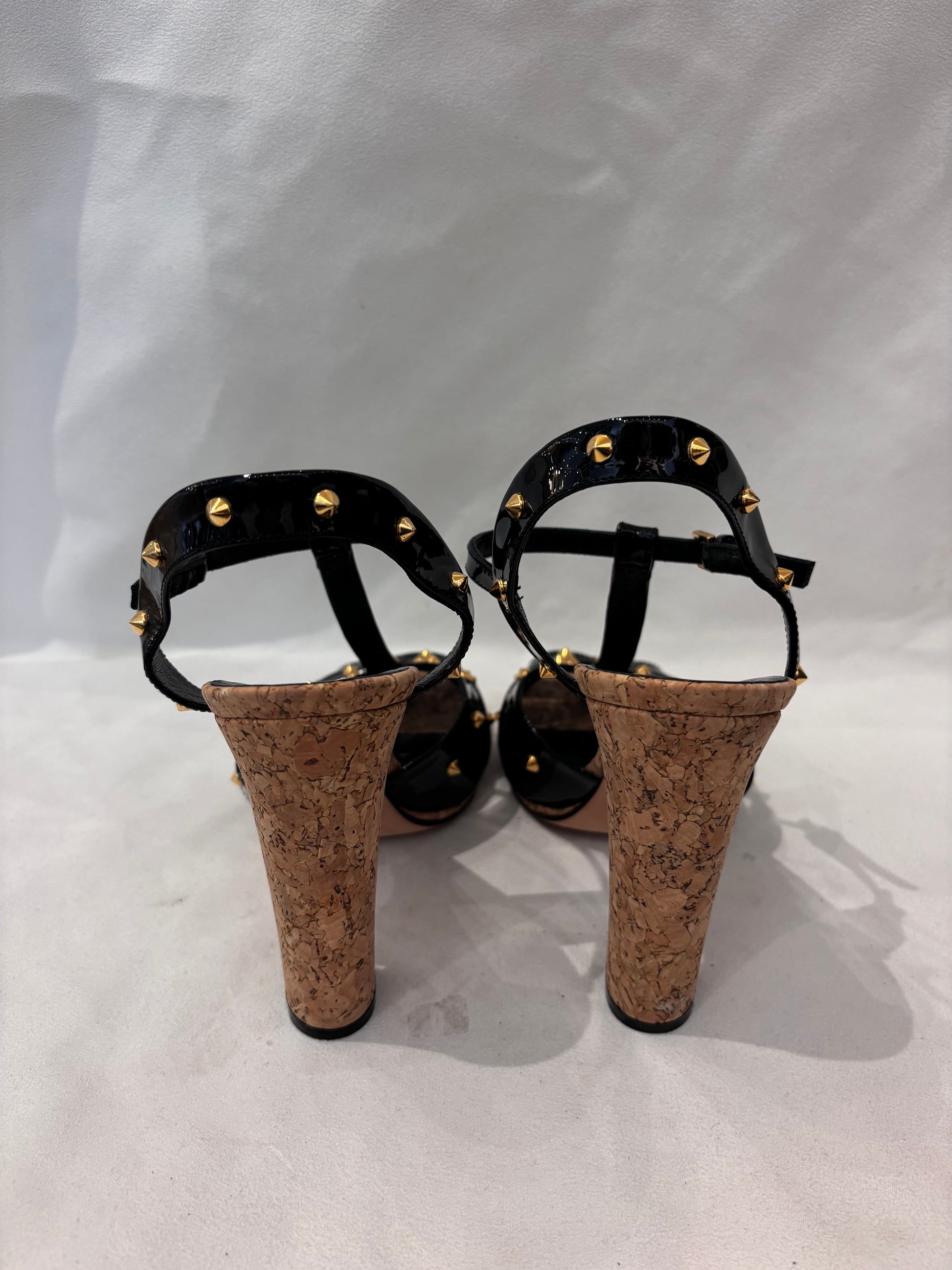 Black Patent Leather Cork Sandals with Gold Studs Size 37.5