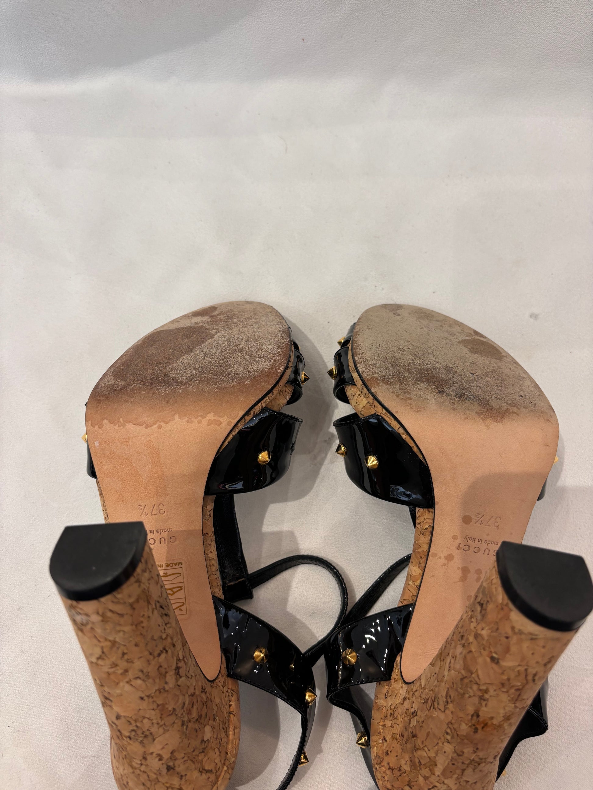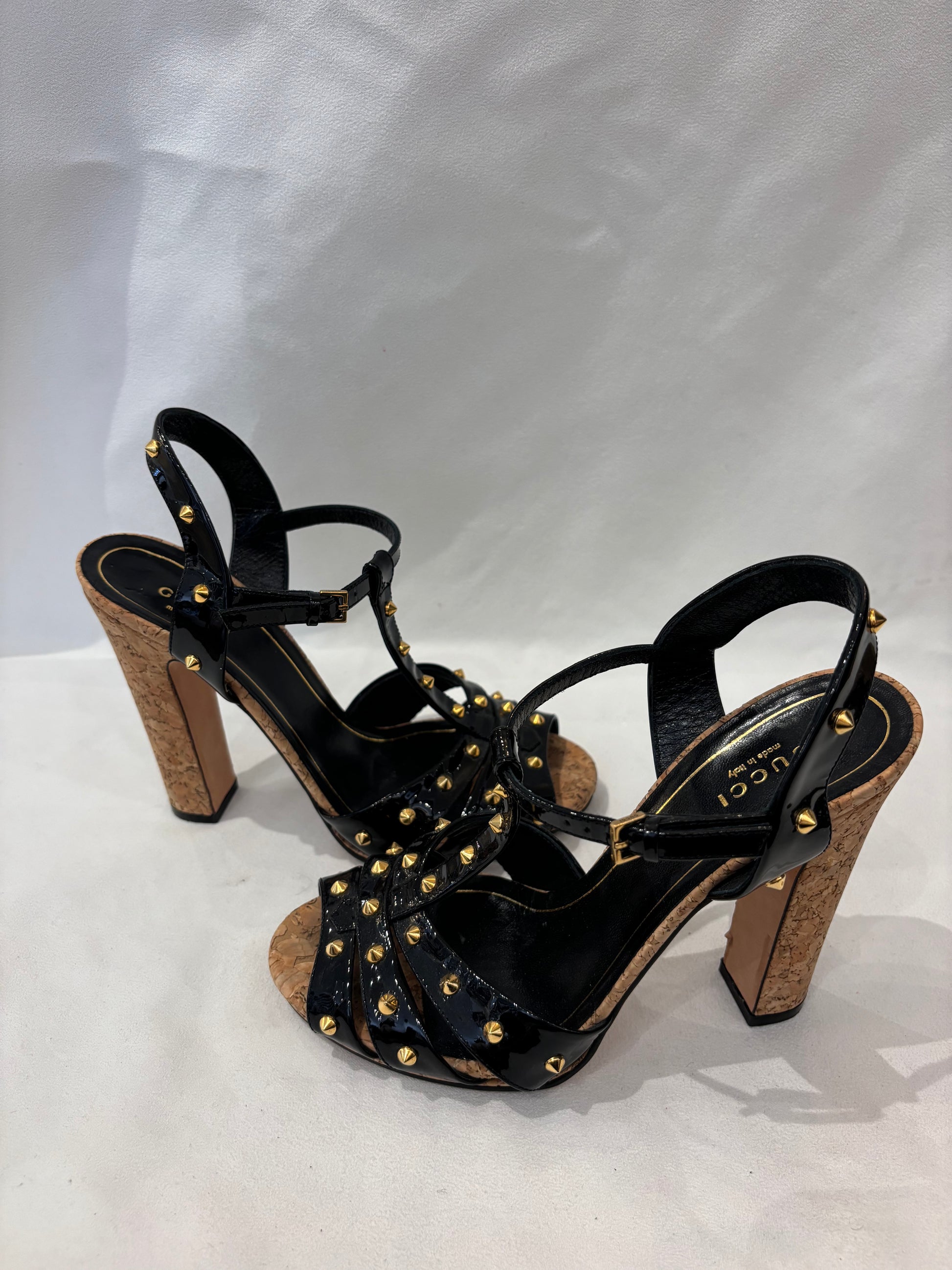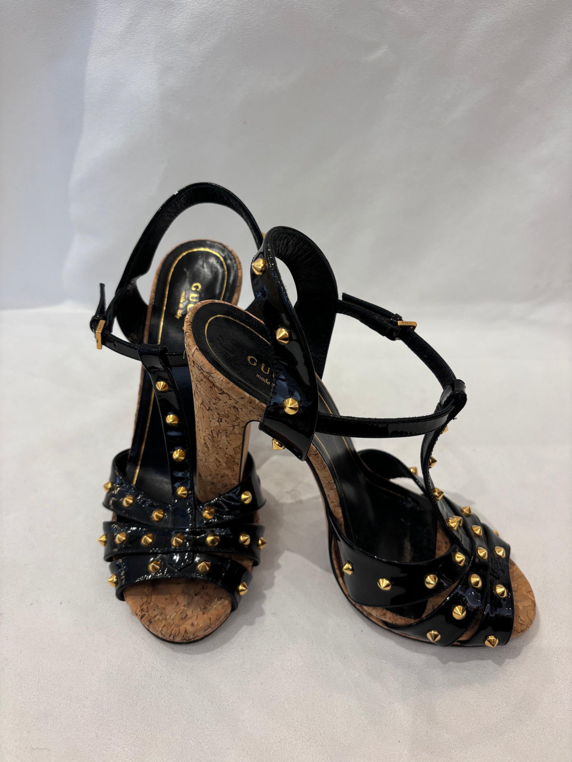 Black Patent Leather Cork Sandals with Gold Studs Size 37.5
