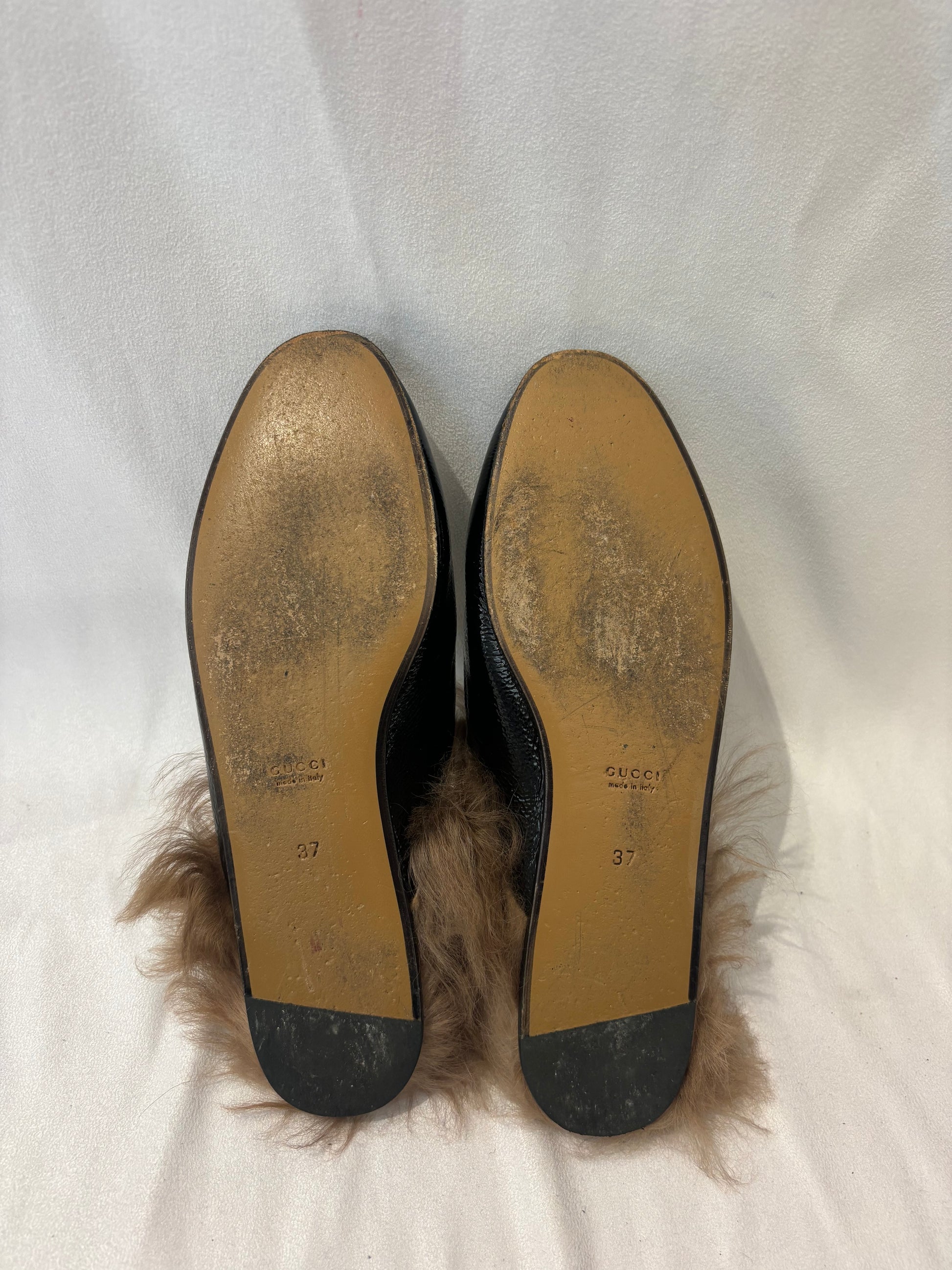 Gucci Black Patent Leather Princetown Fur Lined Mules Size 37