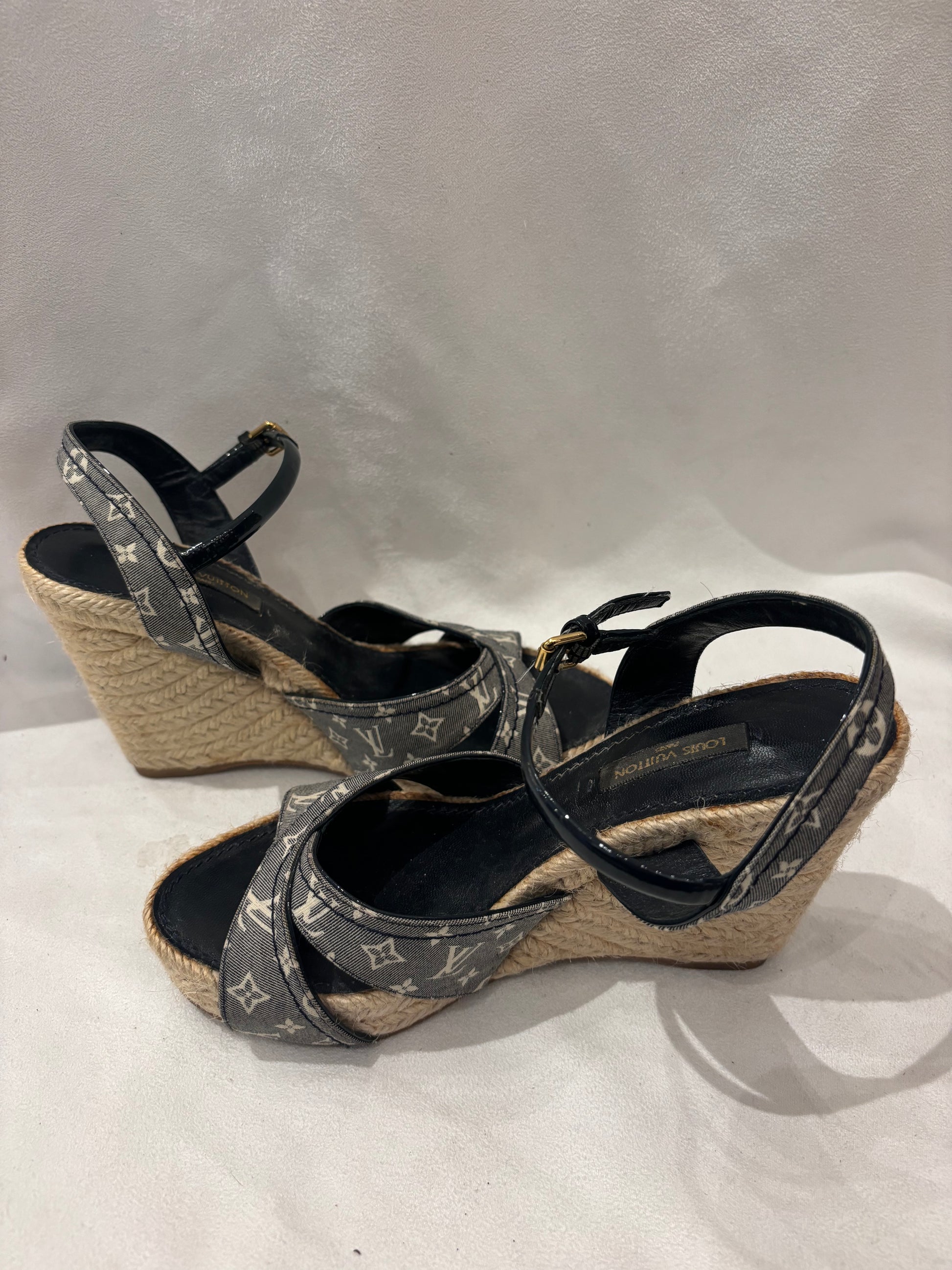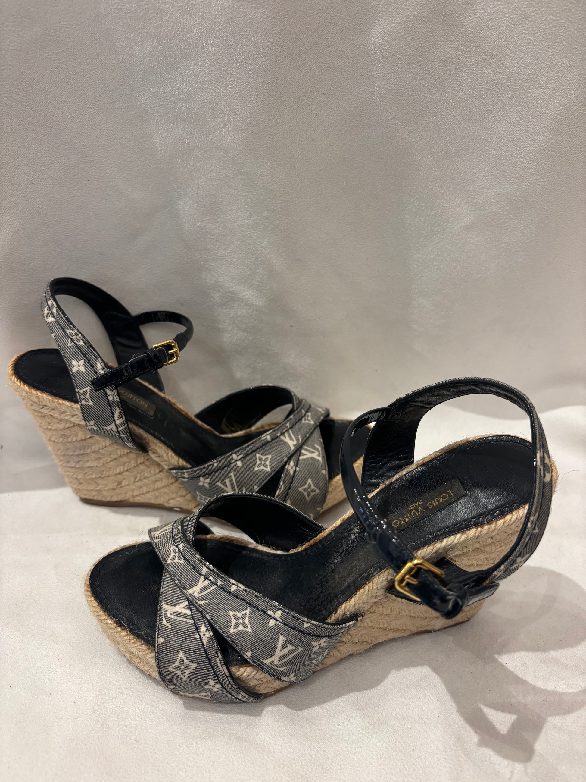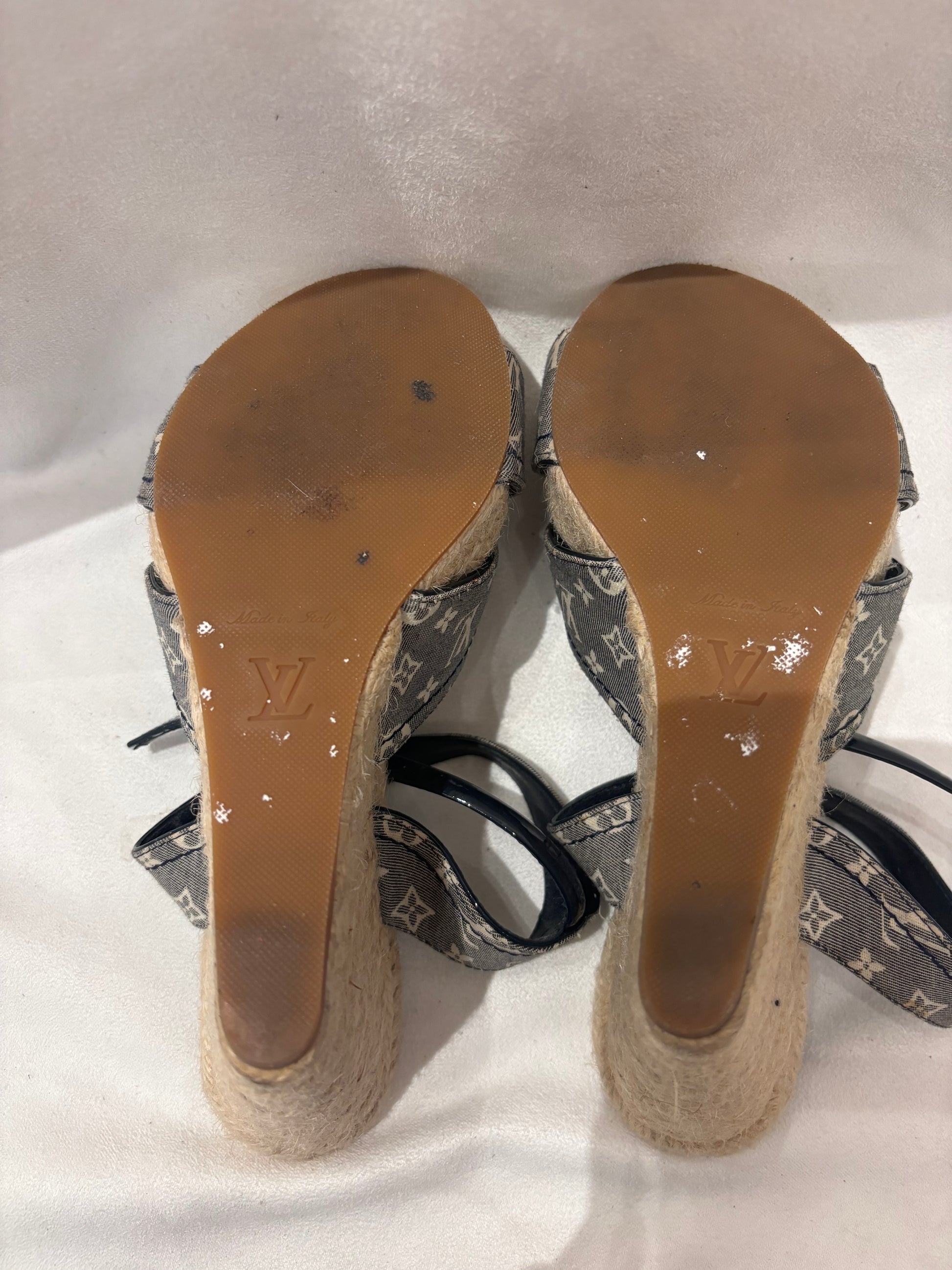 Louis Vuitton Blue/Grey and White Monogram Canvas Cross Strap Wedges Size 36