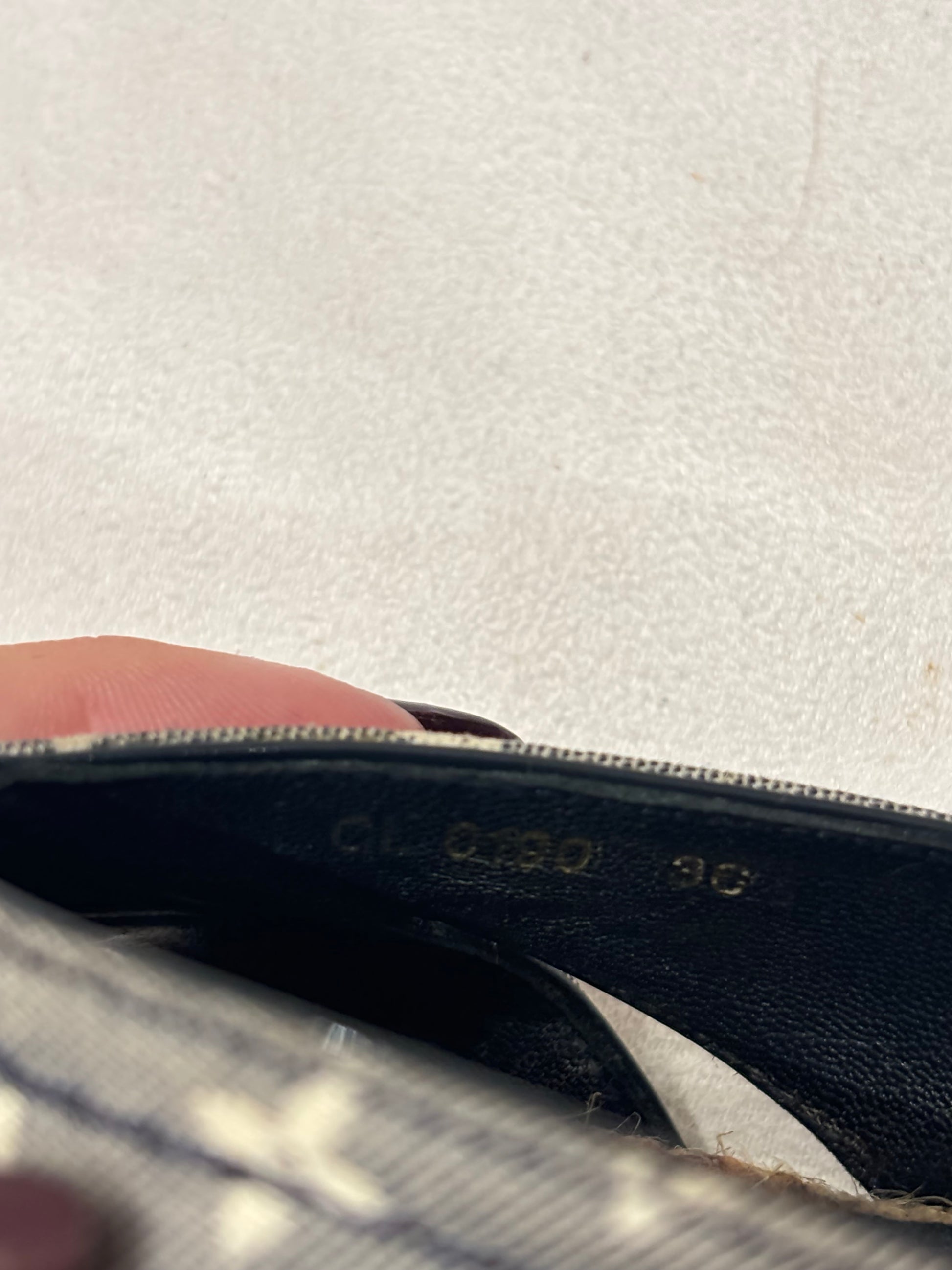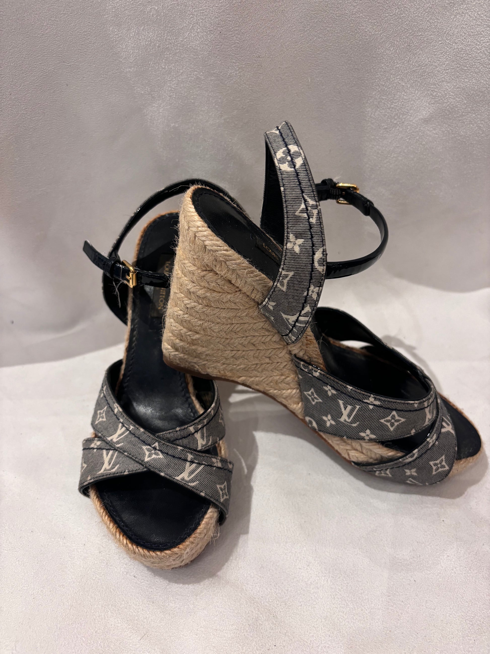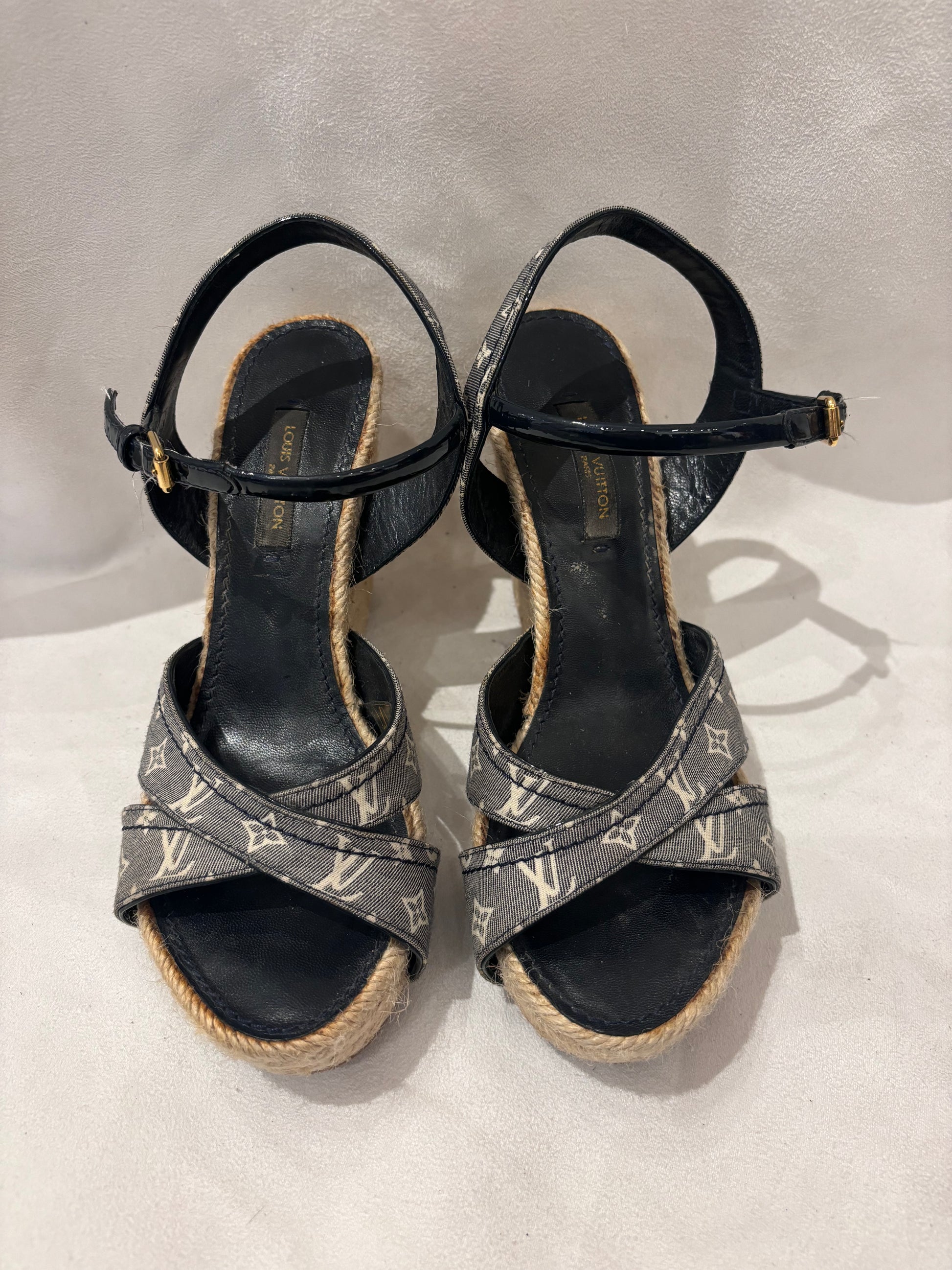Louis Vuitton Blue/Grey and White Monogram Canvas Cross Strap Wedges Size 36