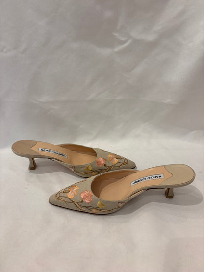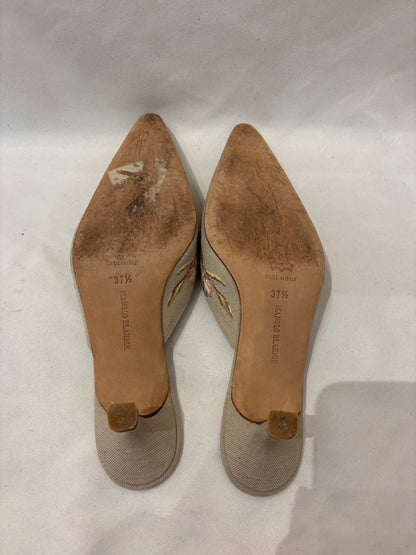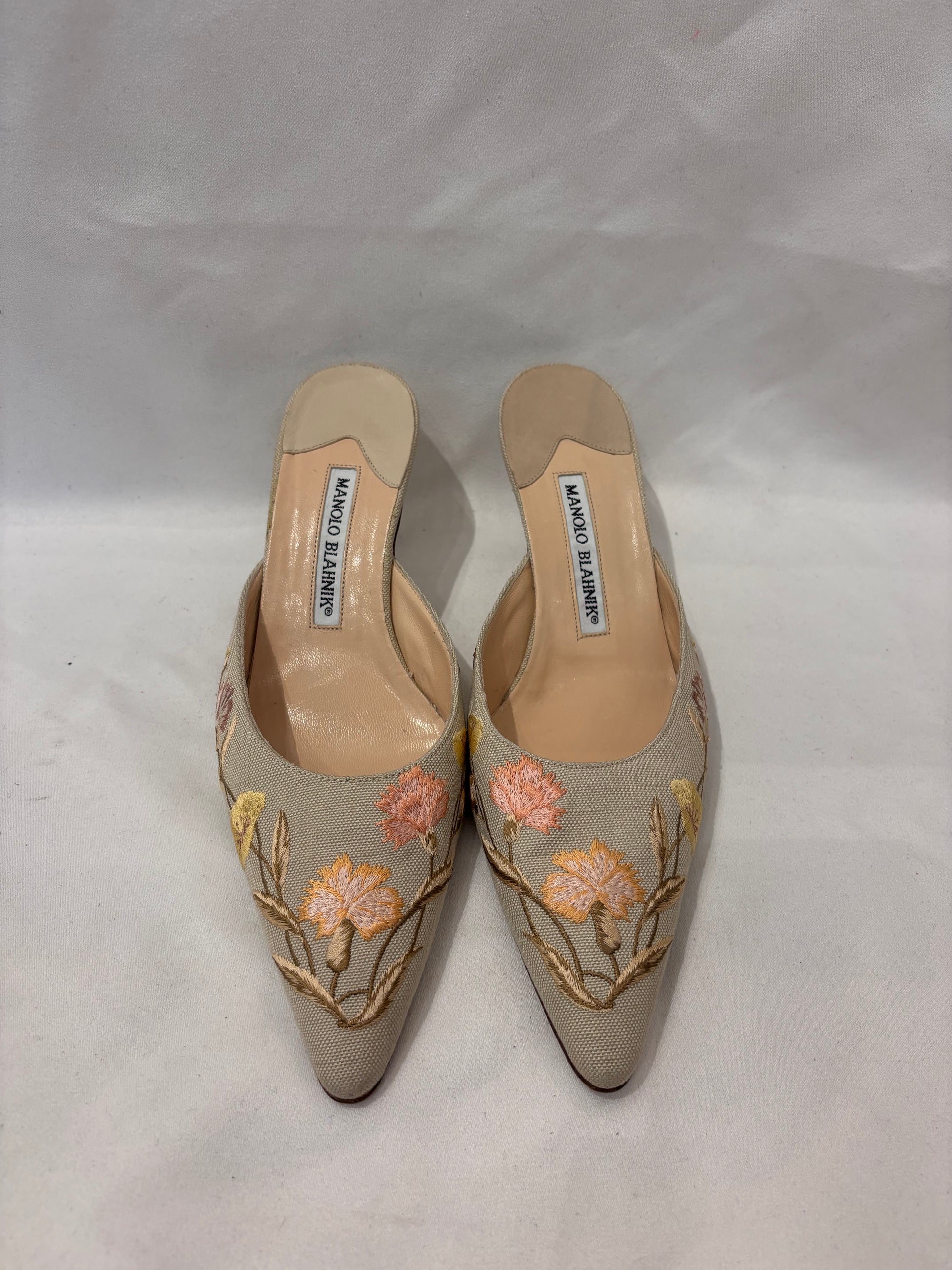 Manolo Blahnik Beige Linen Kitten Heel Mules with Embroidered Flowers Size 37.5