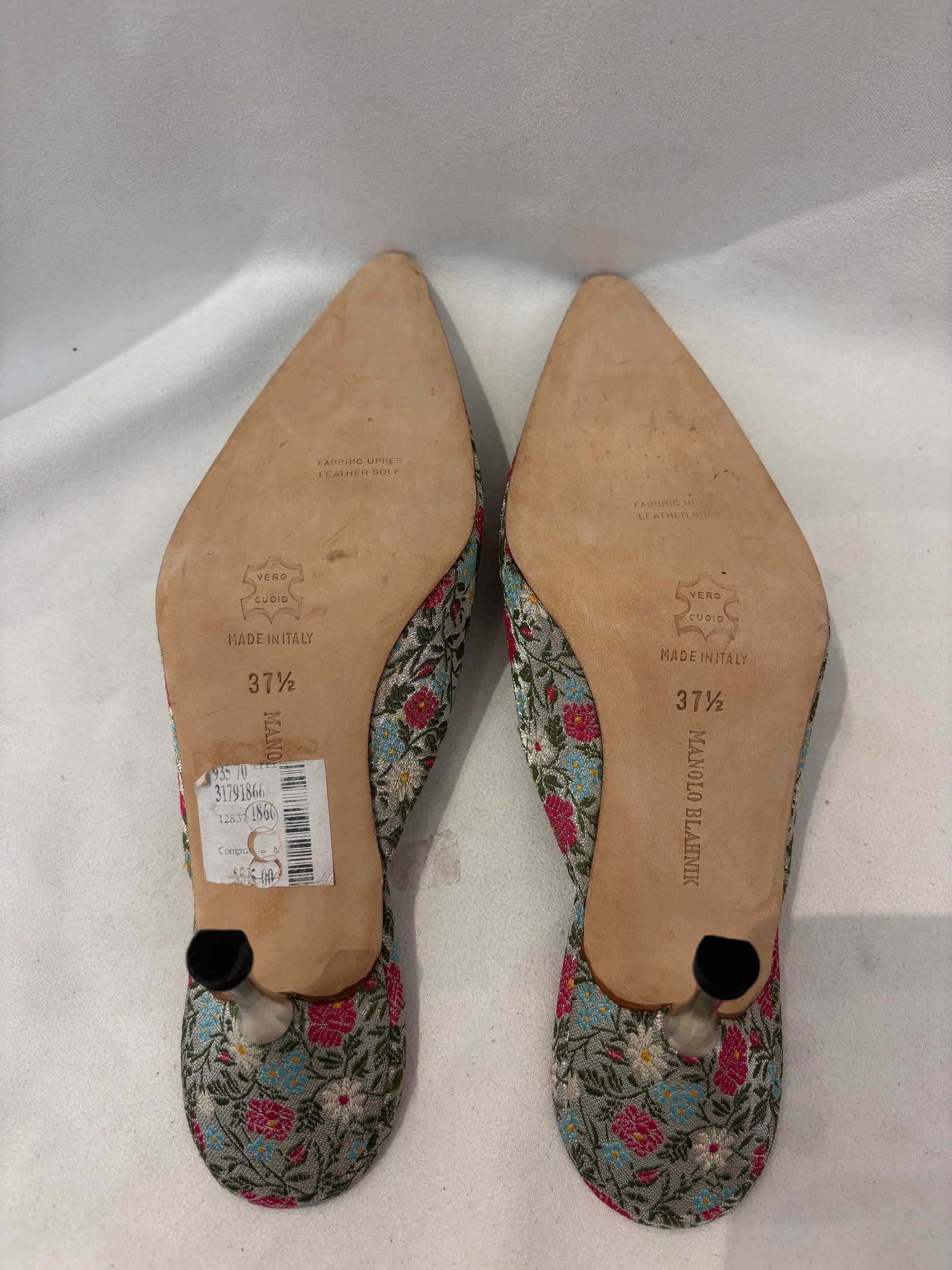 Manolo Blahnik Silver/Pink Floral Brocade Mules Size 37.5