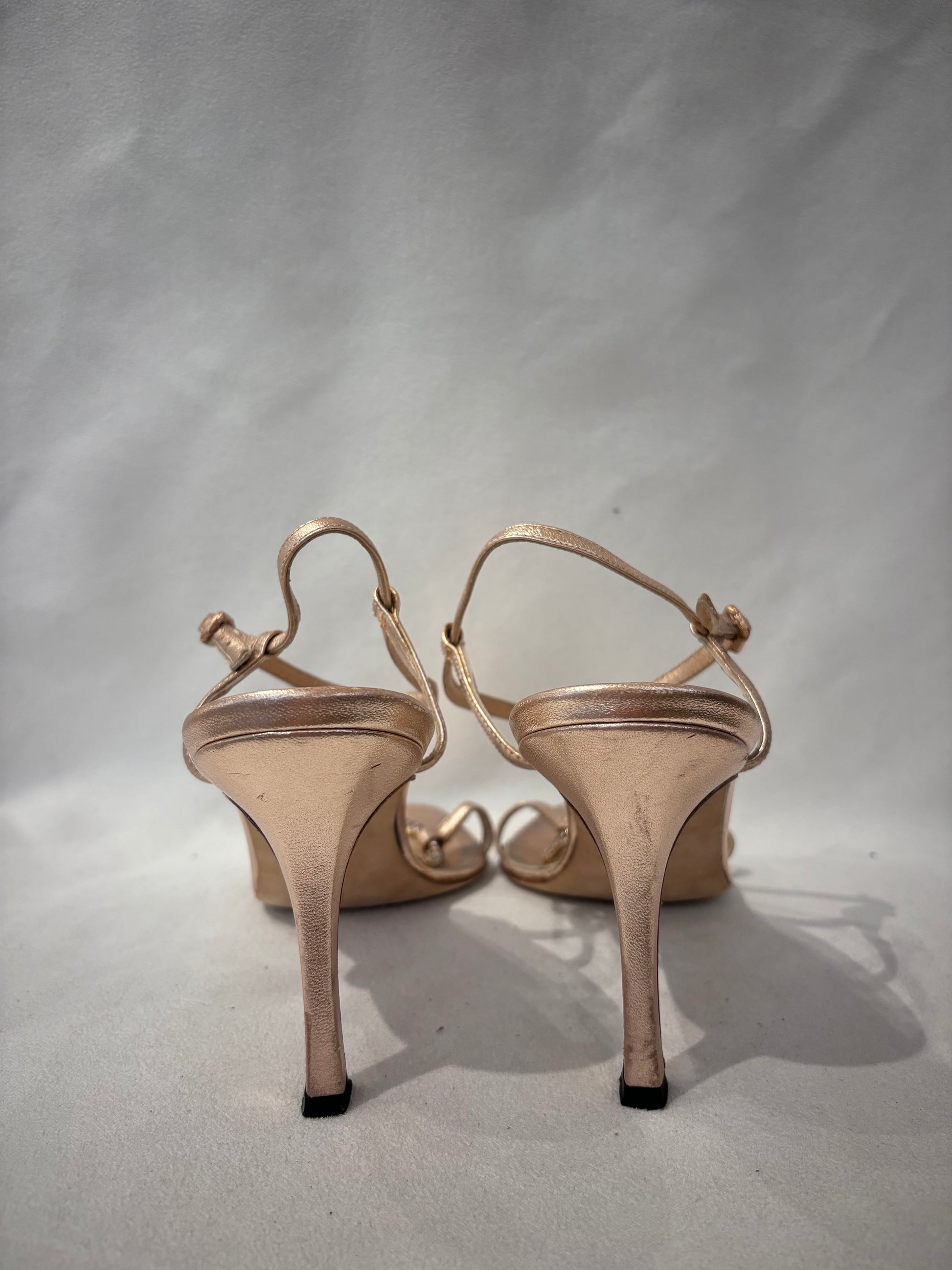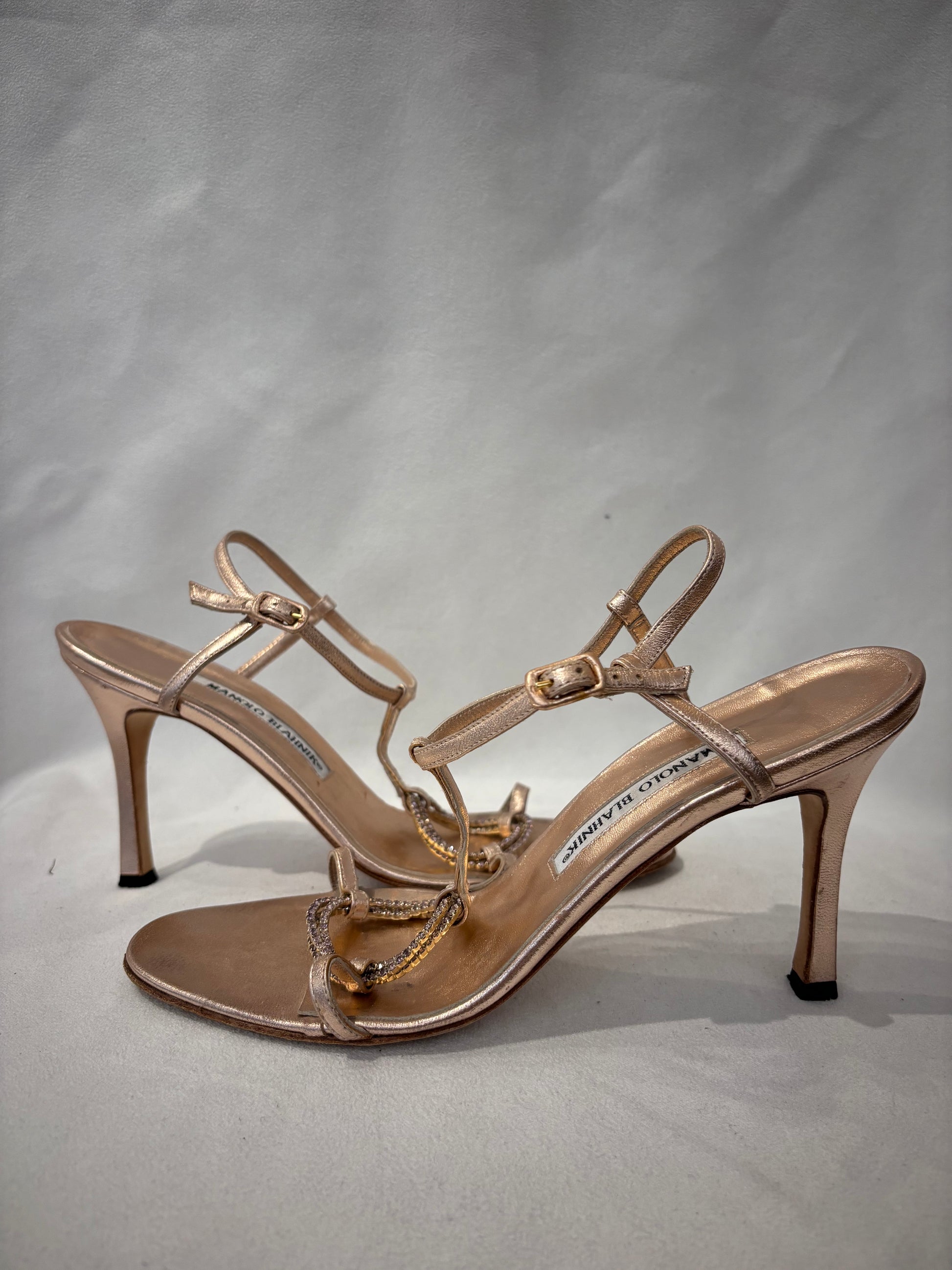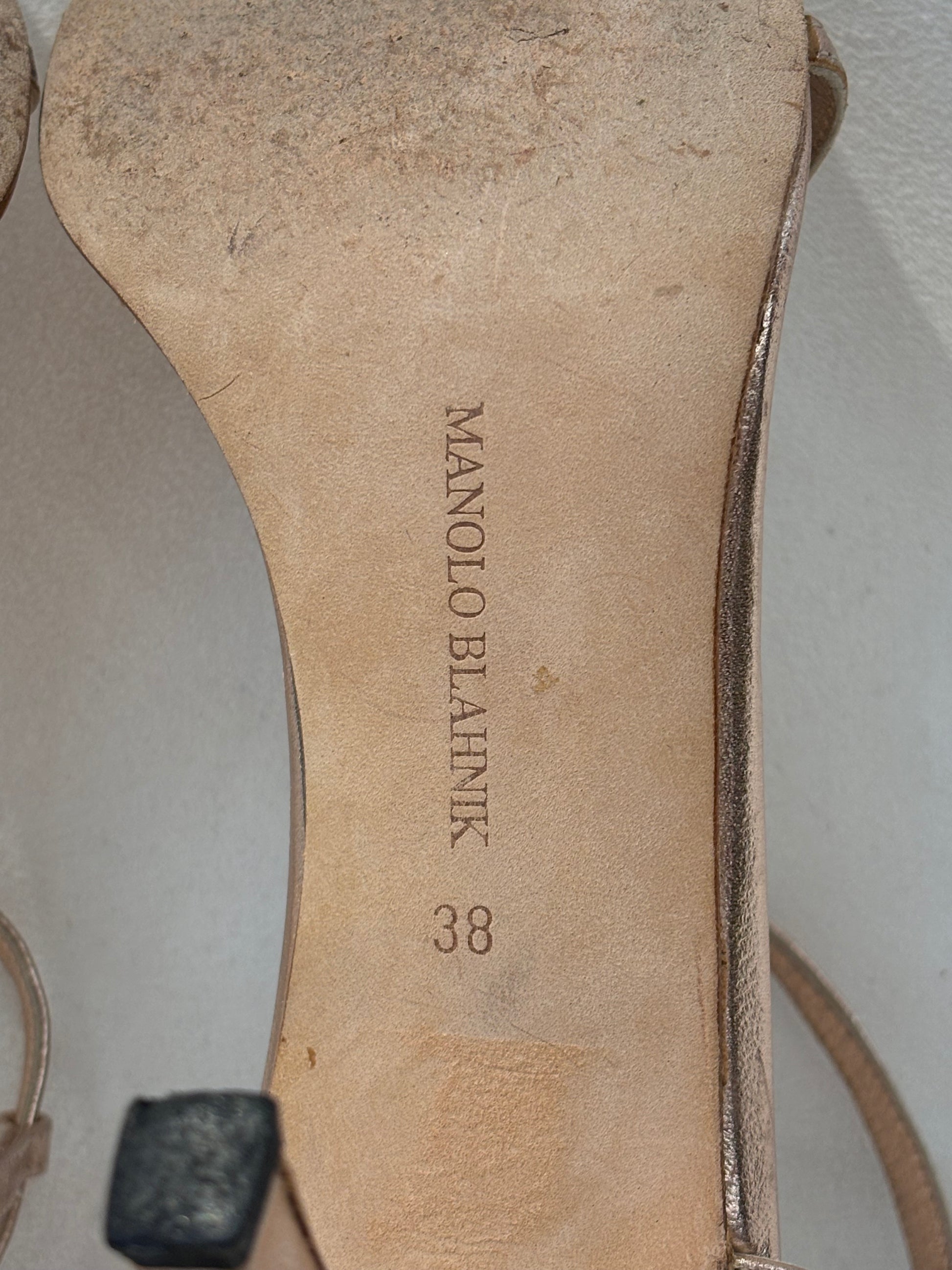 Manolo Blahnik Metallic Pink Leather Sandals with Crystal Ring Size 38