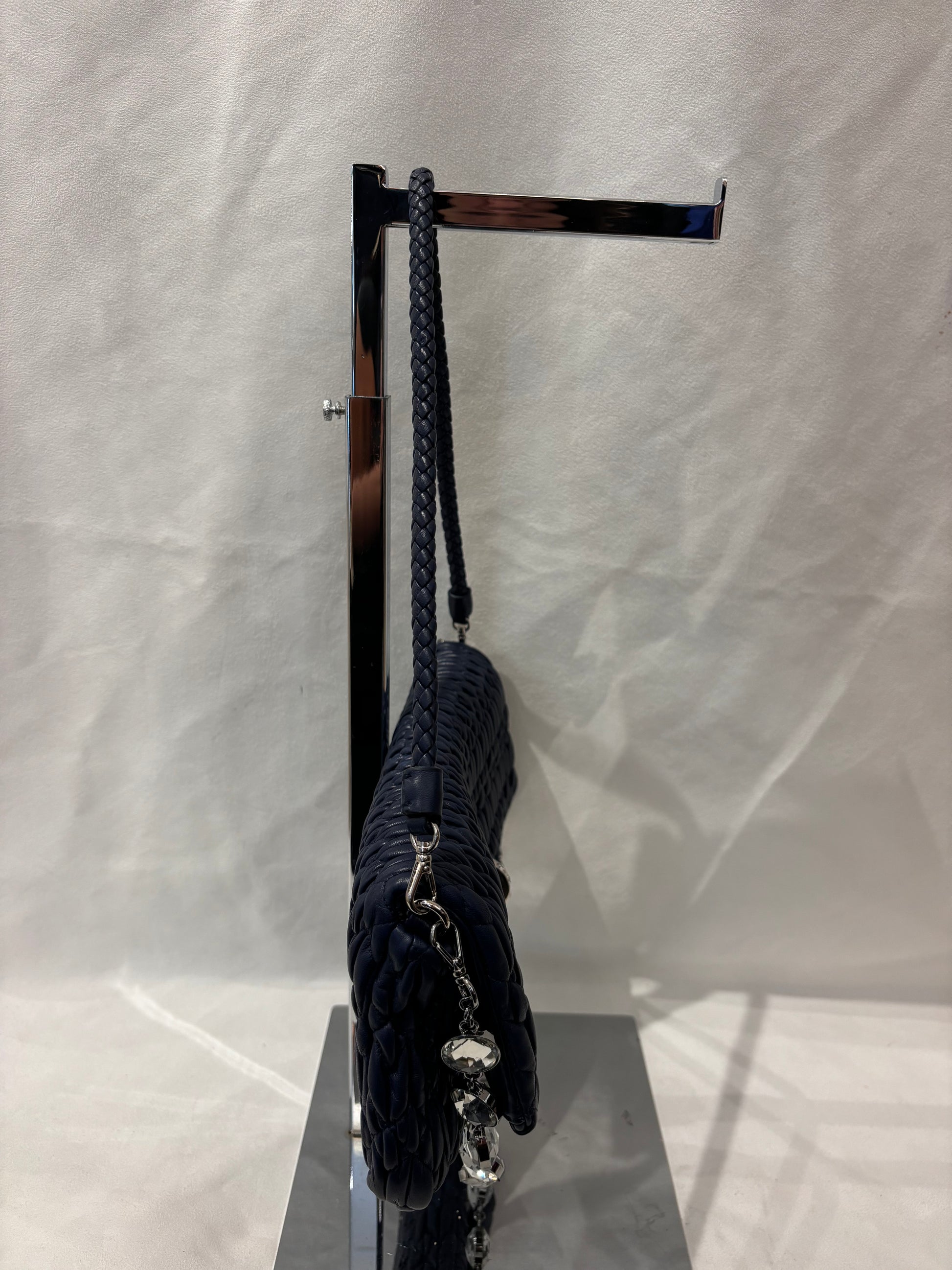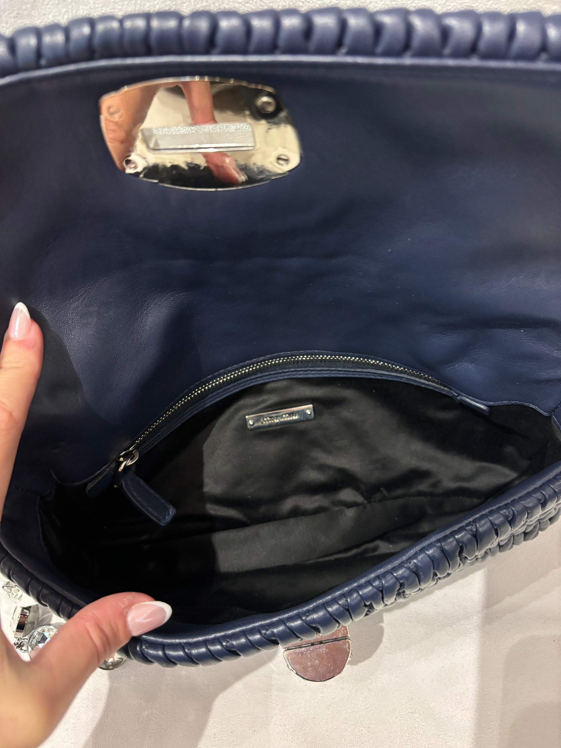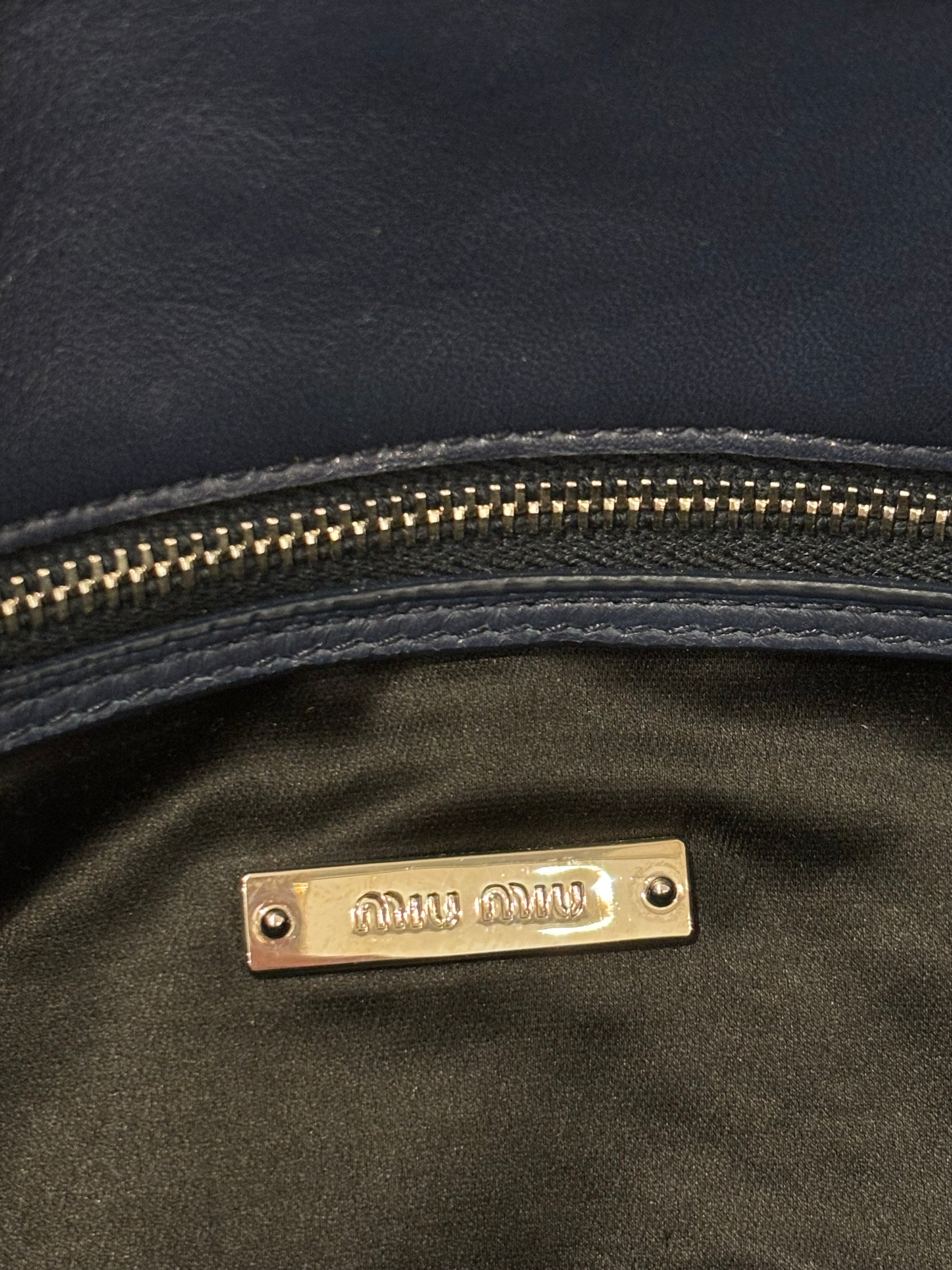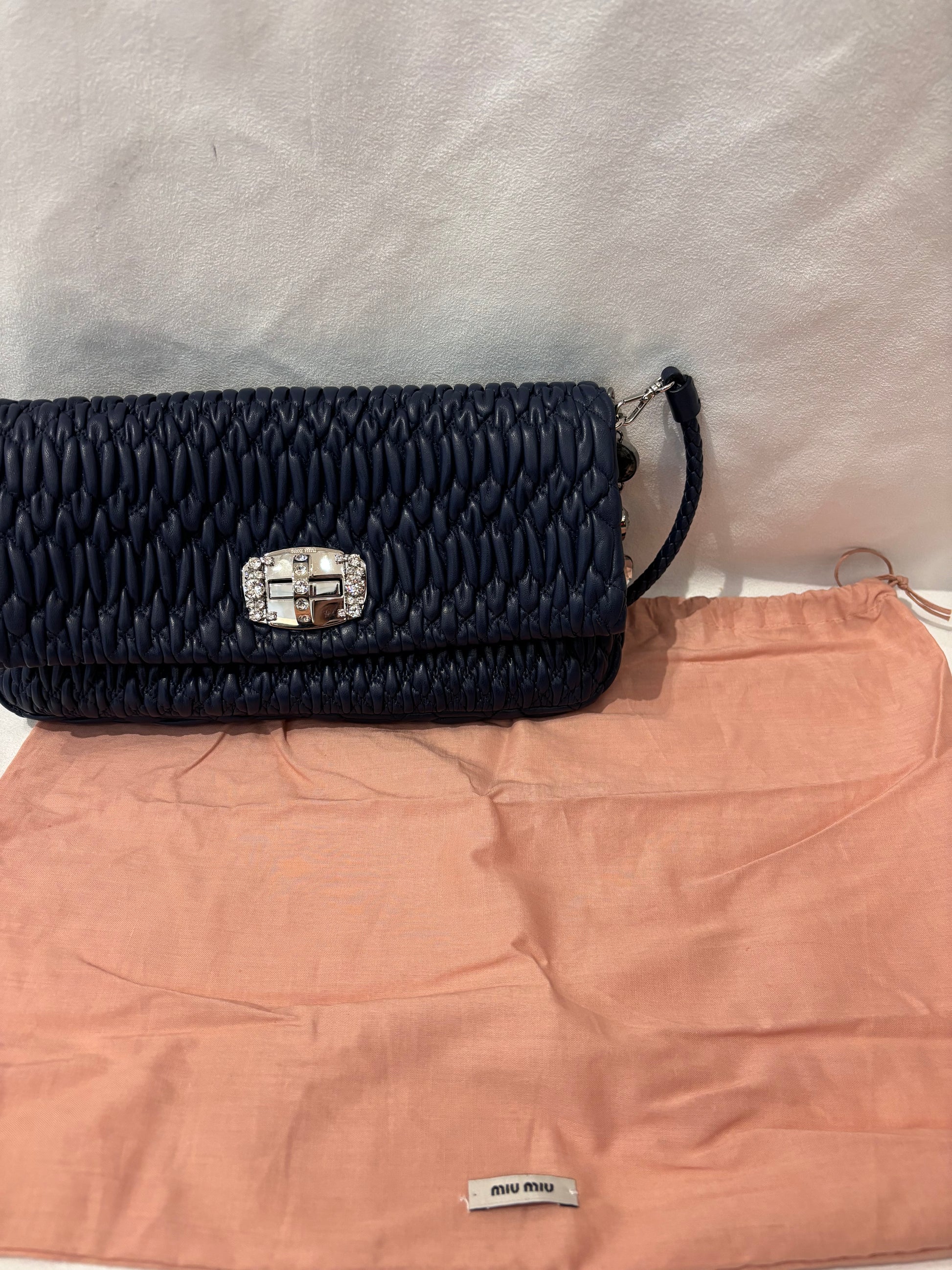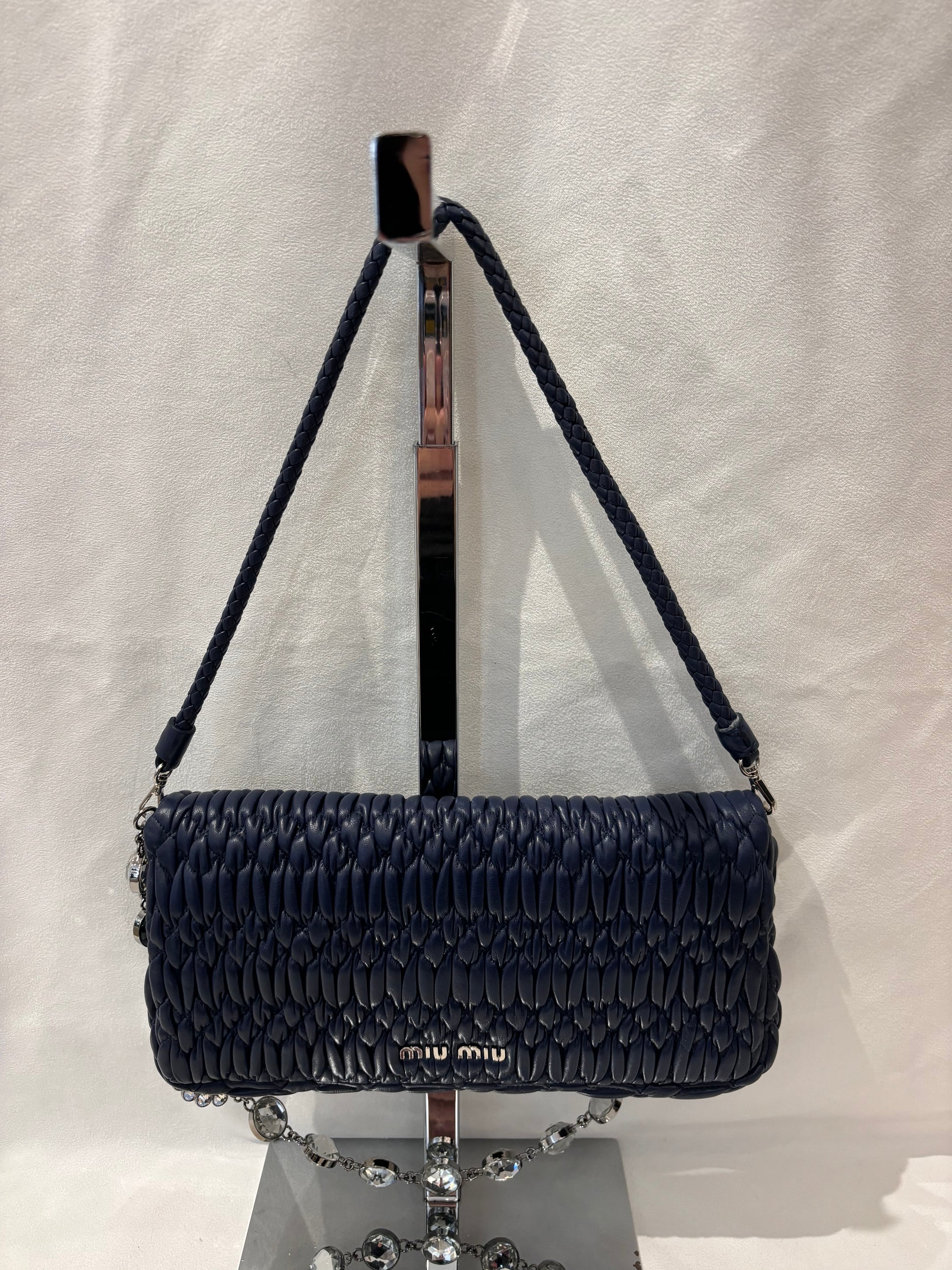Miu Miu Navy Medium Iconic Shoulder Bag with Crystal Strap