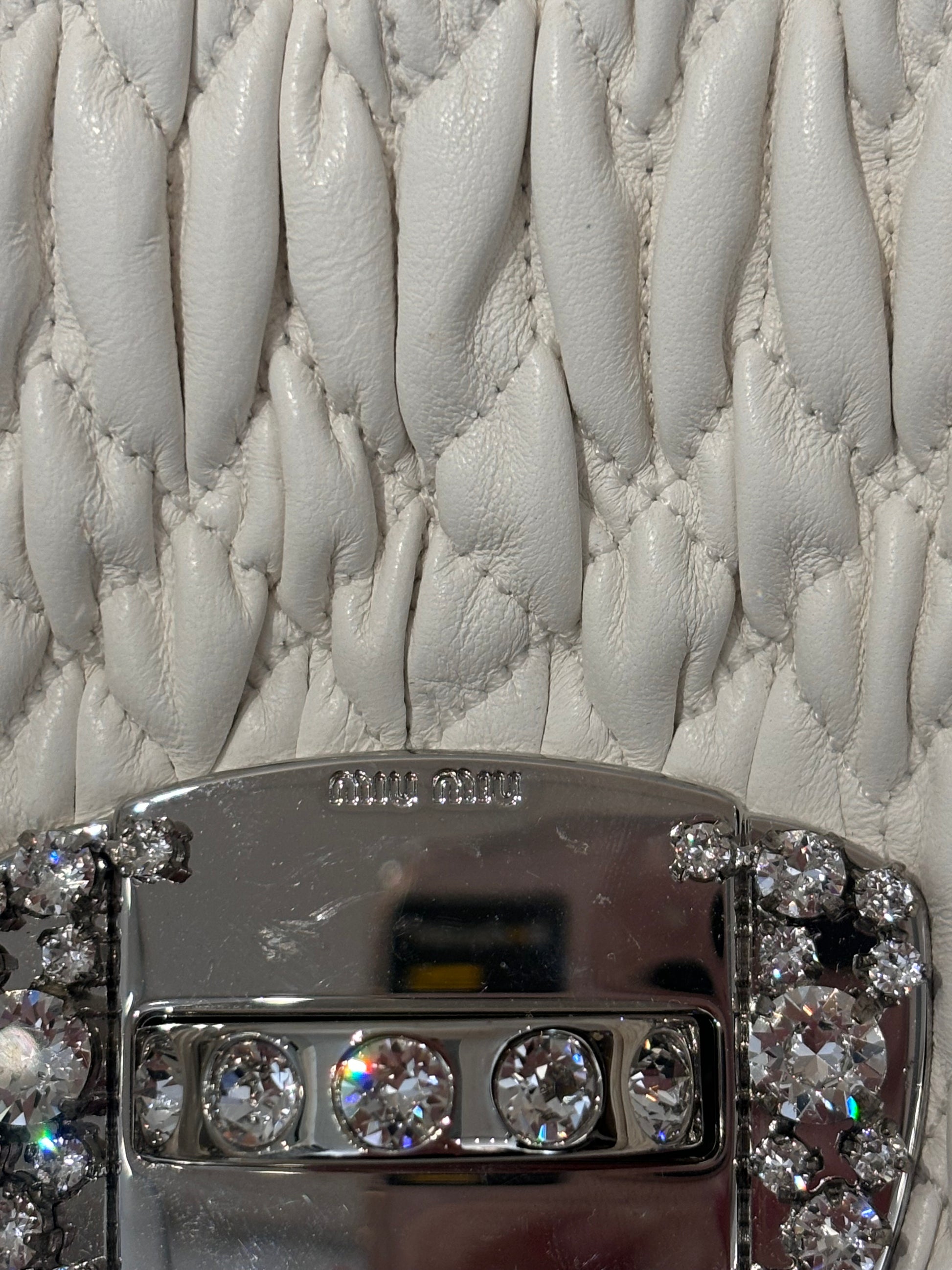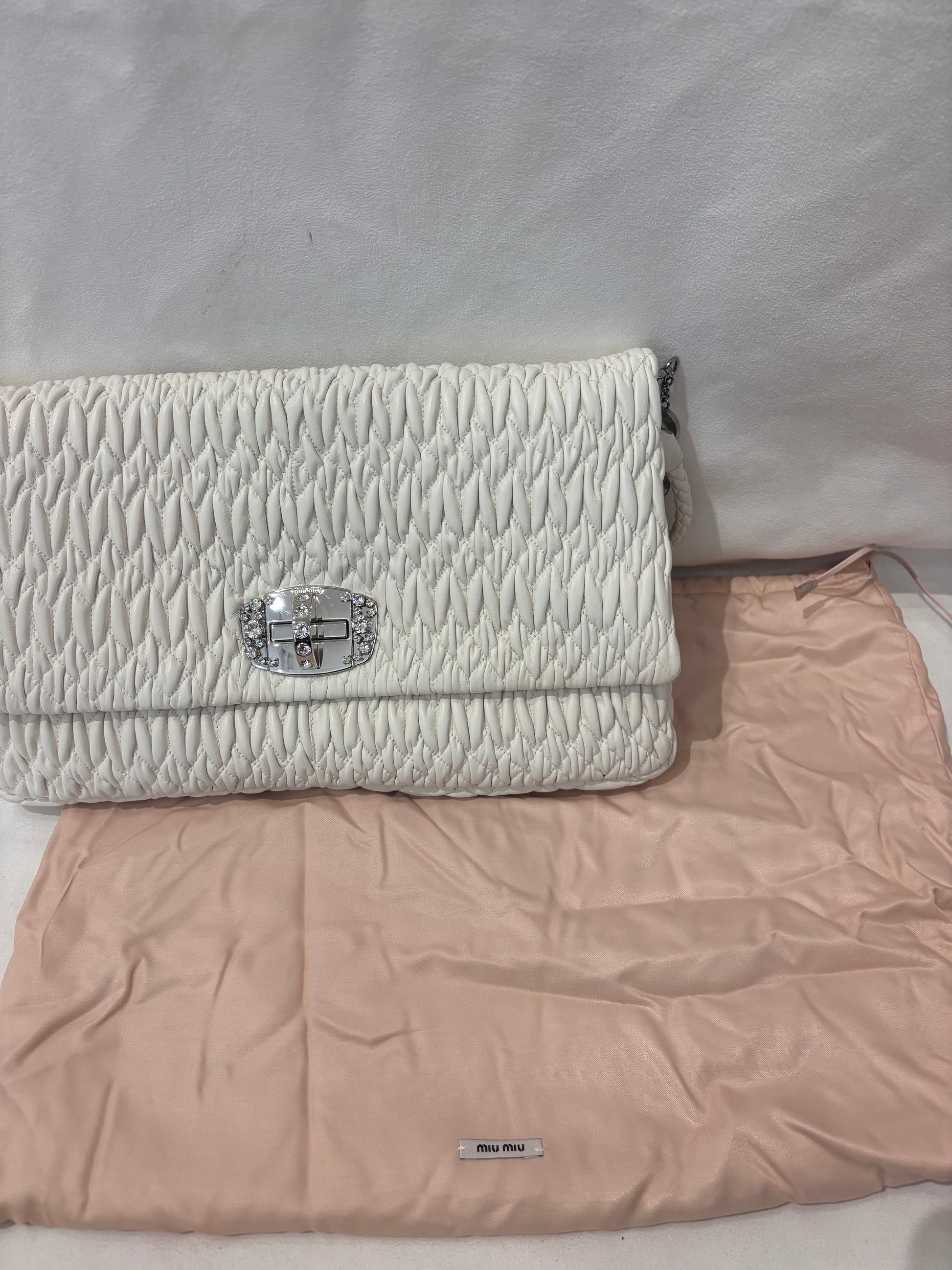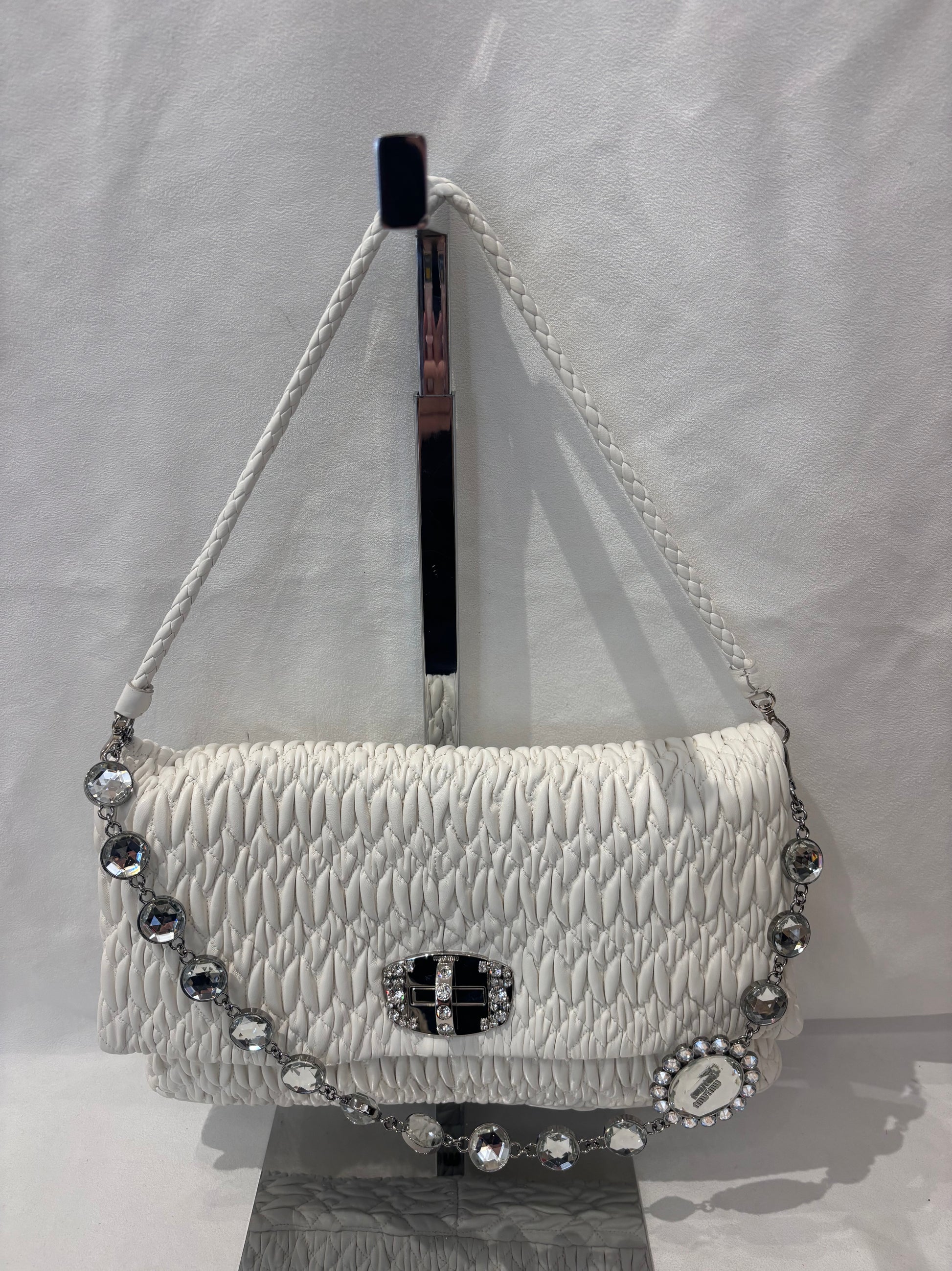 Miu Miu Large White Iconic Shoulder Bag with Crystal Strap