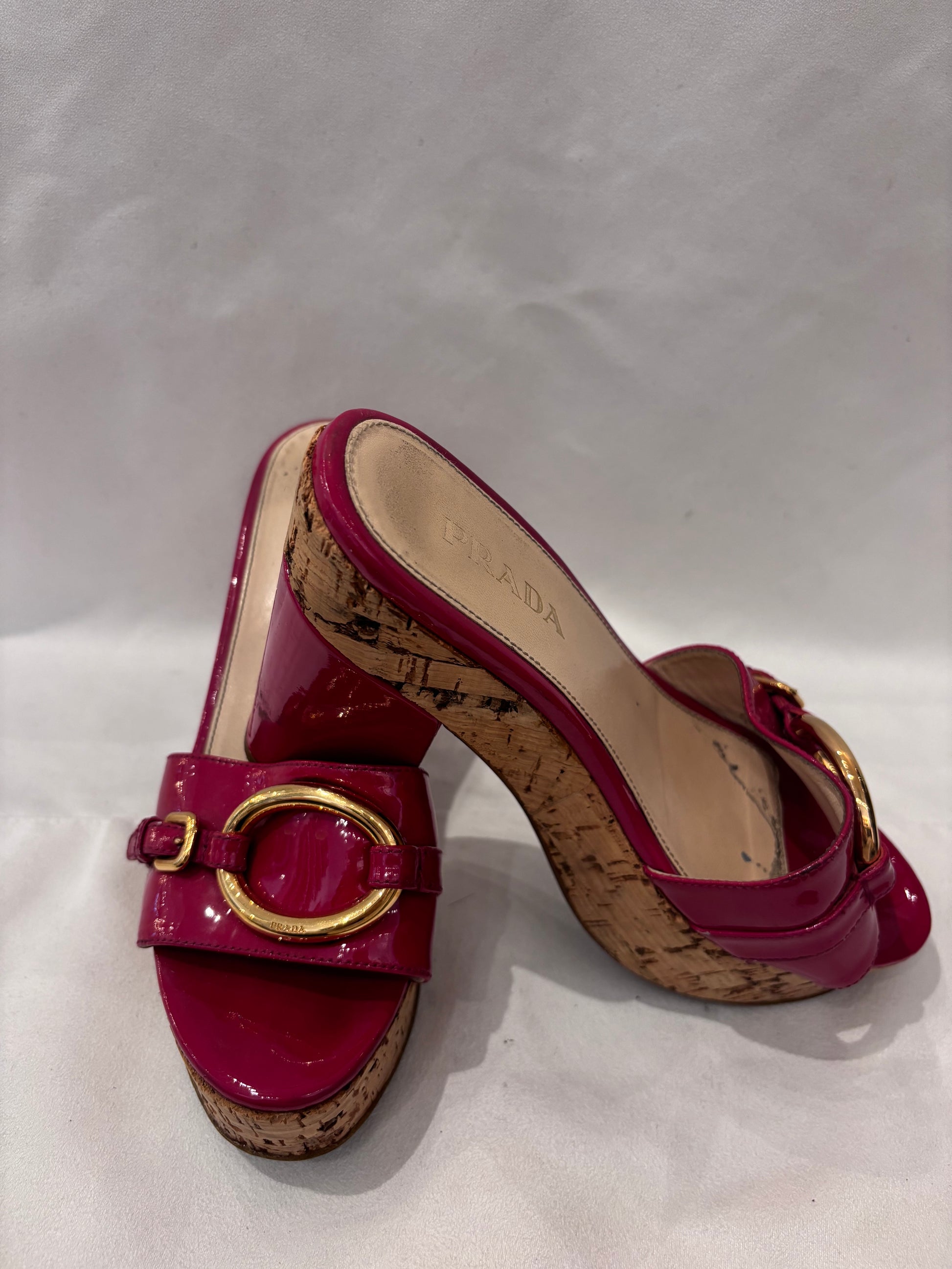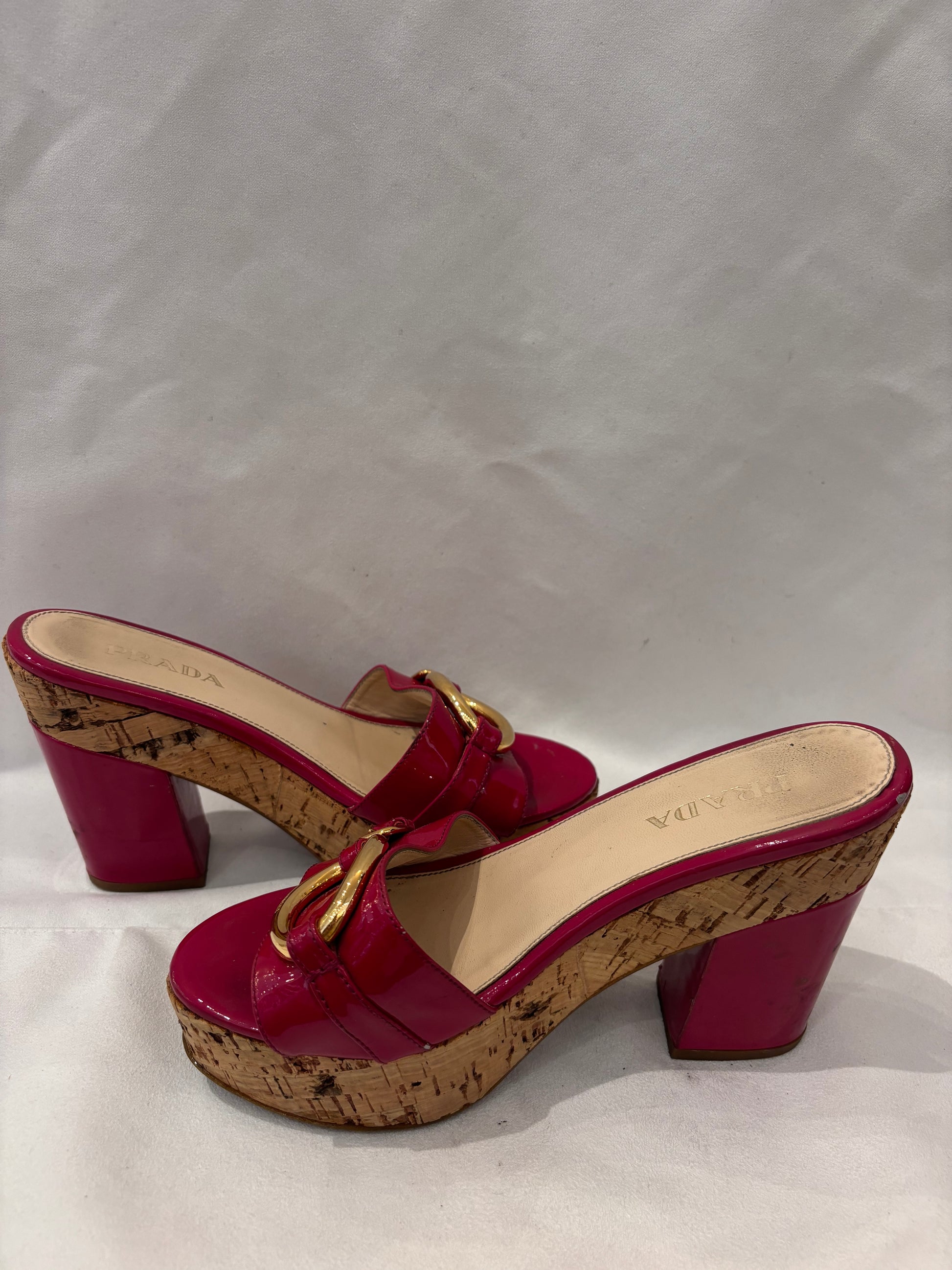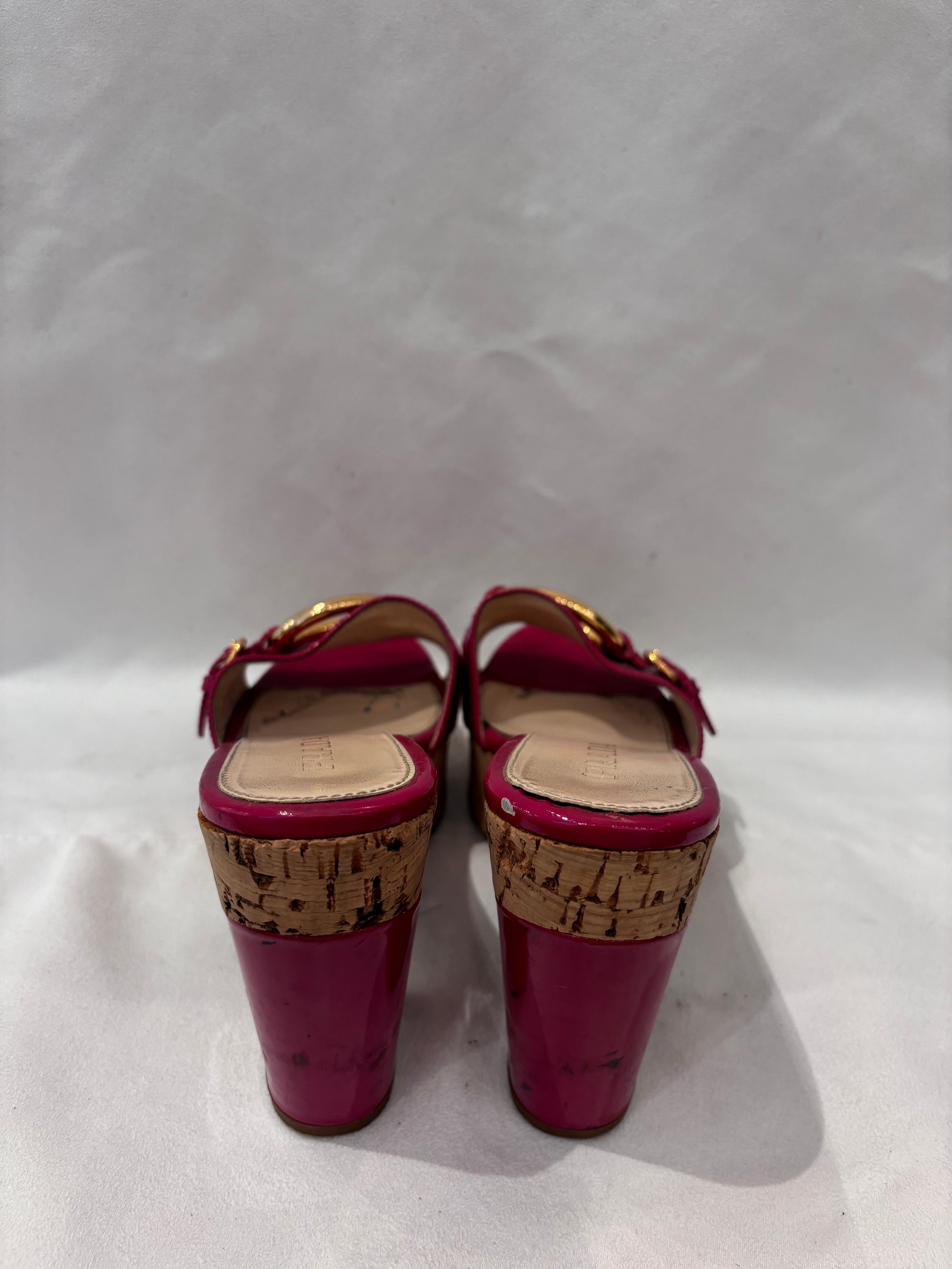 Prada Fuchsia Patent Leather Slides with Cork Platform Size 36.5