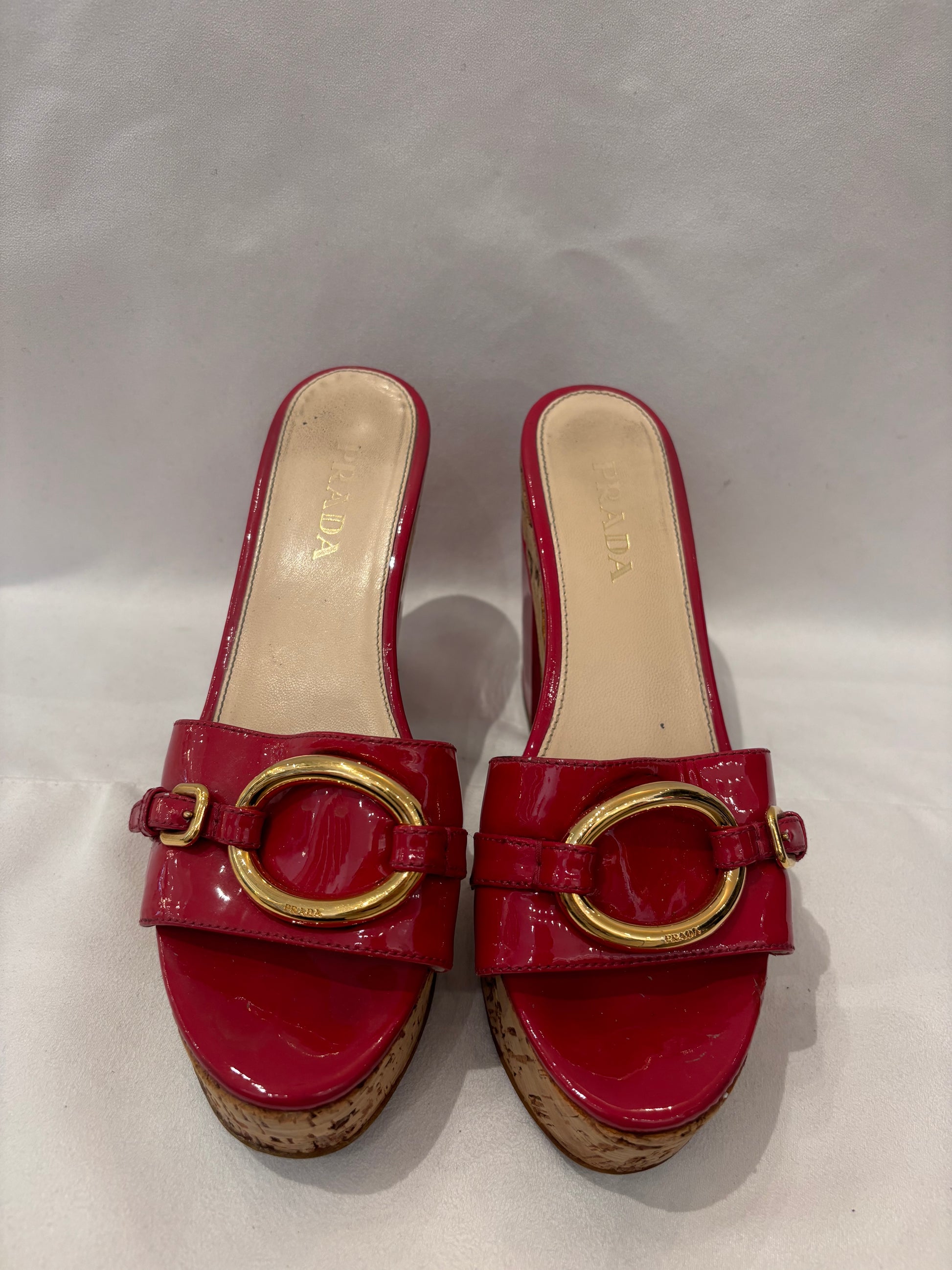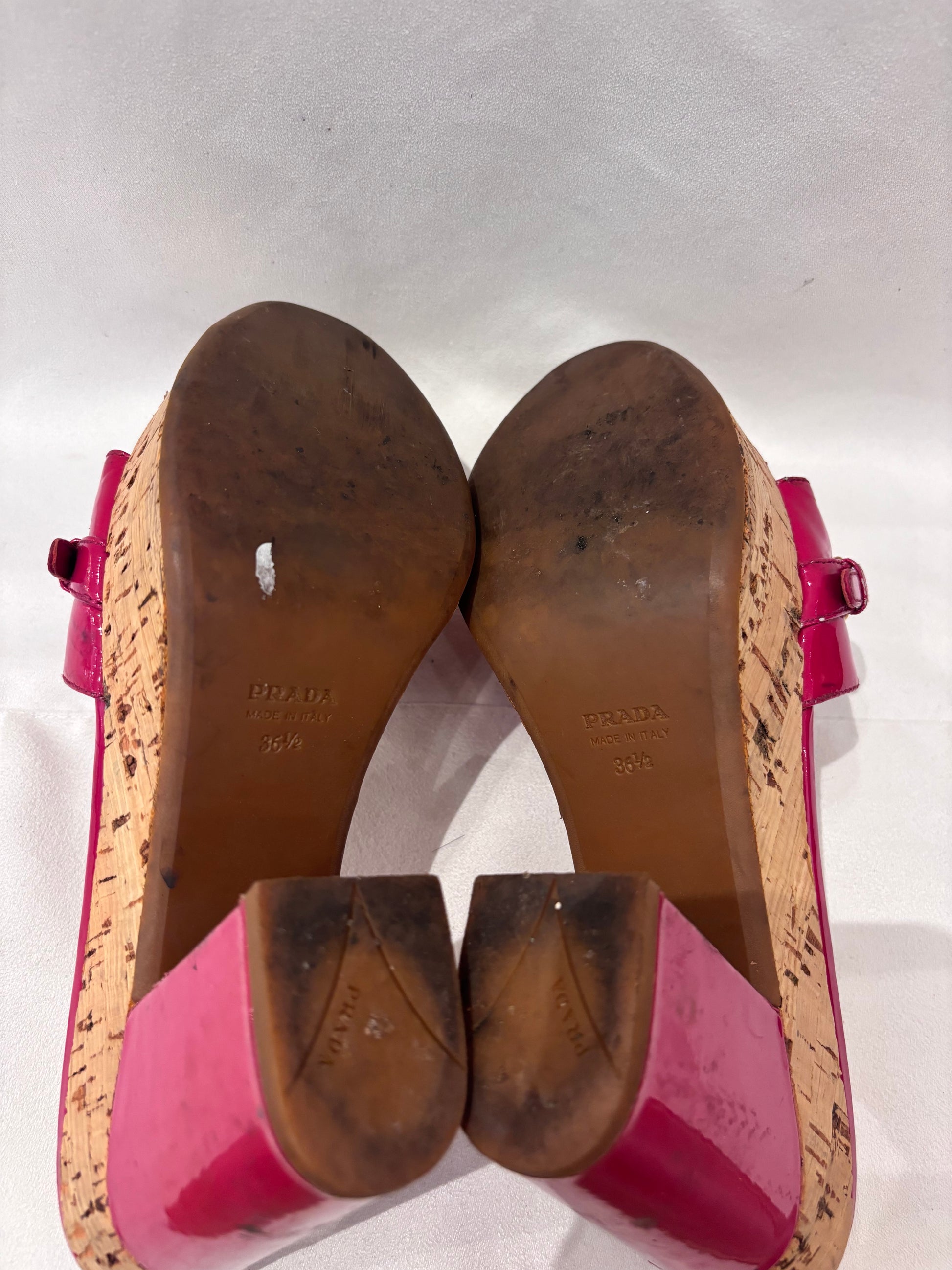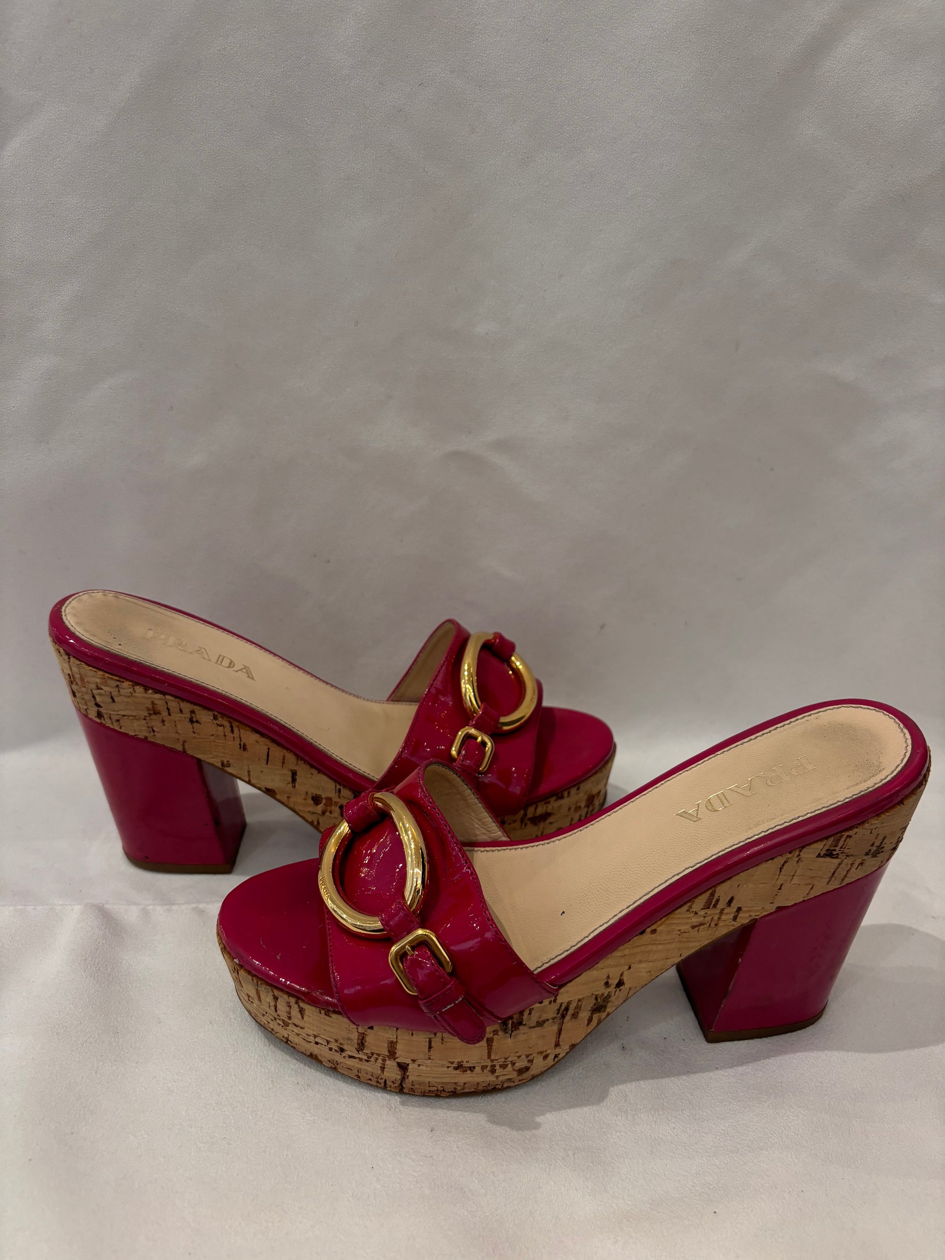 Prada Fuchsia Patent Leather Slides with Cork Platform Size 36.5