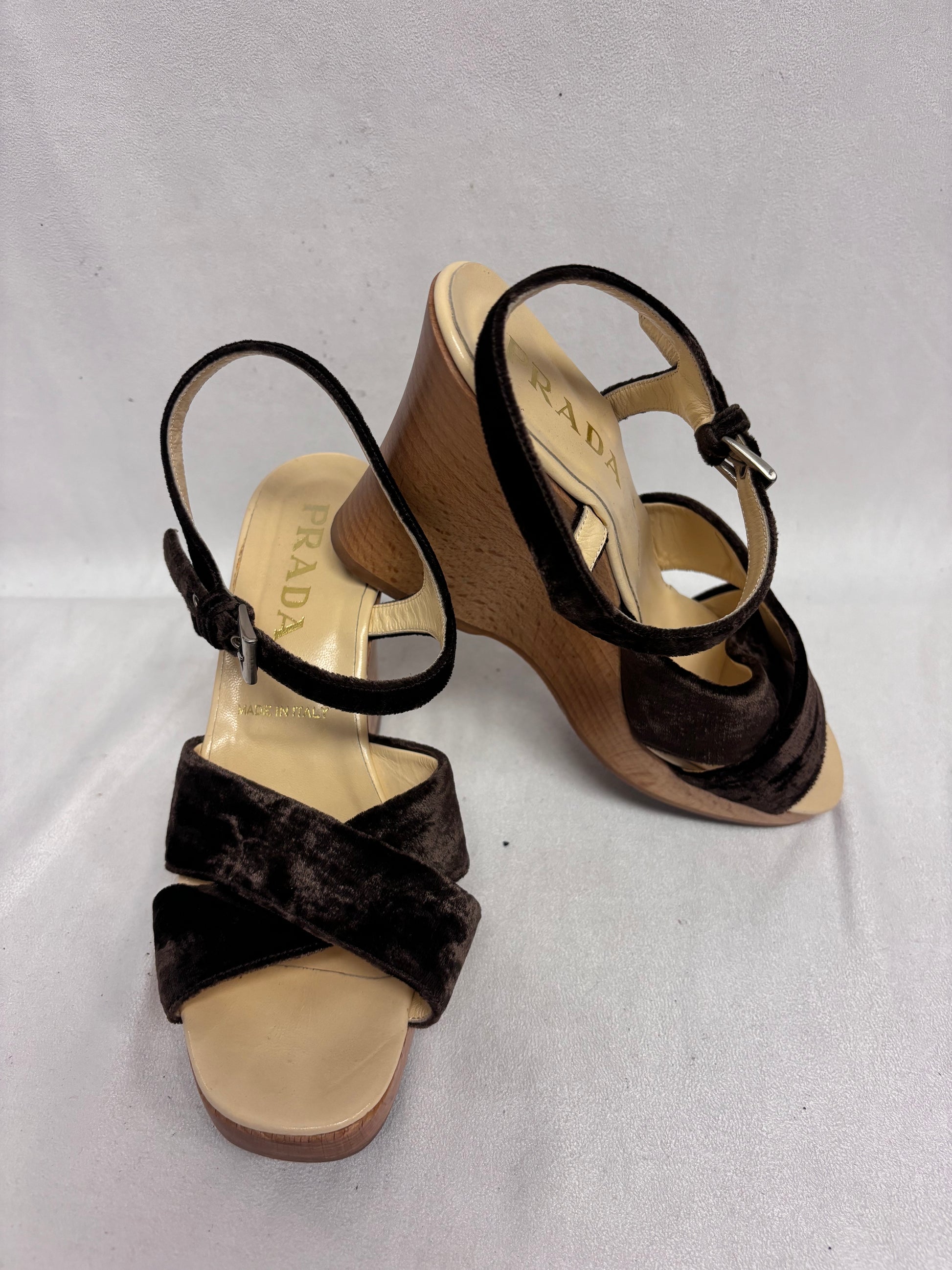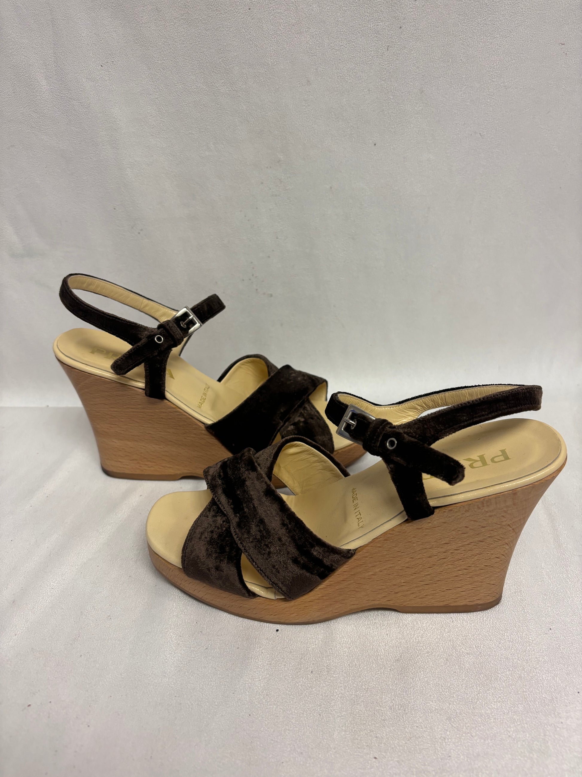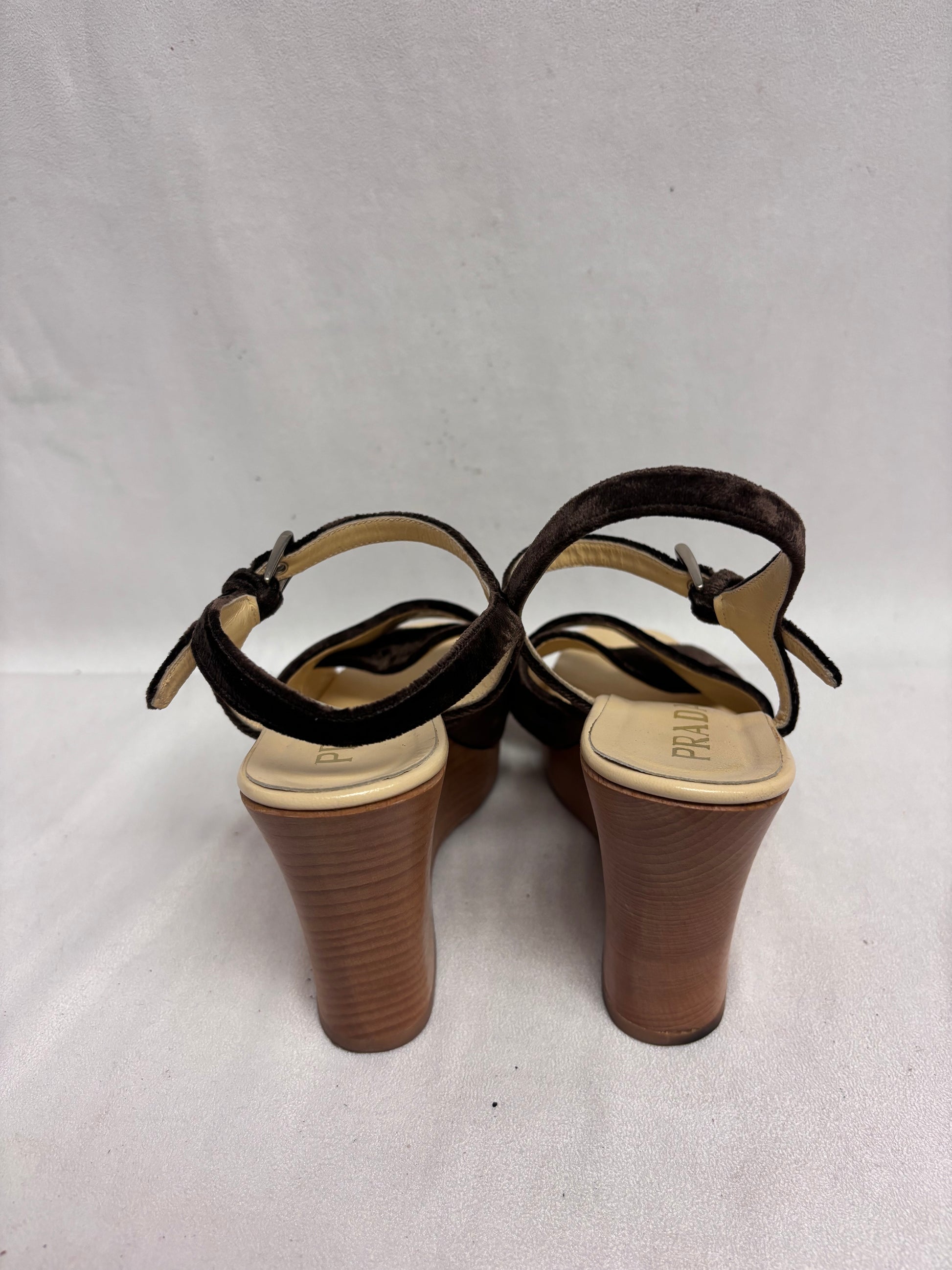 Prada Brown Velvet Wedges with Wooden Platform Size 38.5