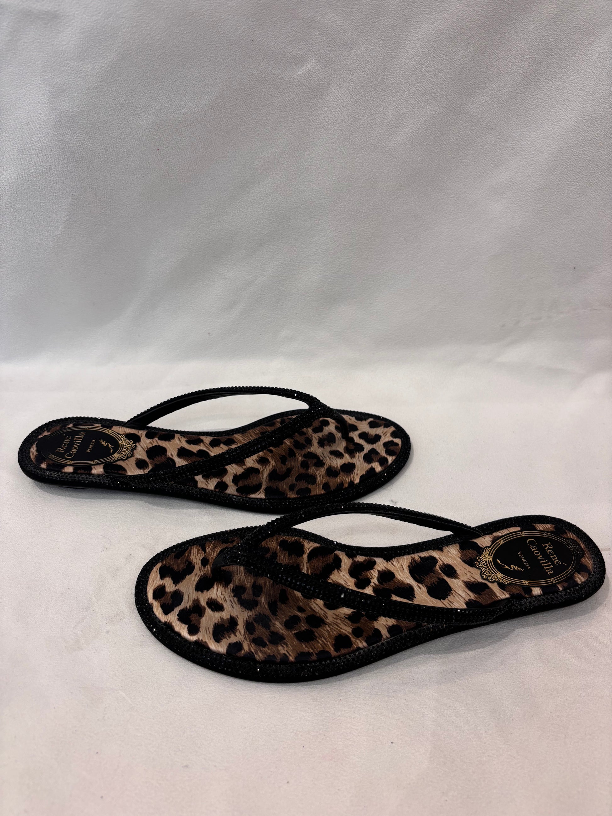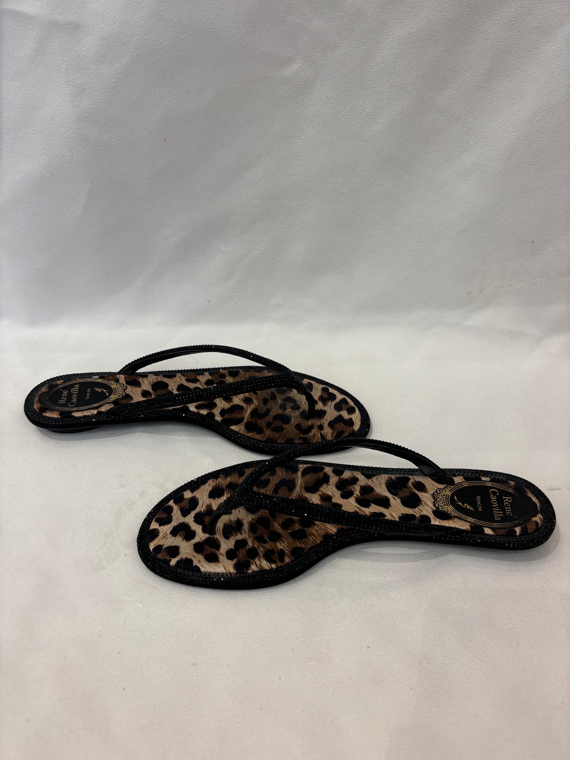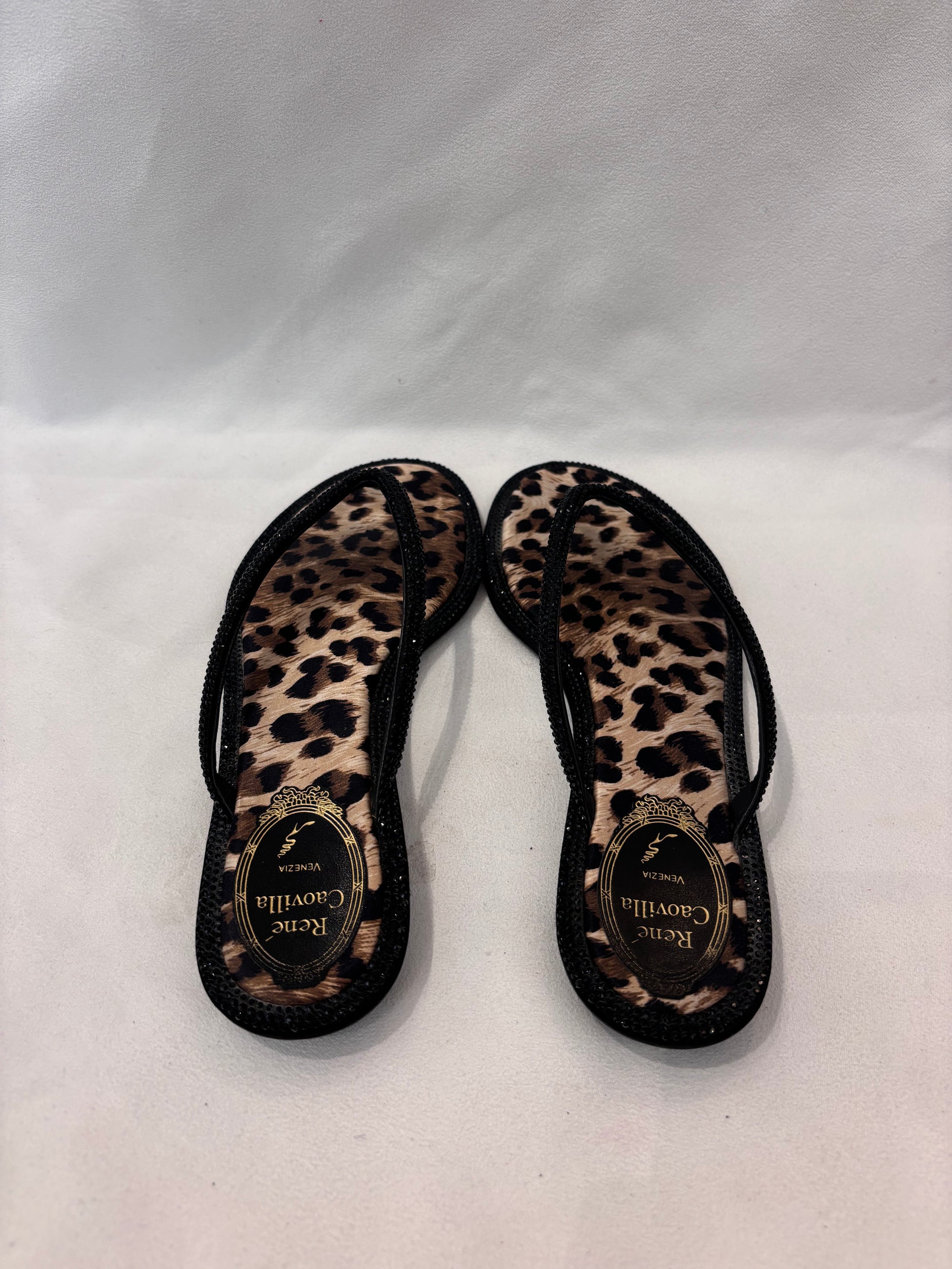 René Caovilla Black Glitter Flat Thong Sandals with Leopard Insoles Size 38.5