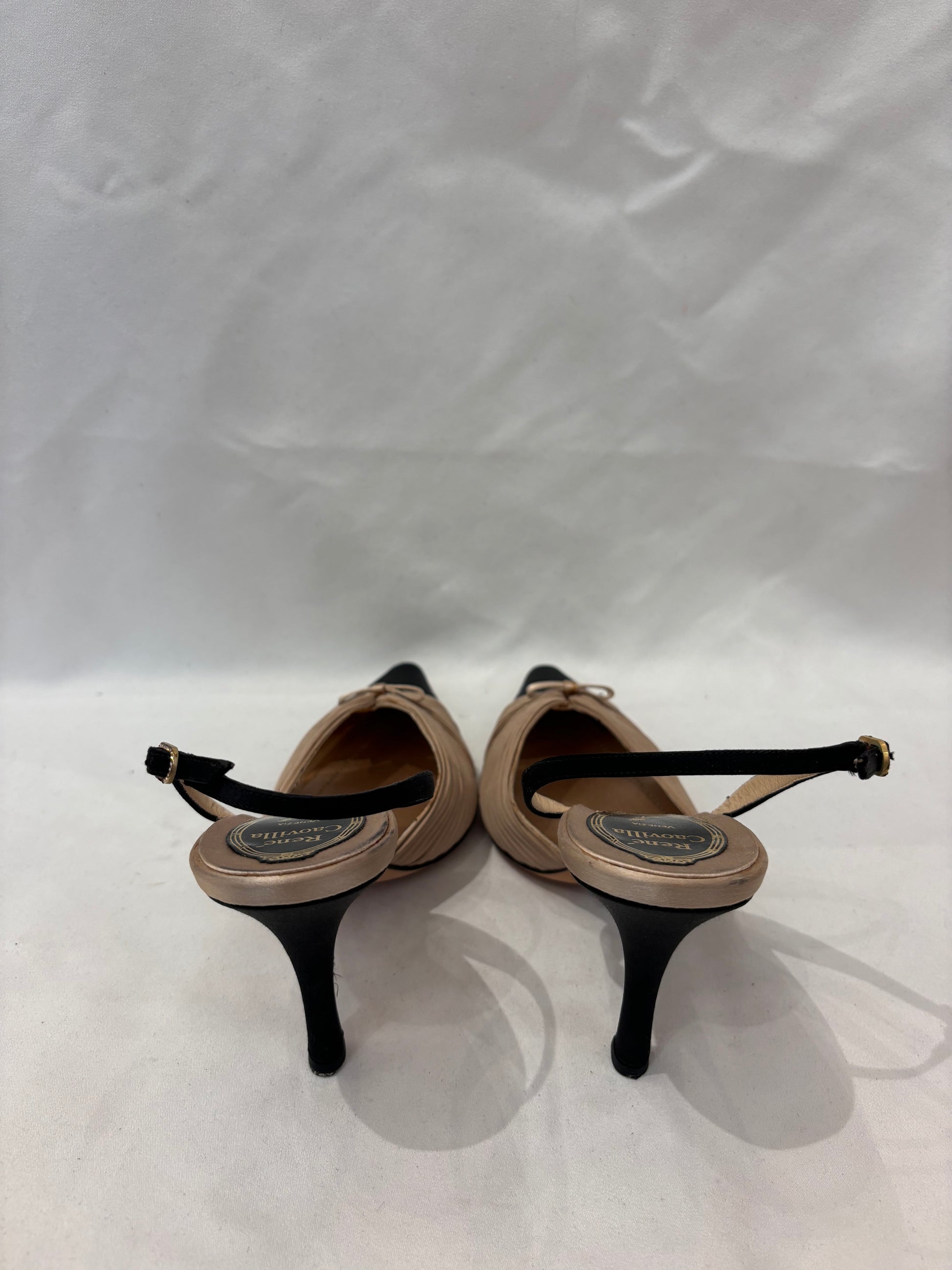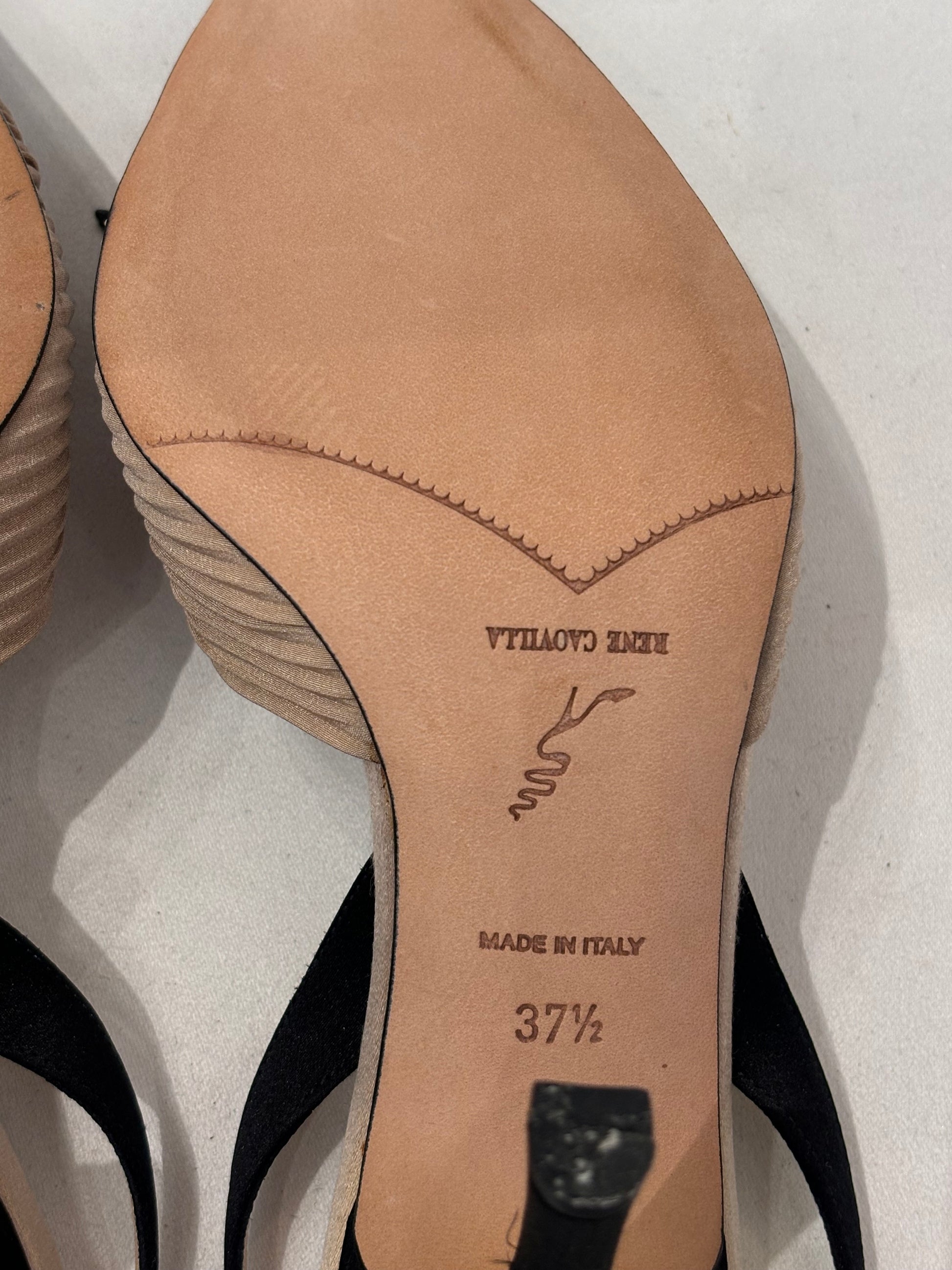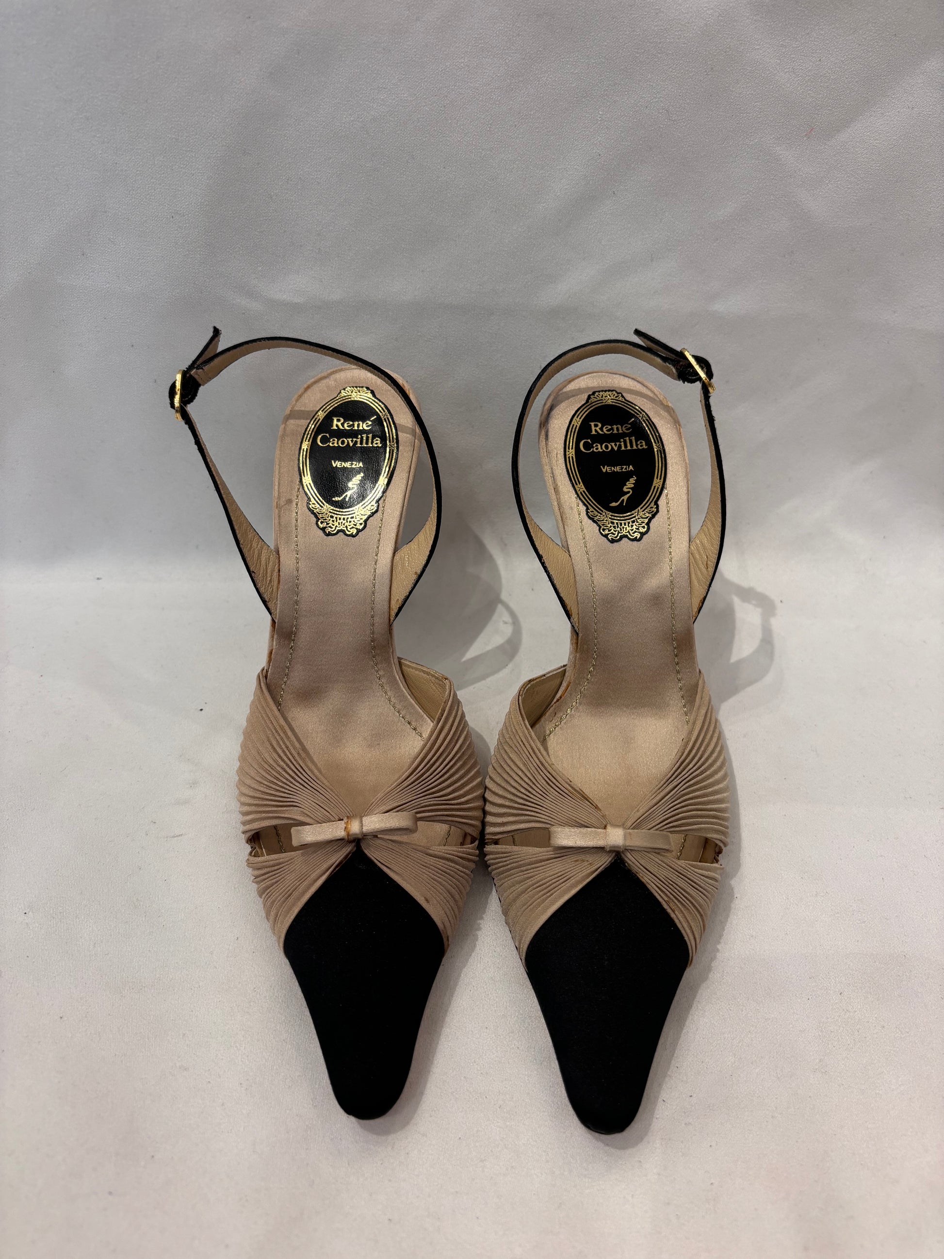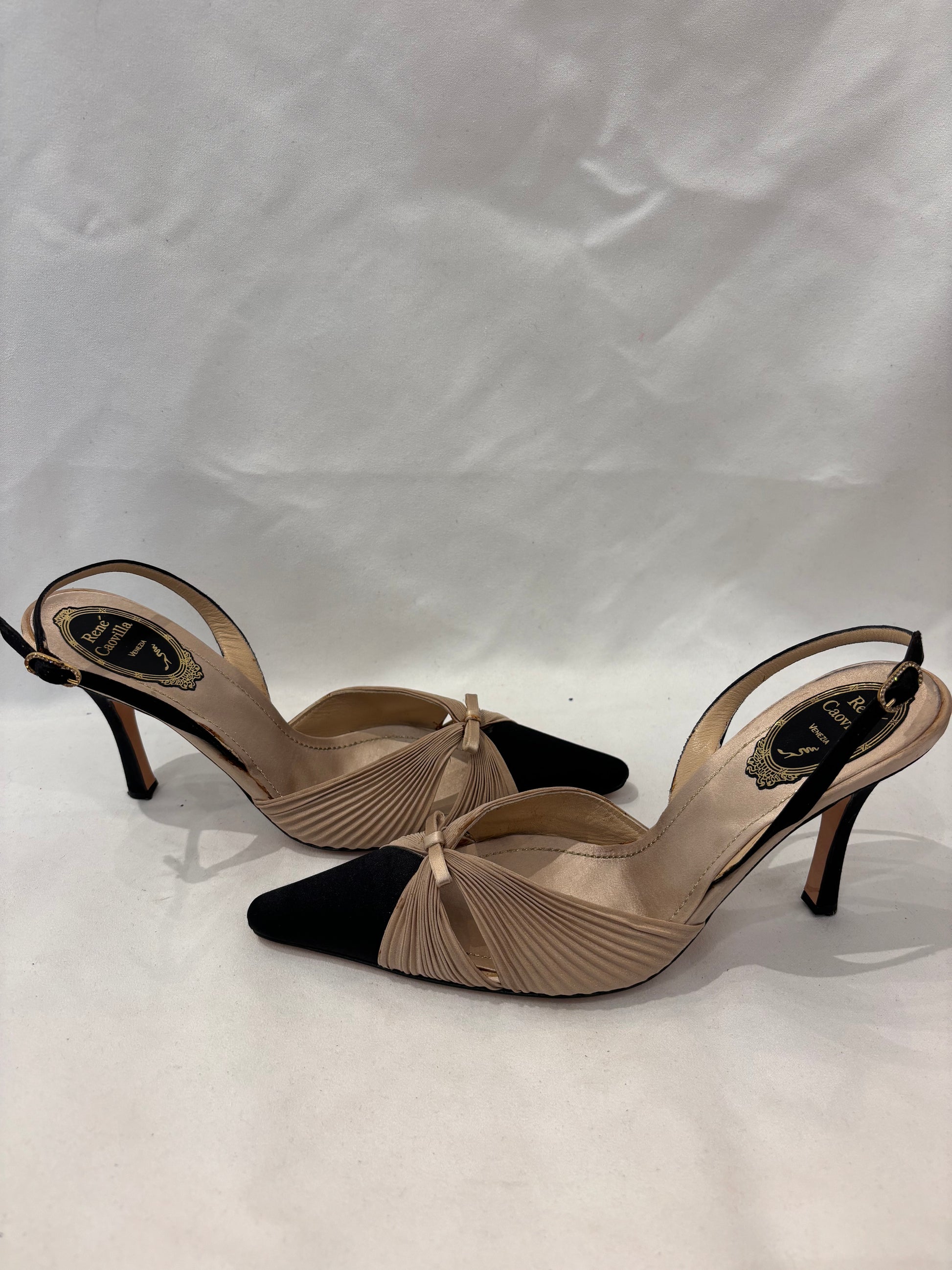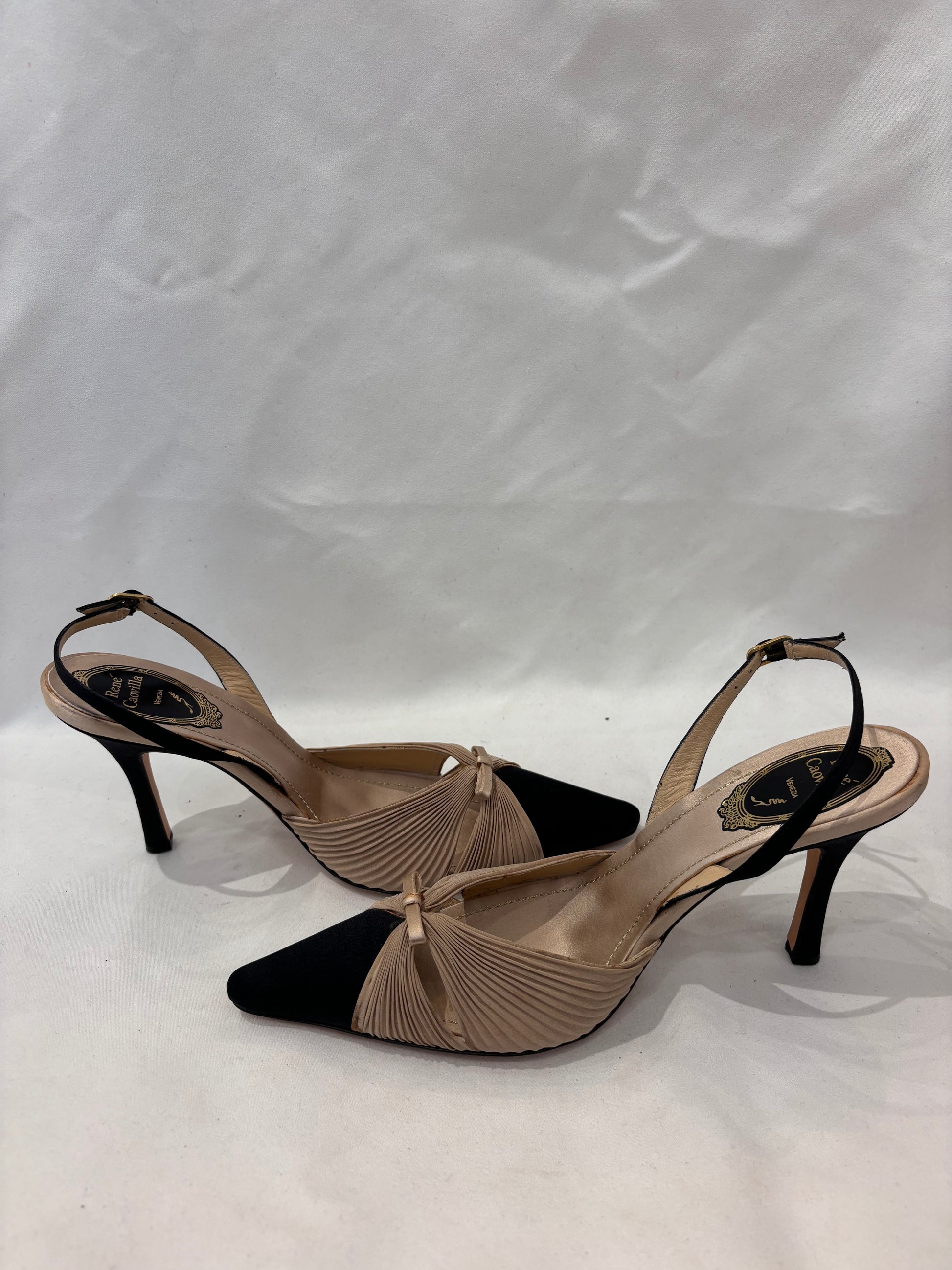 Rene Caovilla Silk Beige Pleated Slingback with Black Toe Cap Pump Size 37.5