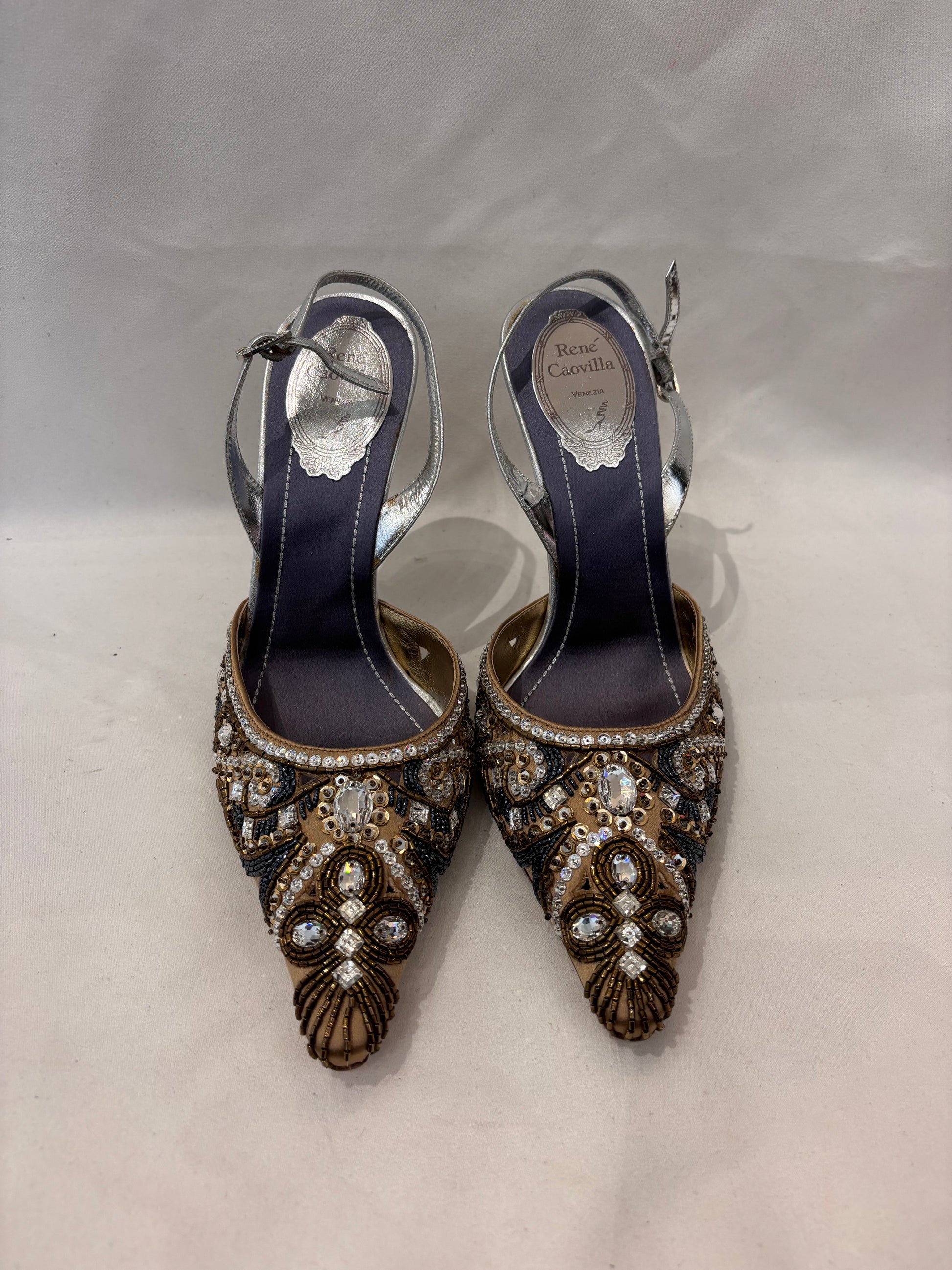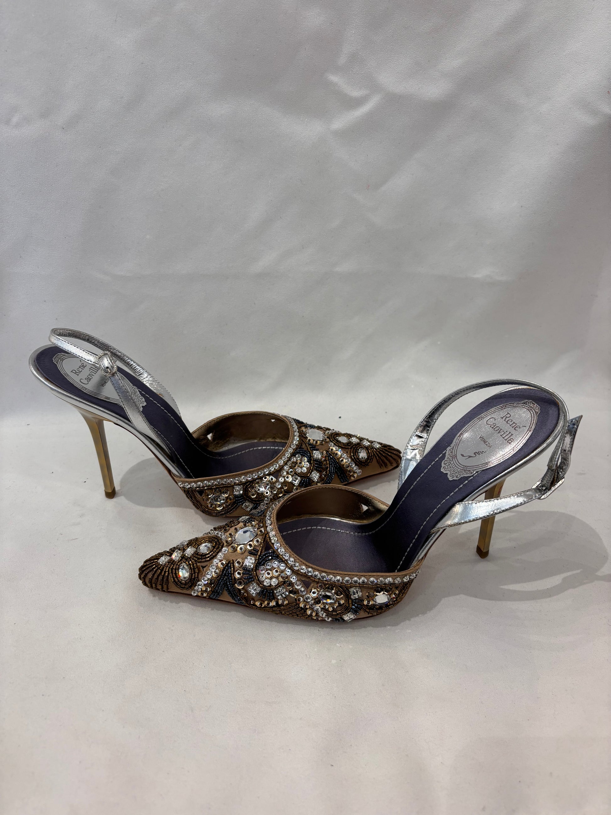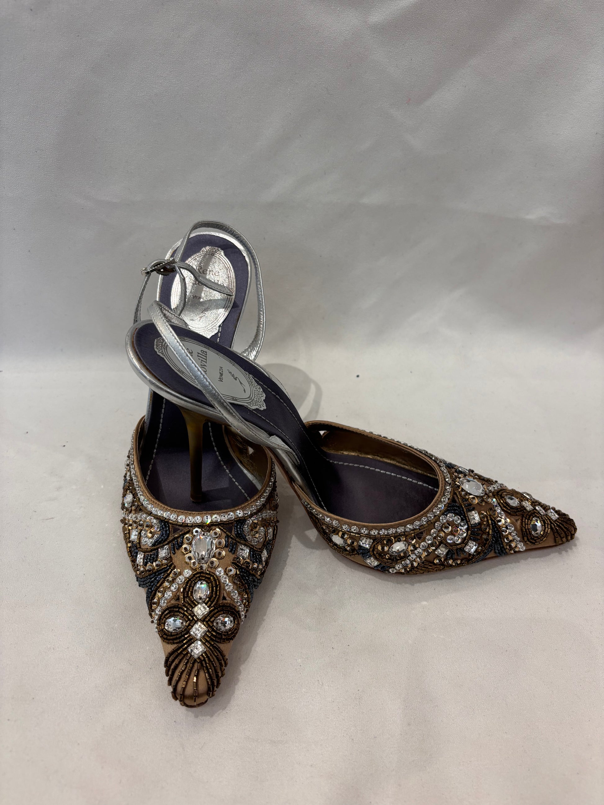 Rene Caovilla Crystal Embroidered Gold Silk Slingback Pump Size 38