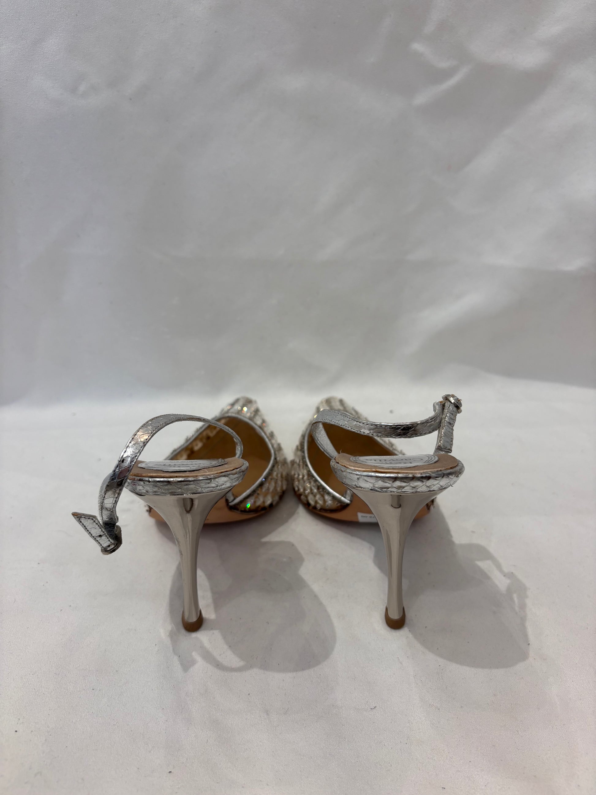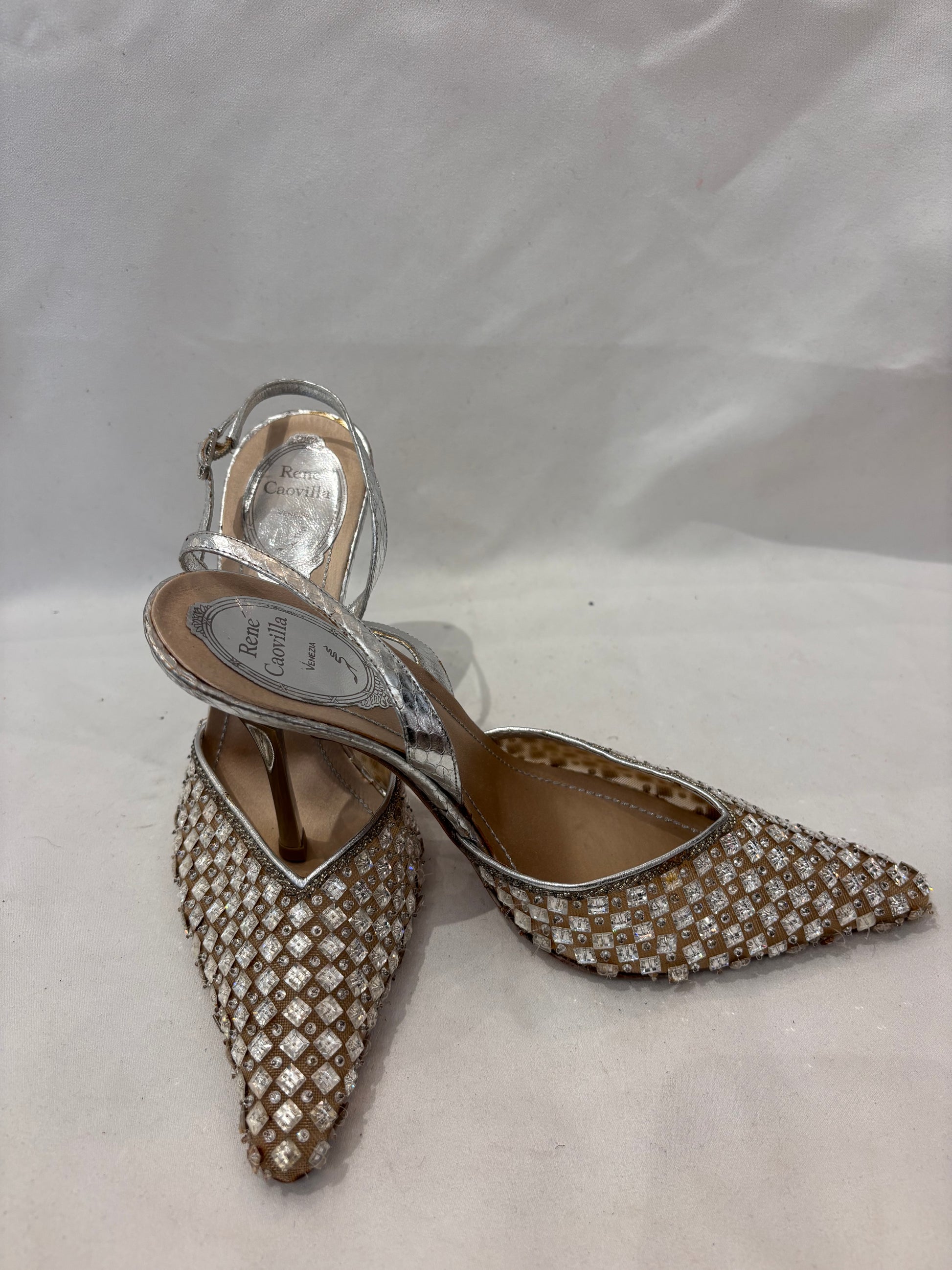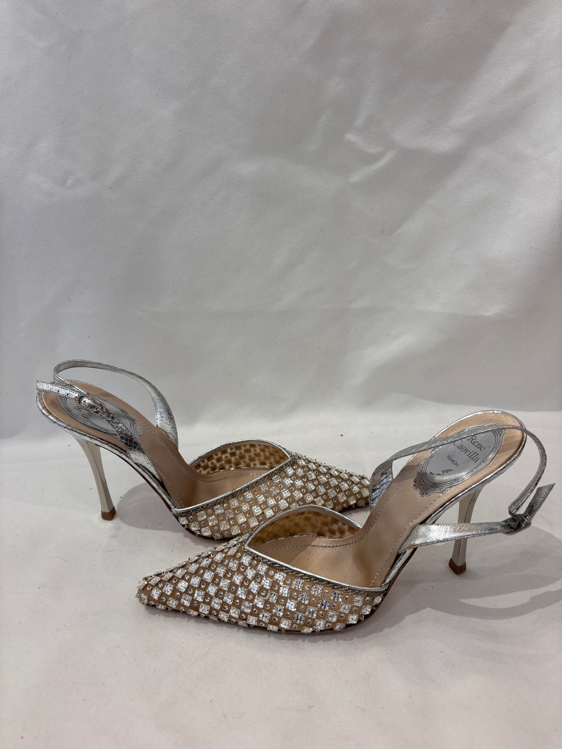 Rene Caovilla Silver Crystal Embroidered Mesh Slingback Pump Size 37