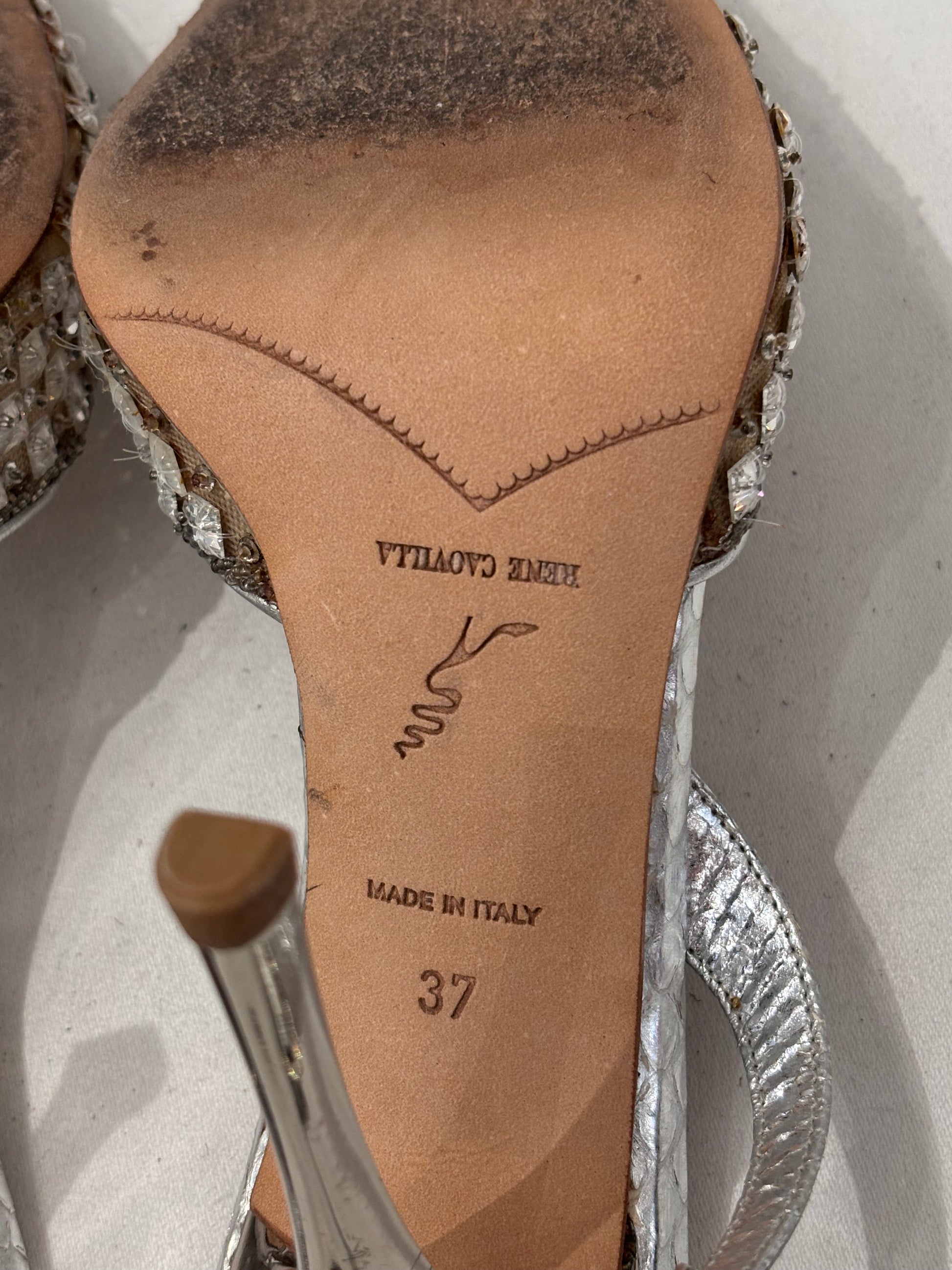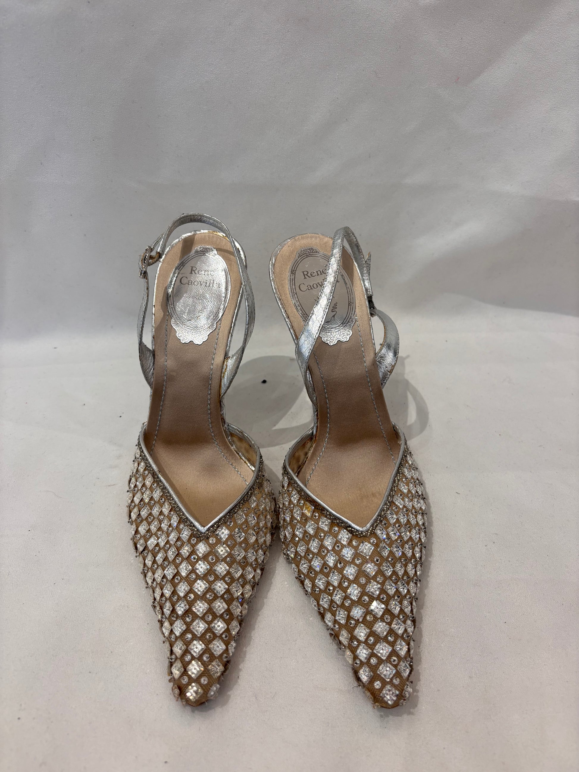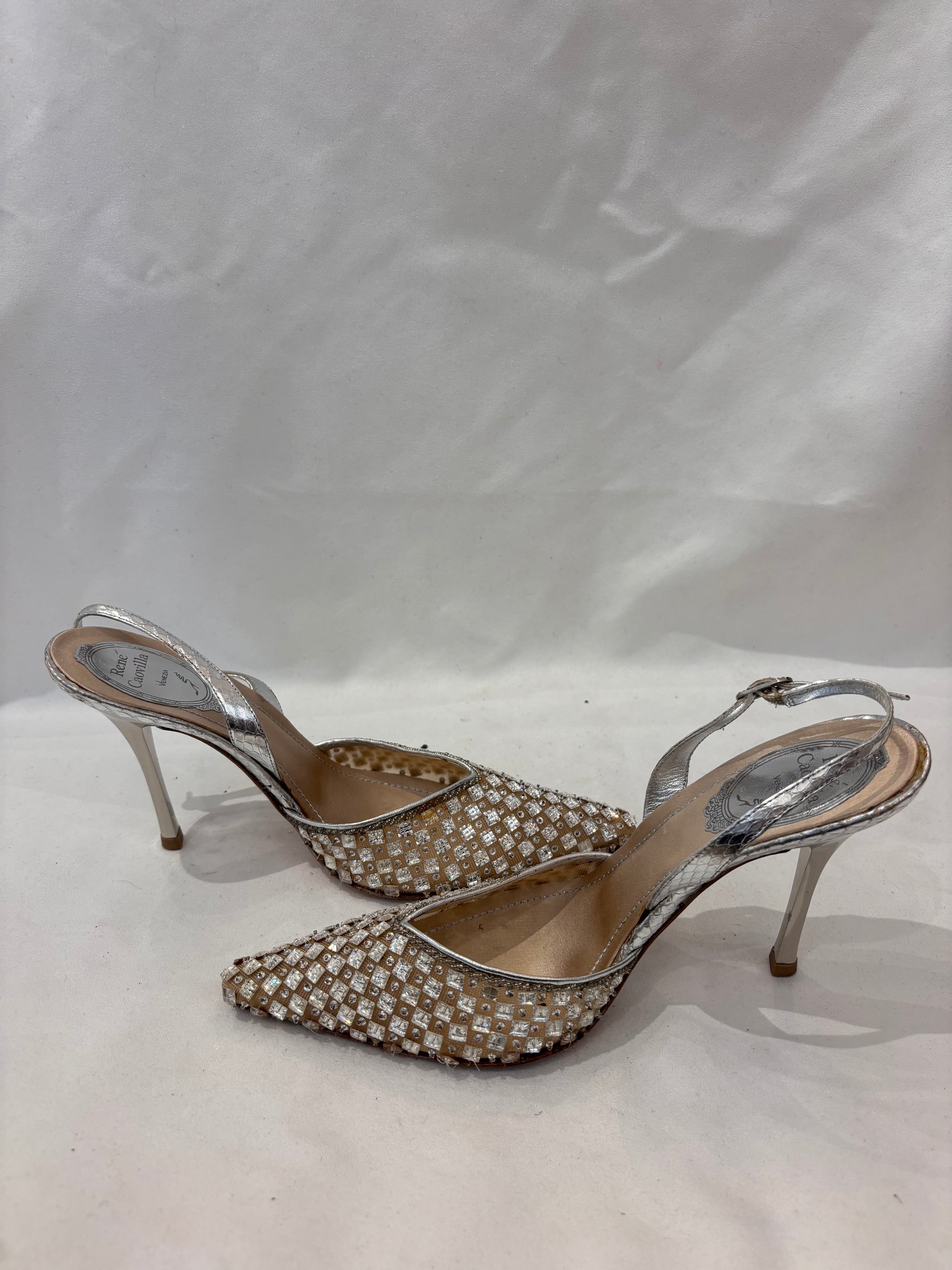 Rene Caovilla Silver Crystal Embroidered Mesh Slingback Pump Size 37