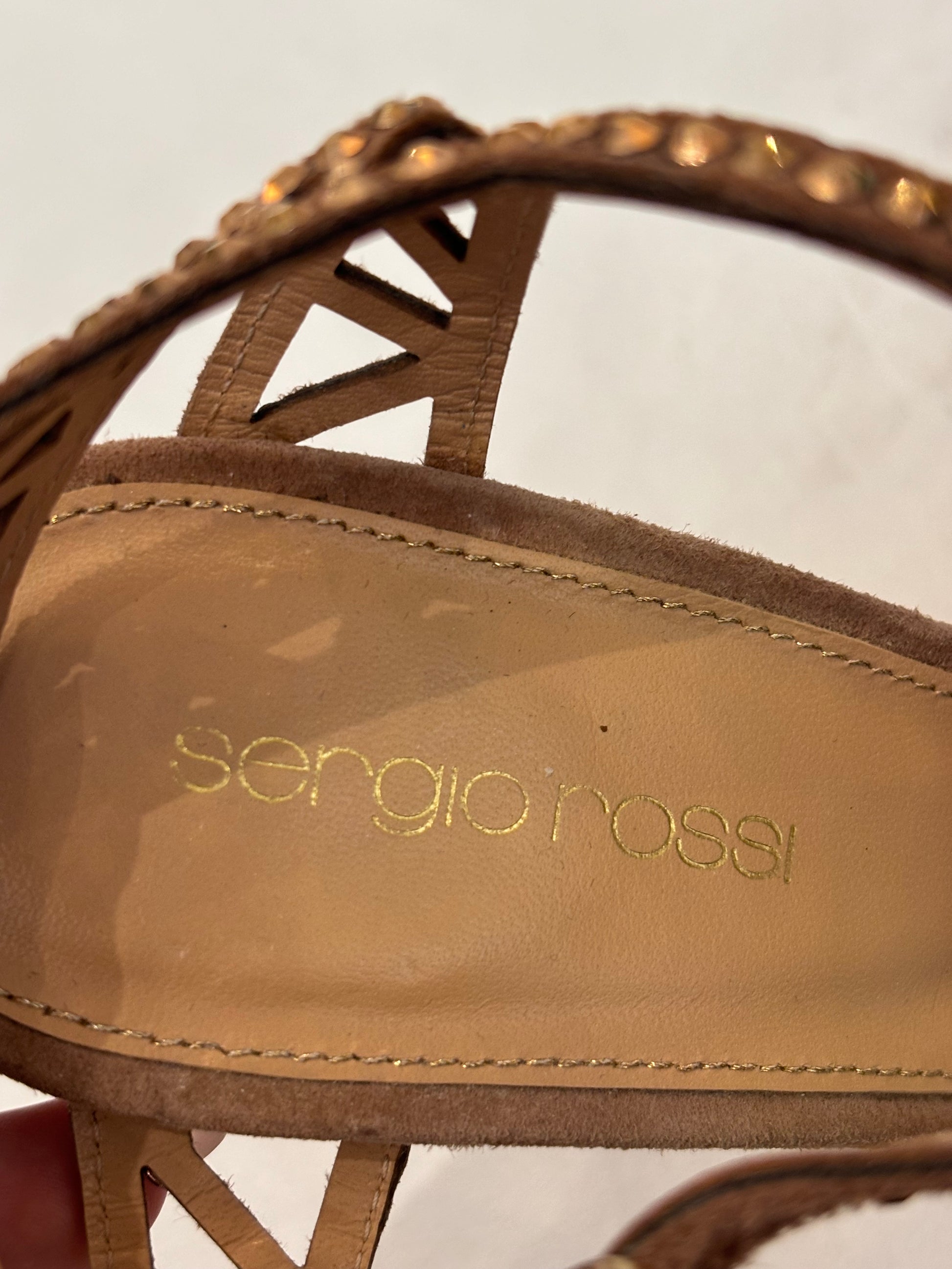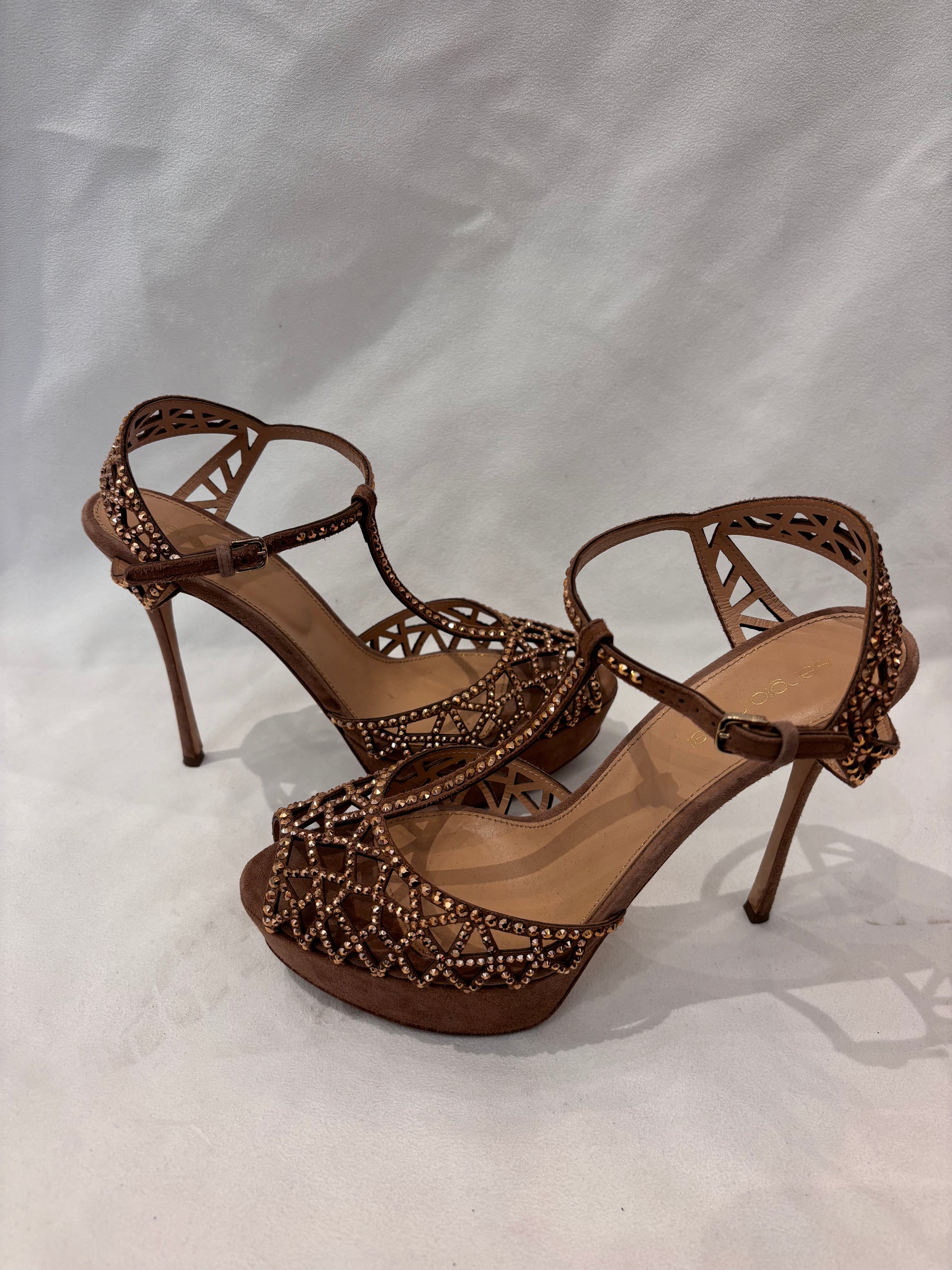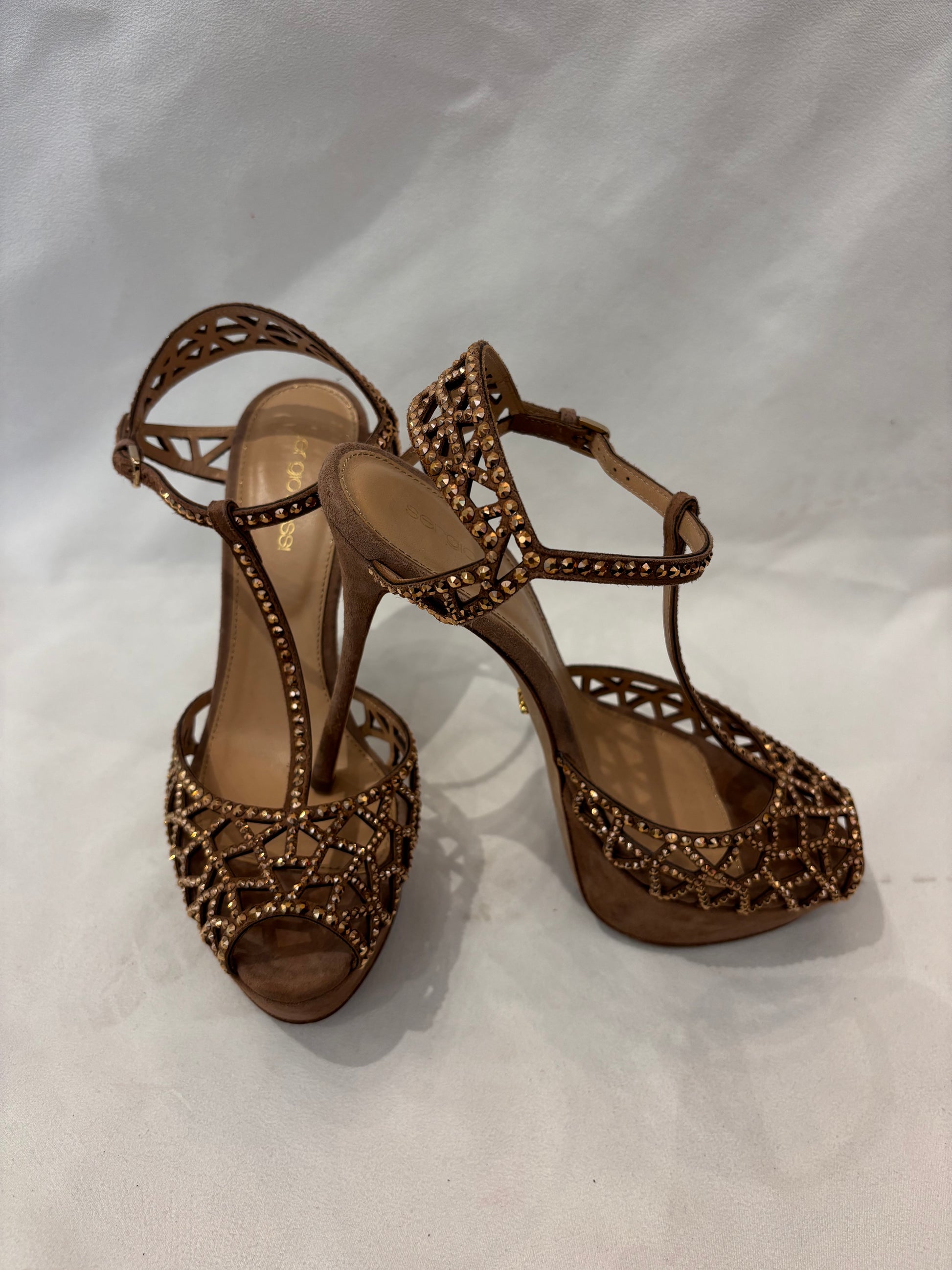 Sergio Rossi Bronze Suede Platform T Strap Pump with Crystals Size 38